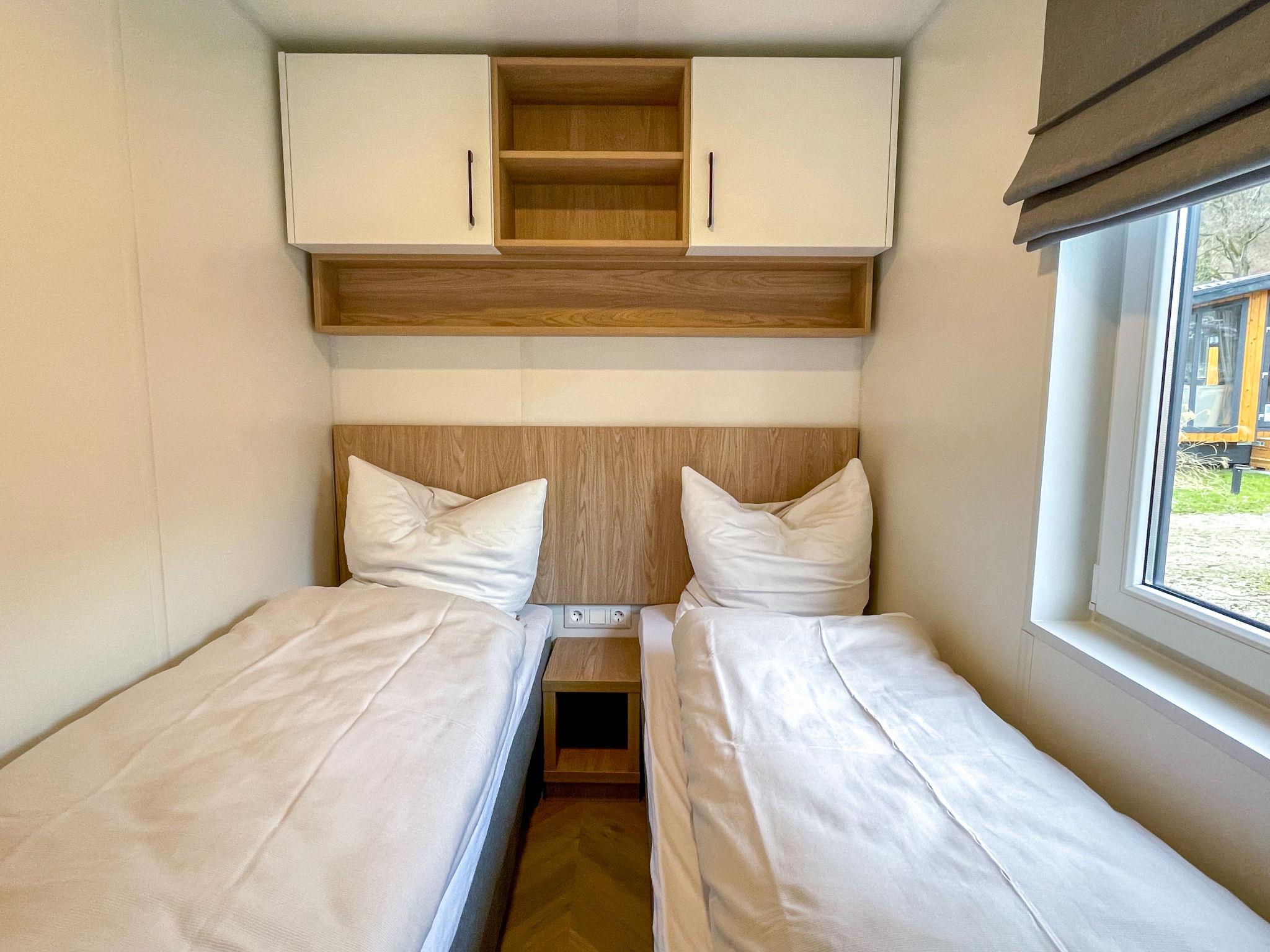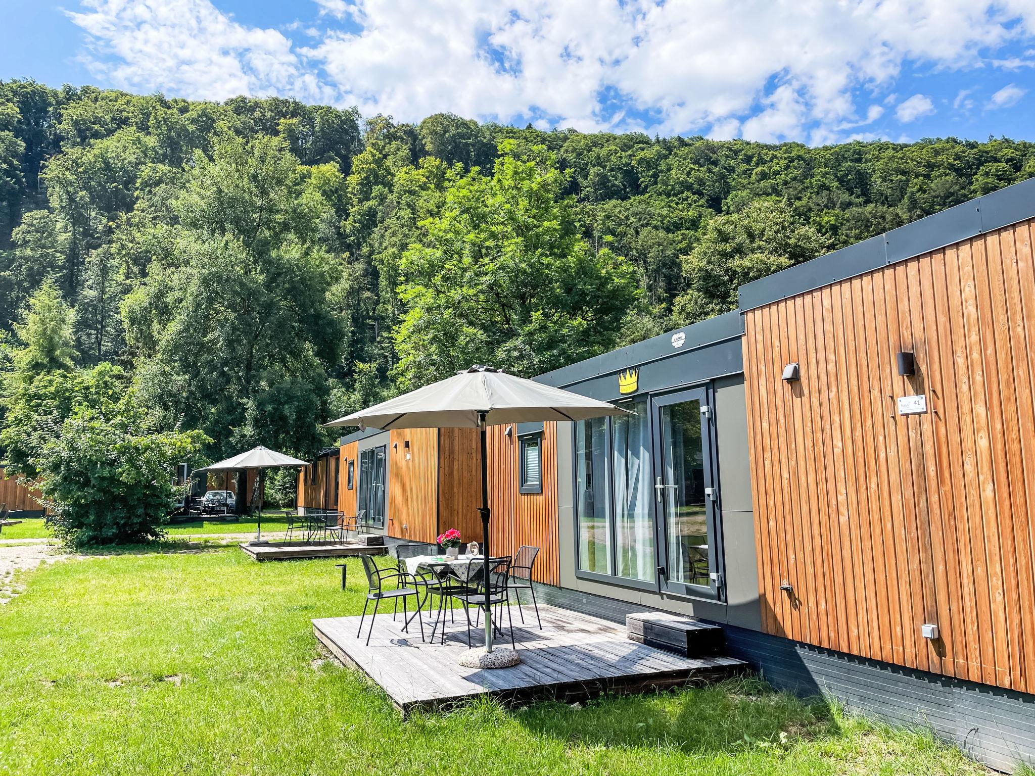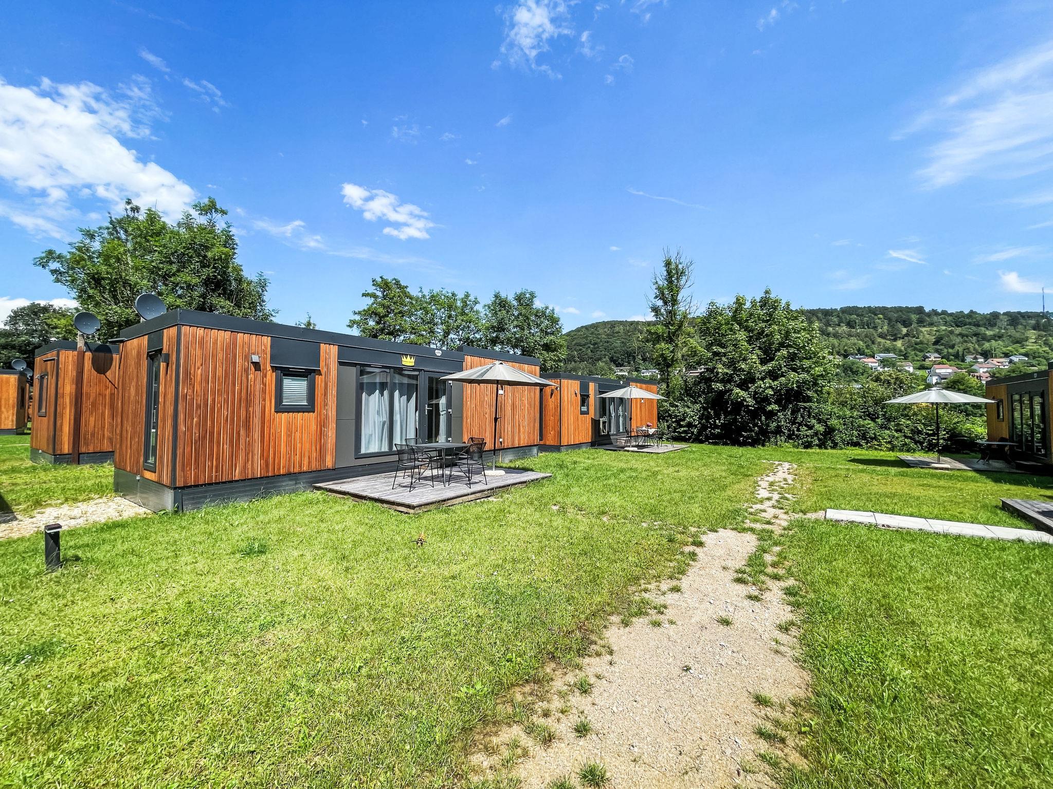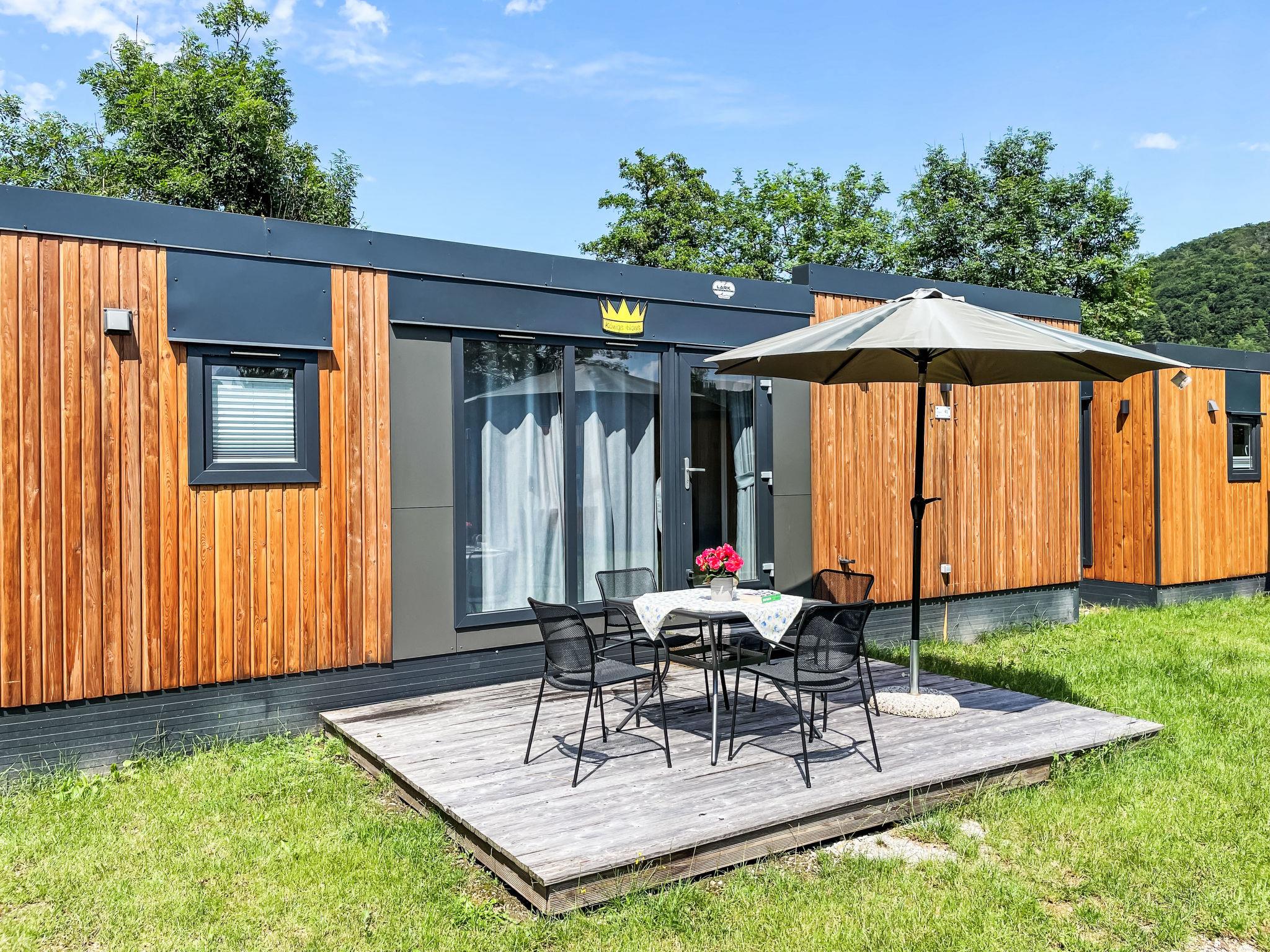 "Tiny Haus Königshaus", 3-room mobile home 32 m2. Cosy furnishings: living/sleeping room with (120 cm, length 170 cm), satellite TV. Exit to the terrace. 1 room with 1 french bed (140 cm, length 200 cm). 1 room with 2 beds (80 cm, length 200 cm). Open kitchen (4 ceramic glass hob hotplates, kettle, freezer, electric coffee machine). Shower/WC. Electric heating. Small terrace. Terrace furniture. Parking at 30 m. Please note: non-smoking house.