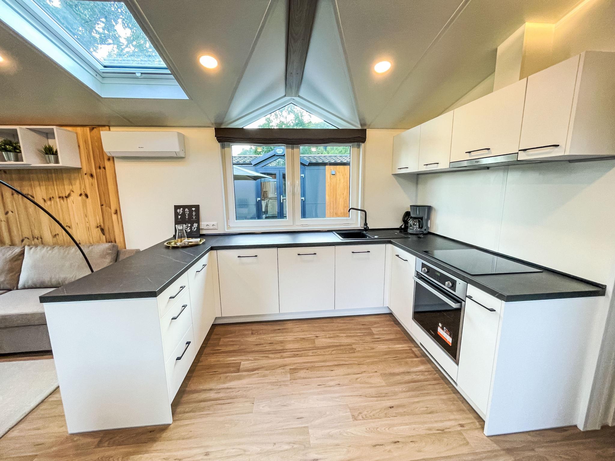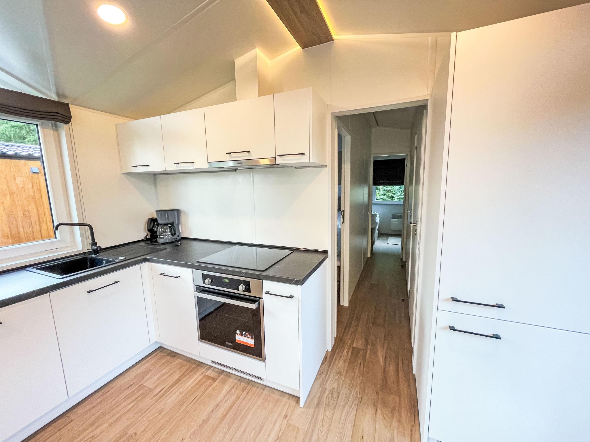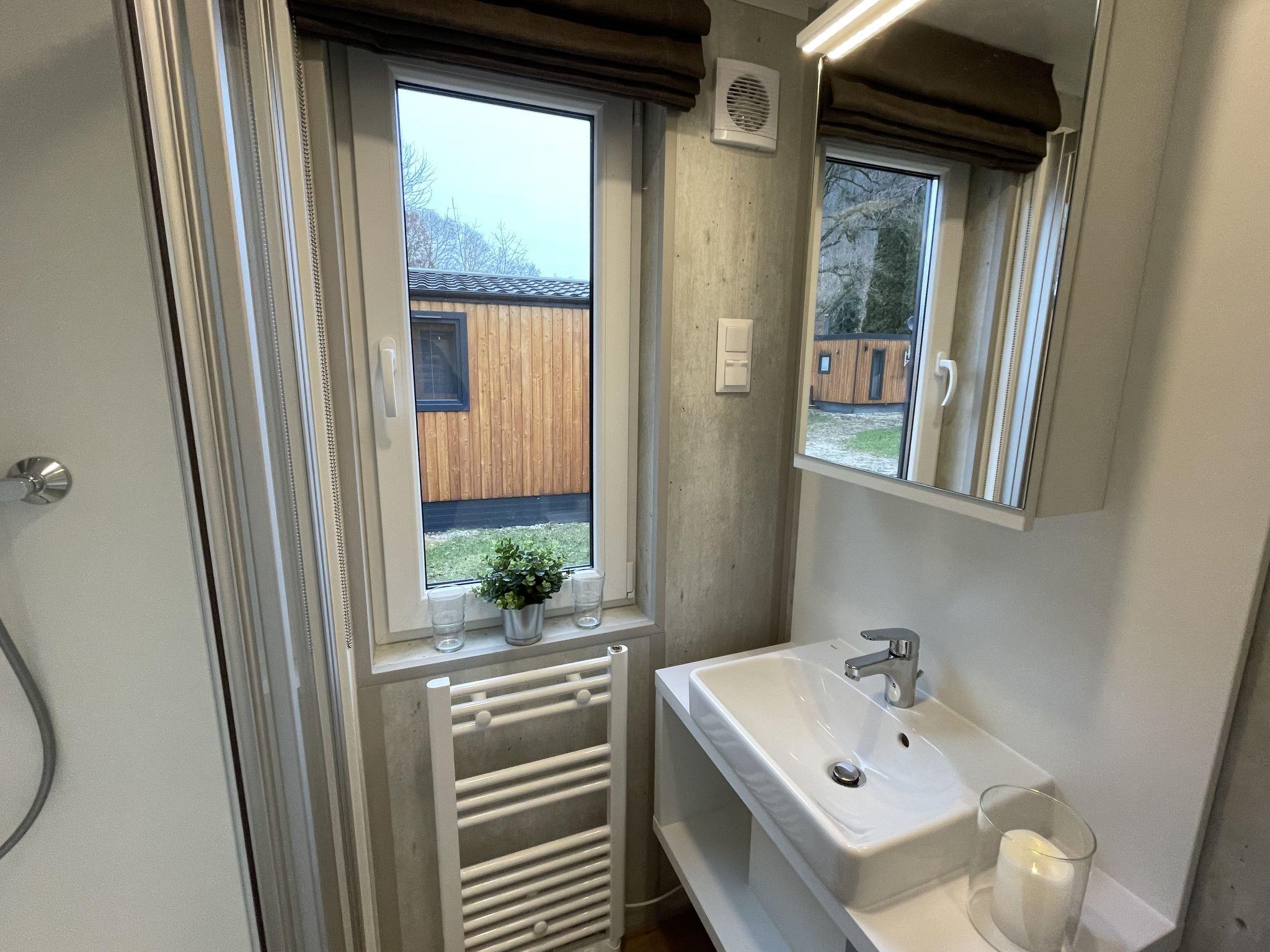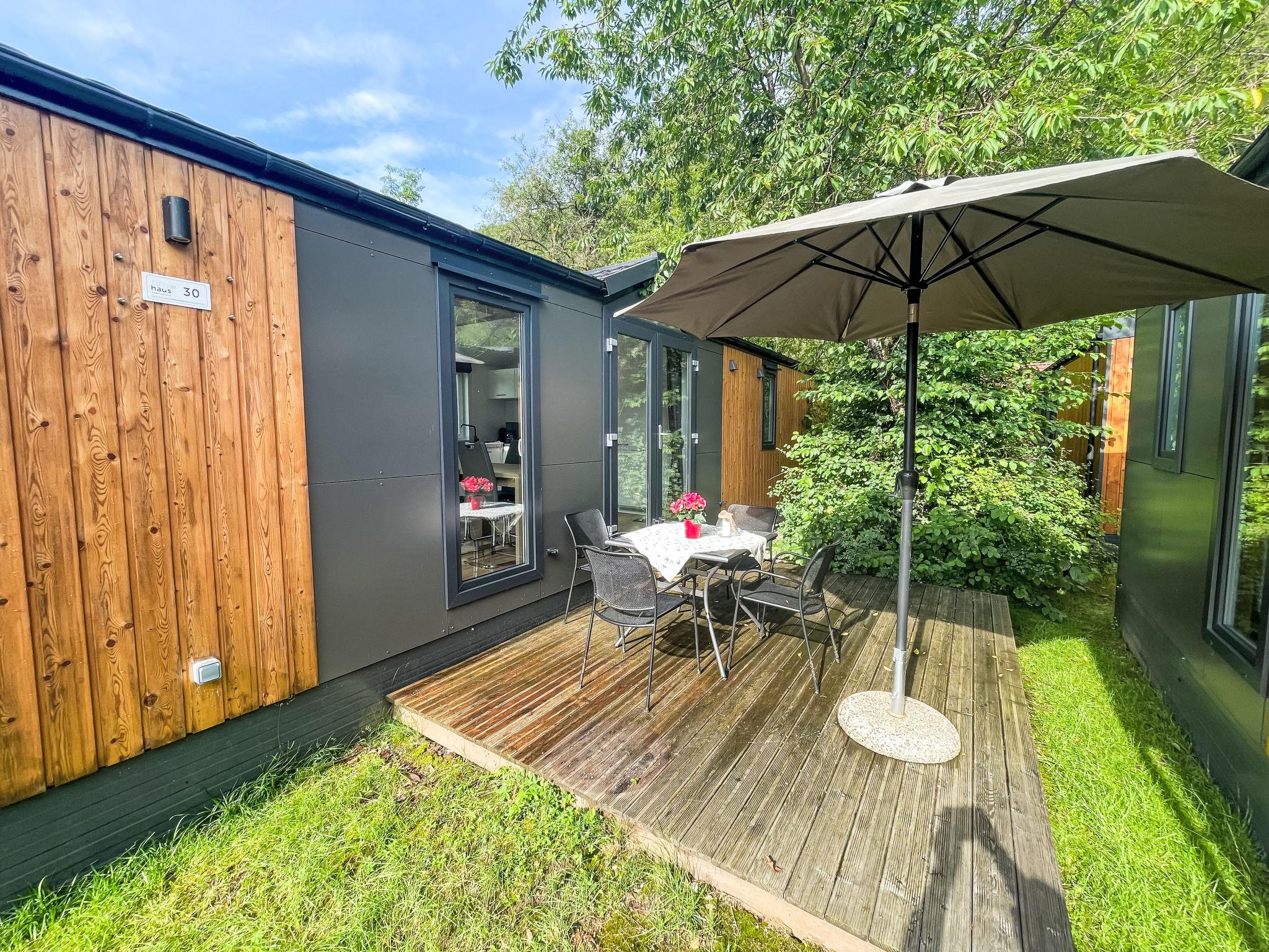 "Tiny Haus Josef", 3-room mobile home 48 m2. Comfortable furnishings: living/sleeping room with 1 double sofabed (160 cm, length 200 cm), Scandinavian wood stove (only for decoration), satellite TV and air conditioning. Exit to the terrace. 1 room with 1 french bed (160 cm, length 200 cm). 1 room with 2 beds (80 cm, length 200 cm). Open kitchen (oven, dishwasher, 4 ceramic glass hob hotplates, kettle, freezer, electric coffee machine). Shower, sep. WC. Small terrace. Terrace furniture. Facilities: washing machine, dryer. Parking at 50 m. Please note: non-smokers only.