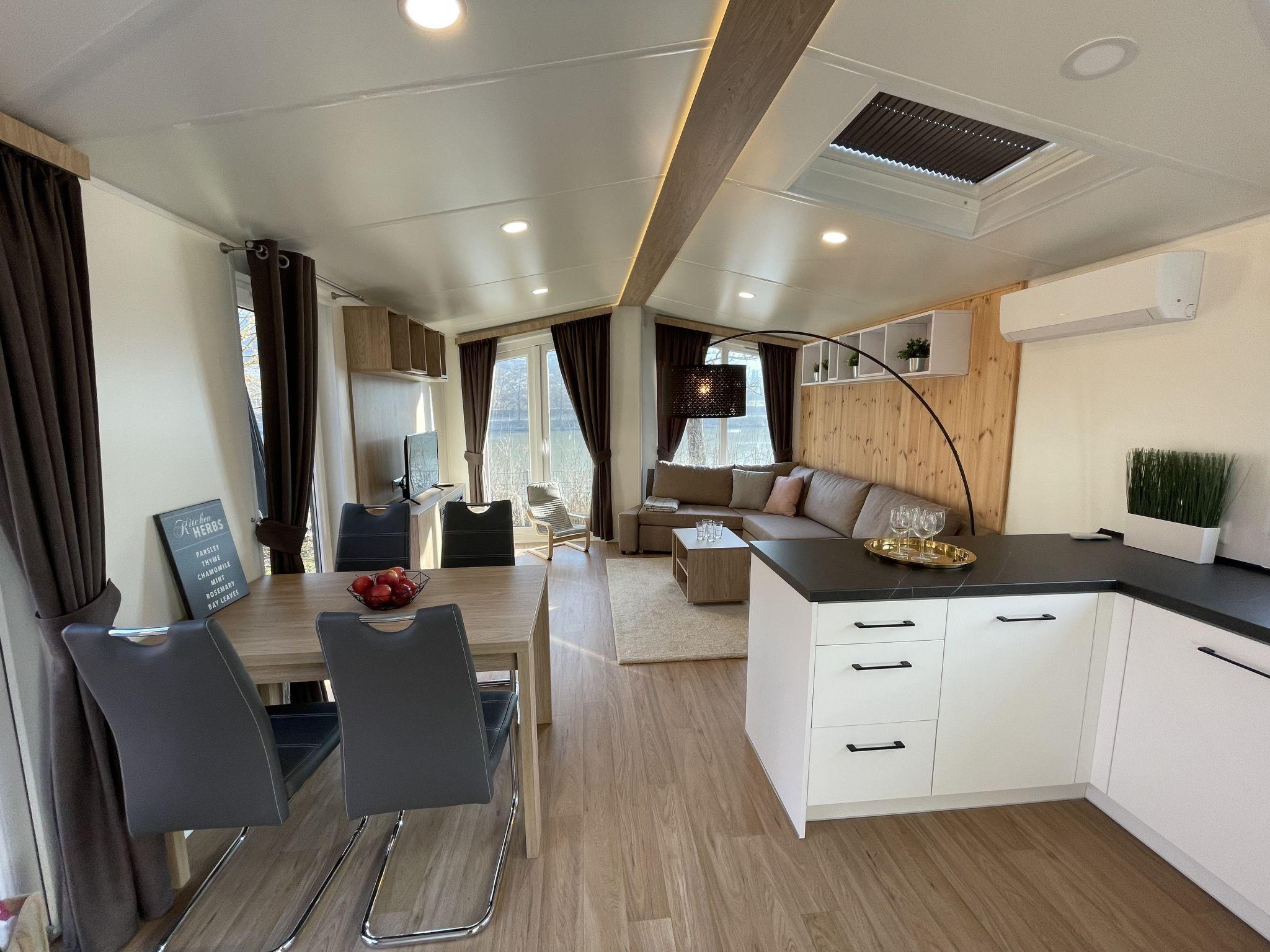 "Tiny Haus Donaublick", 3-room mobile home 48 m2. Comfortable furnishings: living/sleeping room with 1 double sofabed (160 cm, length 200 cm), Scandinavian wood stove (only for decoration), satellite TV and air conditioning. Exit to the terrace. 1 room with 1 french bed (160 cm, length 200 cm). 1 room with 2 beds (80 cm, length 200 cm). Open kitchen (oven, dishwasher, 4 ceramic glass hob hotplates, kettle, freezer, electric coffee machine). Shower, sep. WC. Small terrace. Terrace furniture. Facilities: washing machine, dryer. Parking at the house. Please note: non-smokers only.