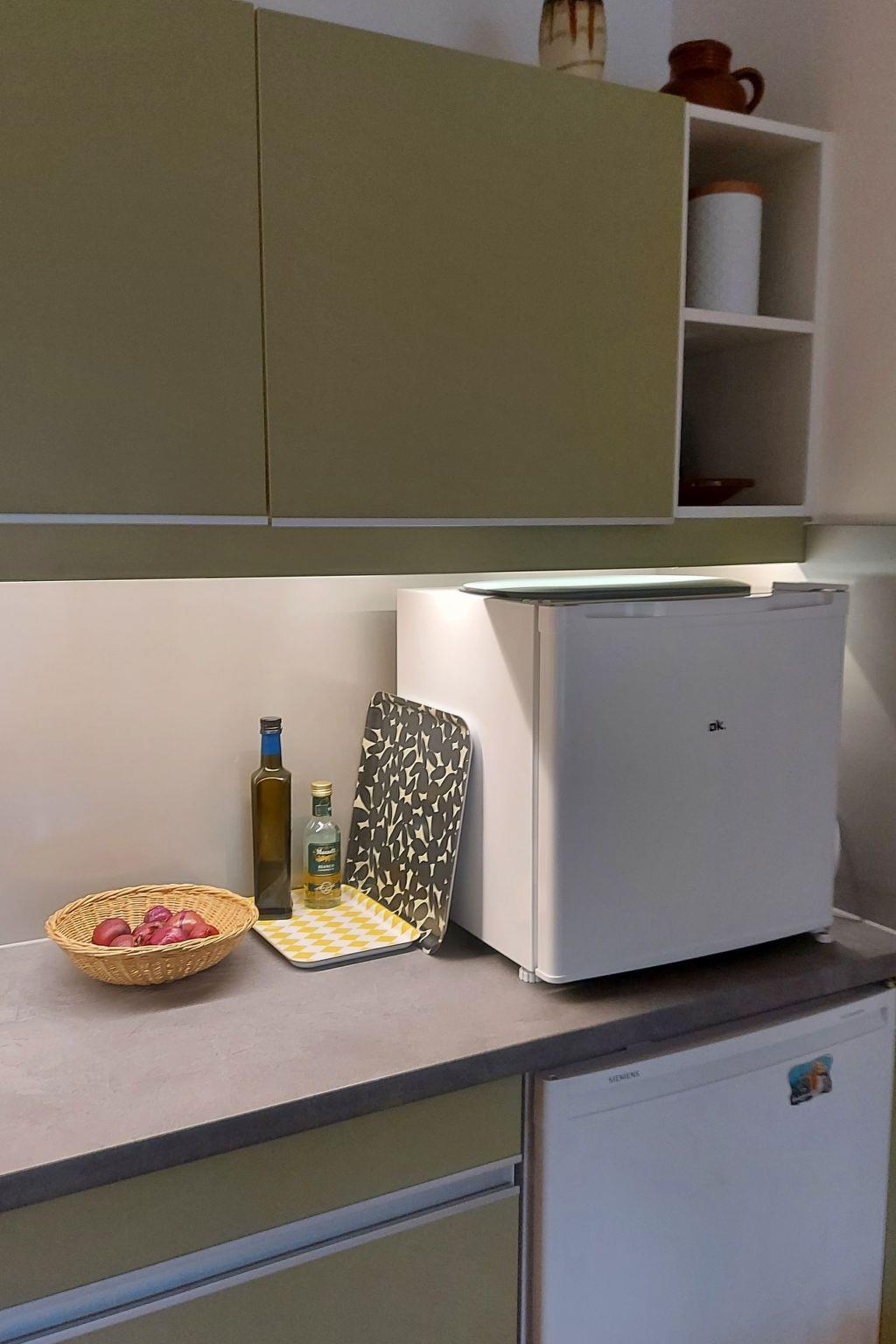 The 65 m² flat is suitable for up to 4 people and, thanks to its location on the 4th floor of a residential complex and the large floor-to-ceiling window fronts, has a wonderful unobstructed view of the natural surroundings. We have renovated and redesigned the flat with great attention to detail, combining new elements with original features while respecting the architecture from the 1970s. The centrepiece of the flat is the open-plan living and dining area (for 4 people) with kitchen. From here and the covered, furnished balcony, you have a wonderful unobstructed view across the meadow to the neighbouring forest. There is a sofa bed, a TV with DVD player and two armchairs with a coffee table in the living area. There is a double bed in a cosy room alcove. The living area flows into the dining area and kitchen. There is a separate bedroom with a double bed, which is bright and has its own covered balcony. The comfortable bathroom has a modern design and is equipped with a rain shower, washbasin, WC, heated towel rail and Internet radio.