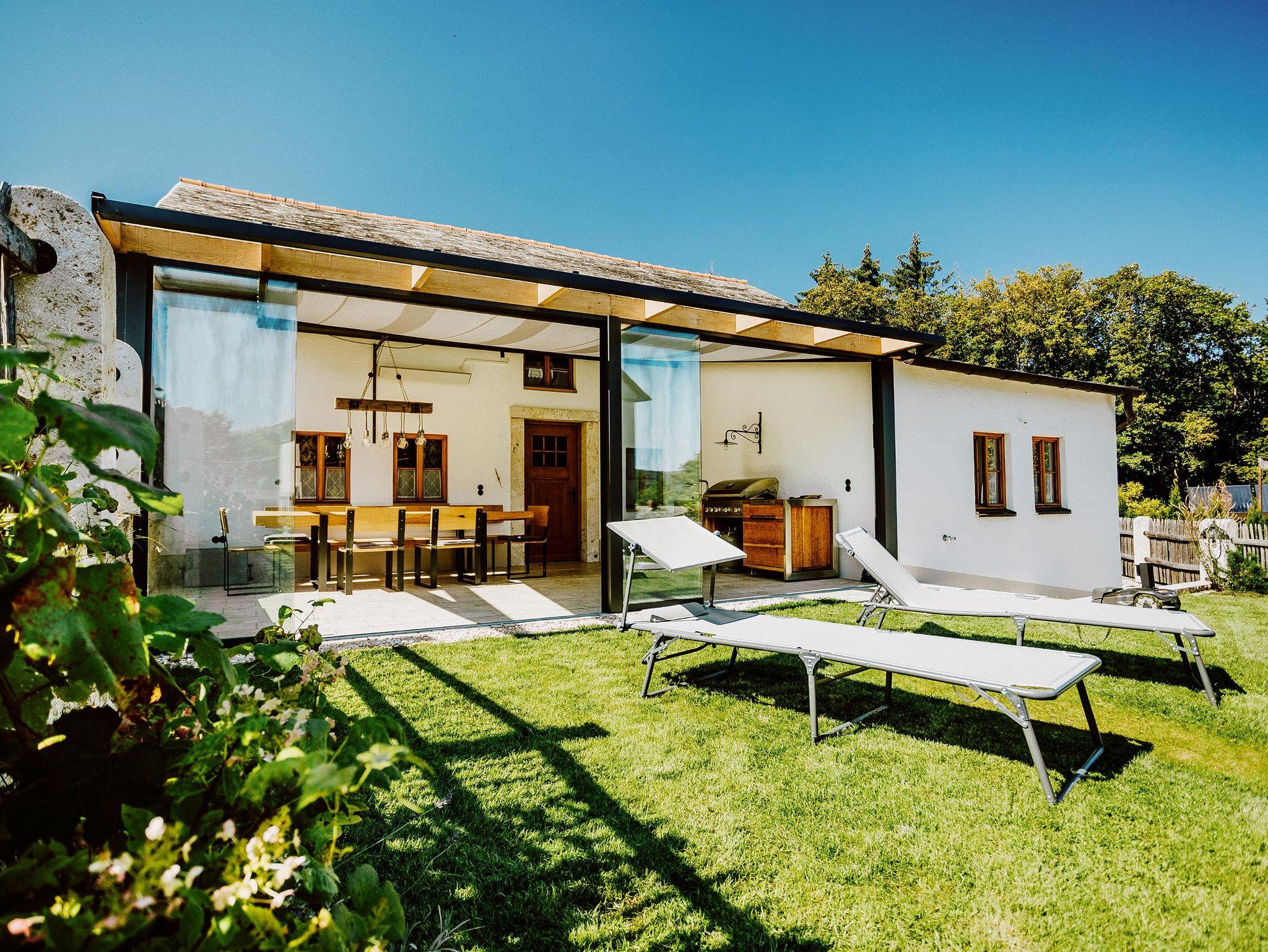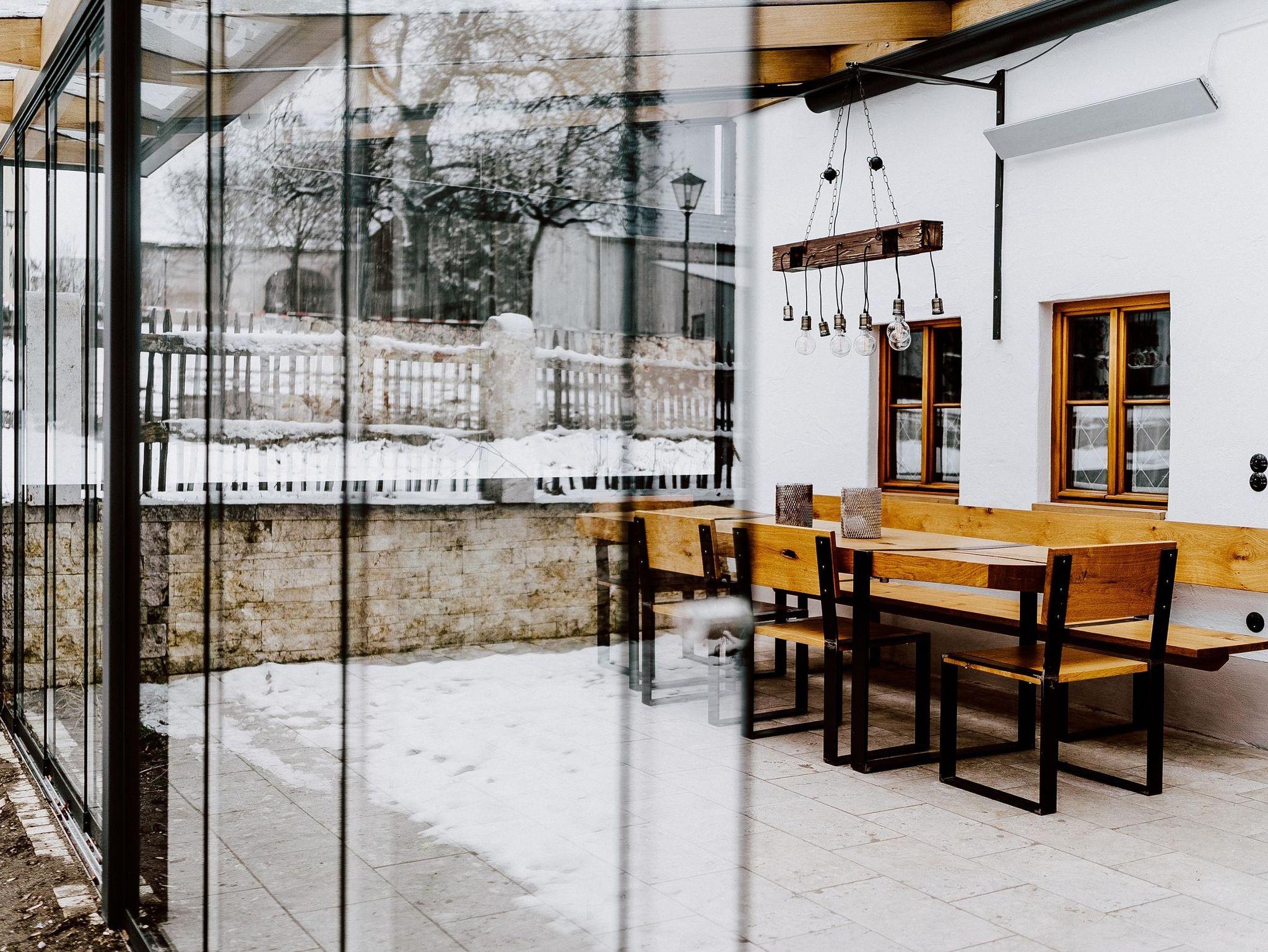 Damit sie die Abendstunden lange genießen können, ist die Terrasse mit einem Deckenheizer und Glas-Schiebe-Elemente ausgestattet.