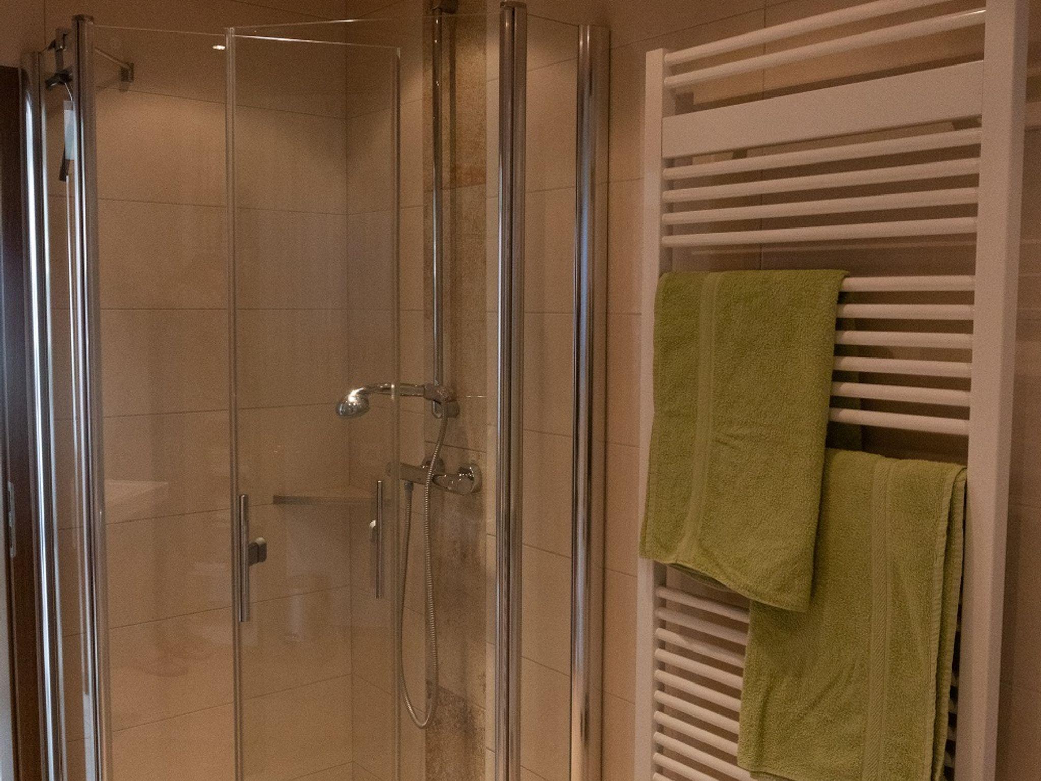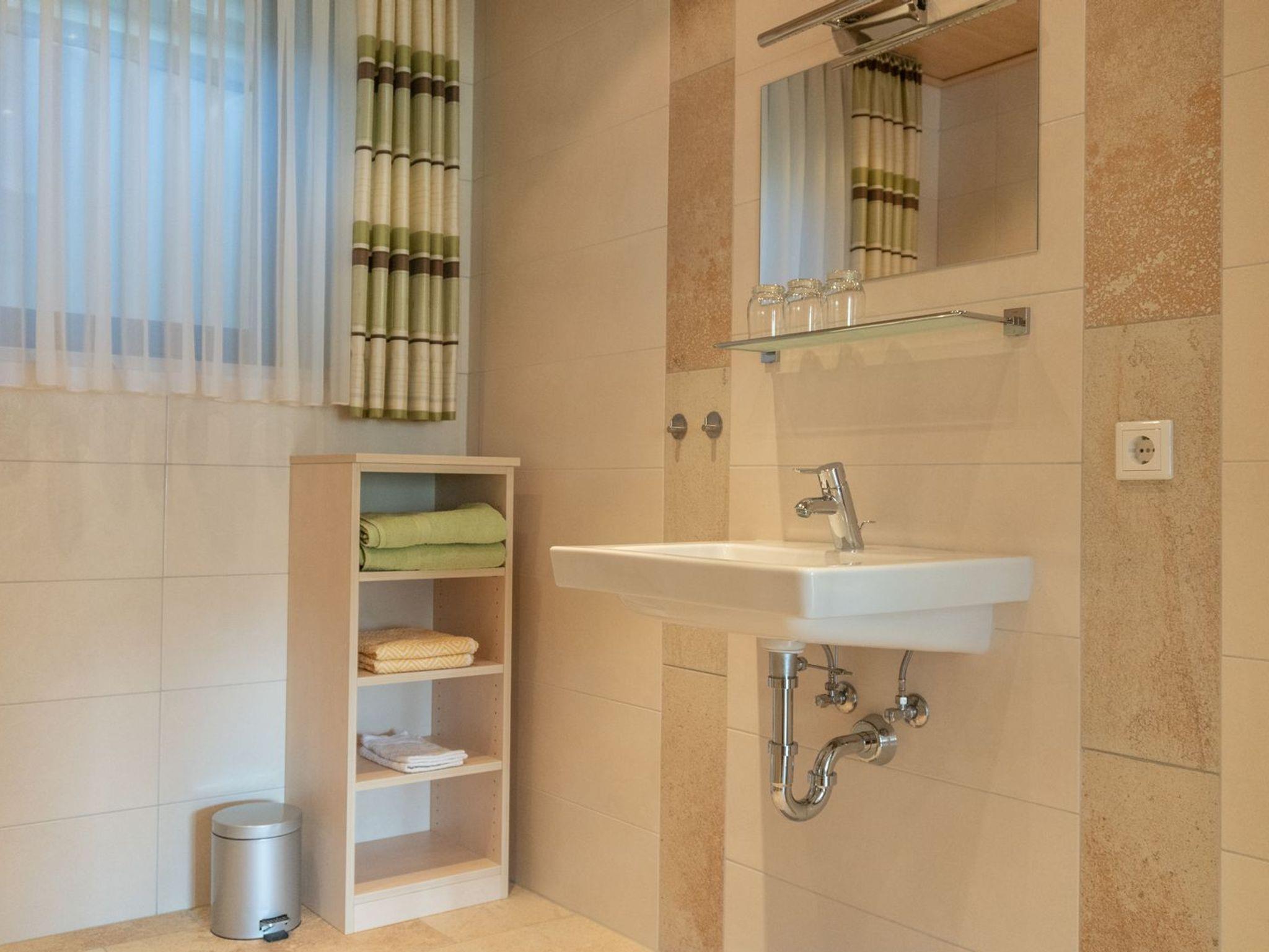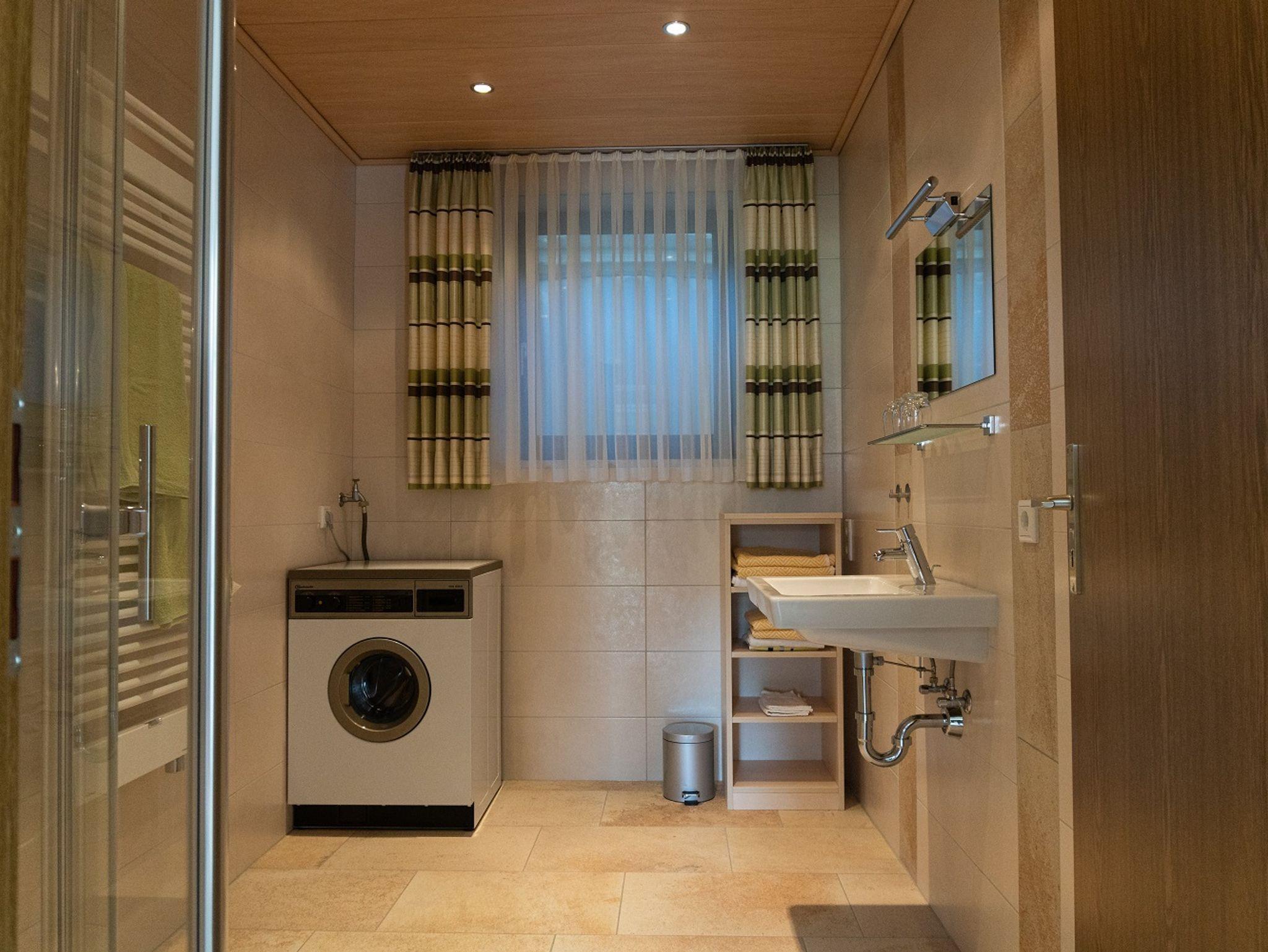 Die sanitäre Einrichtung umfasst eine ebenerdige Dusche mit Waschbecken, Waschmaschine und separatem WC.