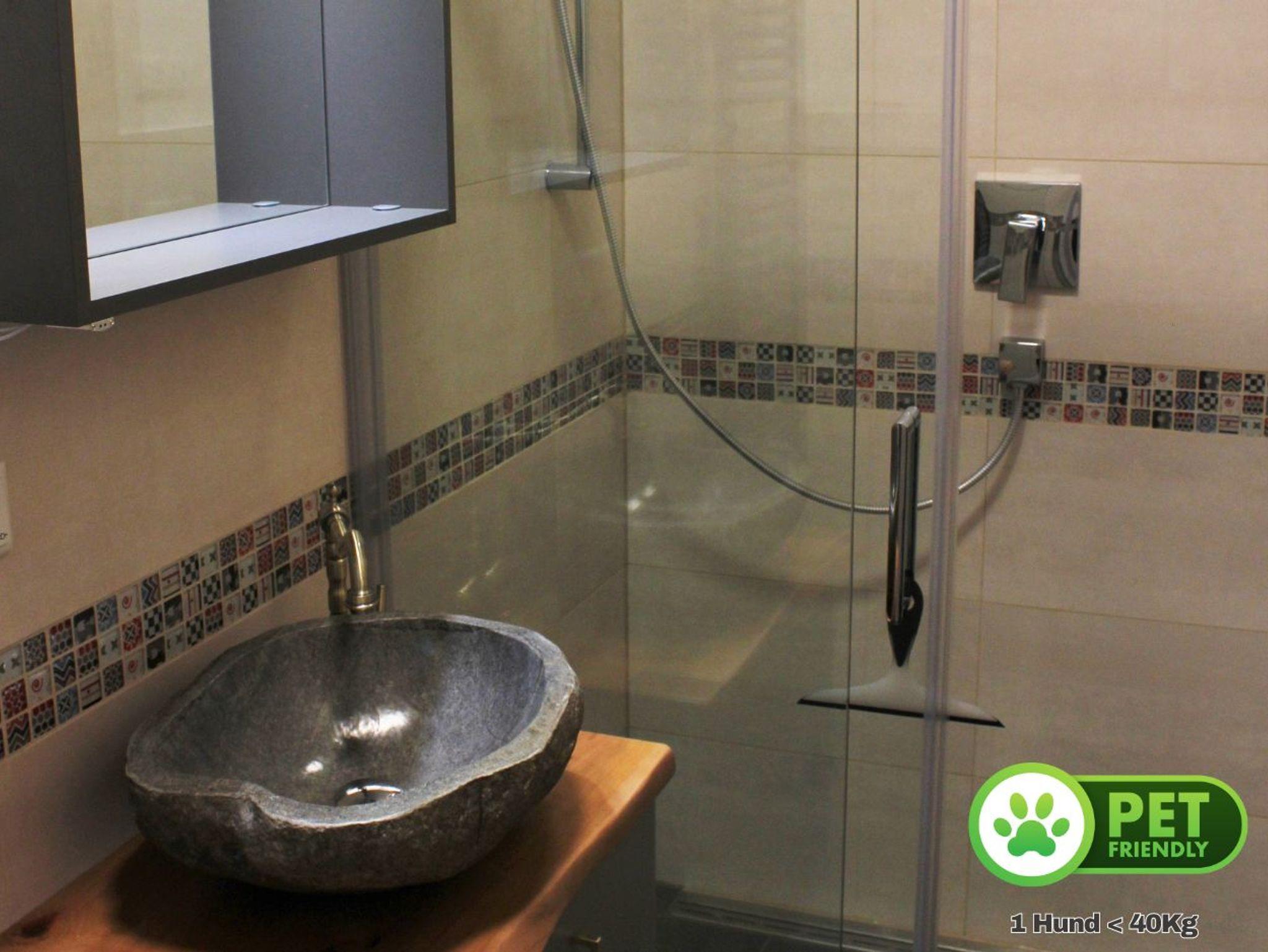 Das Bad verfügt über eine bodenebene Dusche, Waschtisch und Spiegelschrank sowie Handtuchtrockner und WC. Handtücher und Bettwäsche sind im Mietpreis inklusive, gegen einen Aufpreis ist eine Wechselgarnitur zubuchbar.