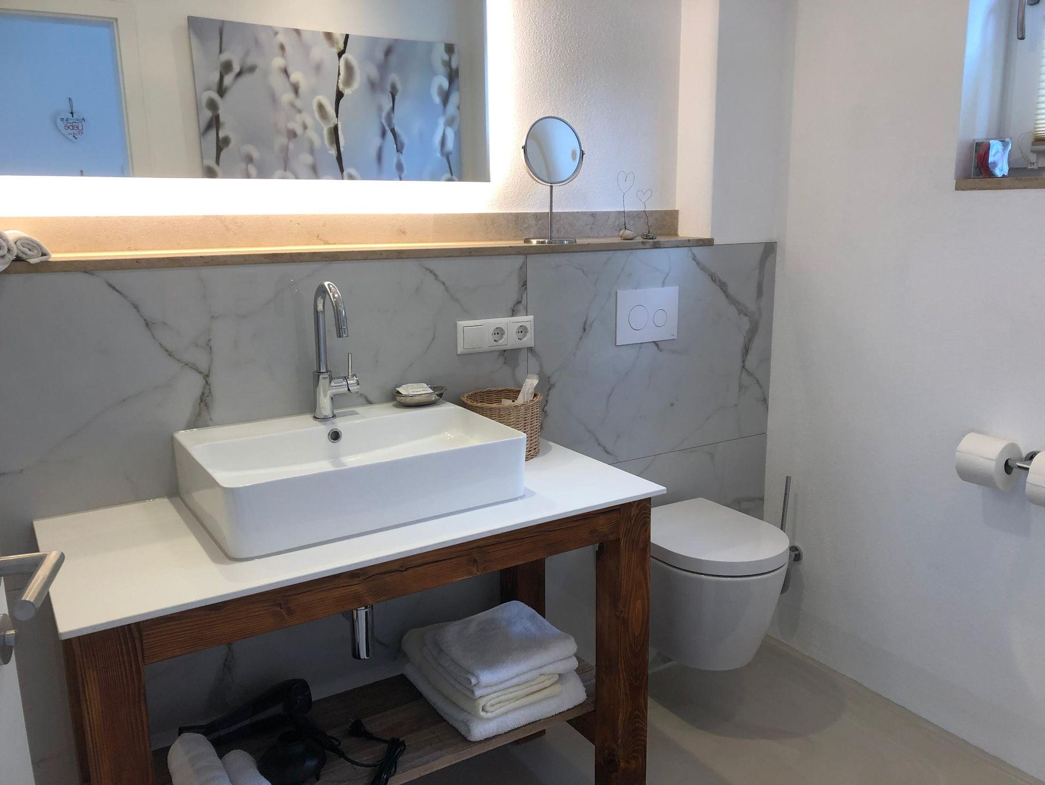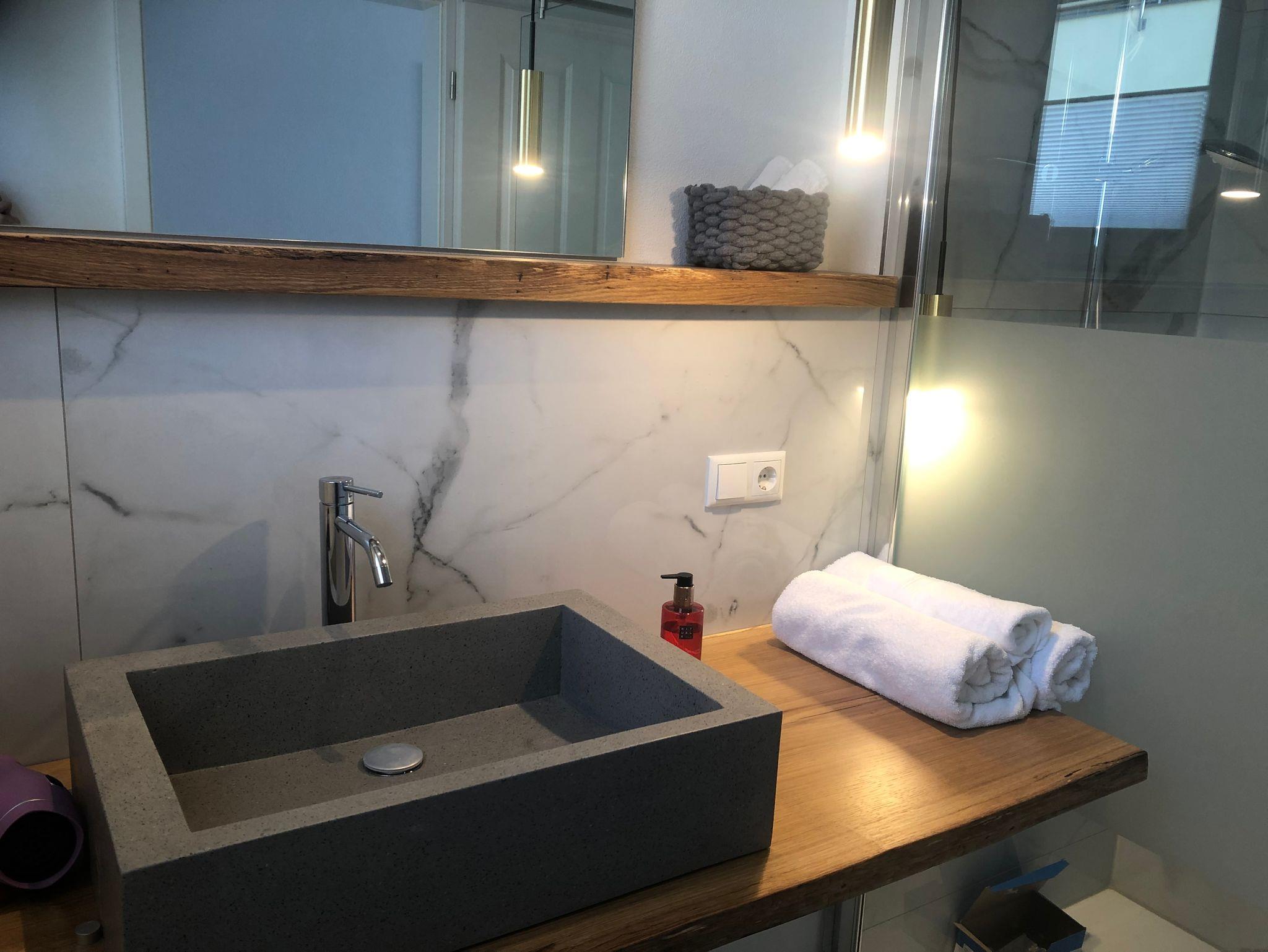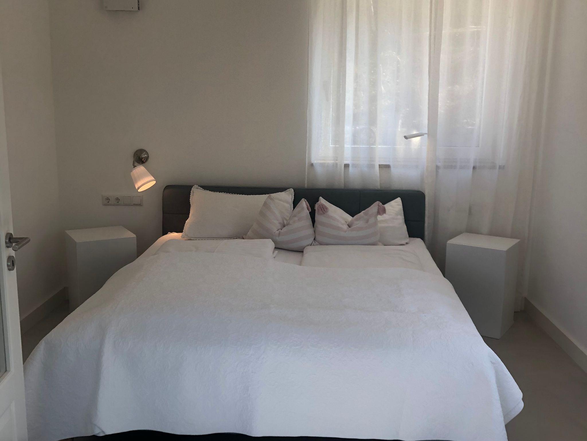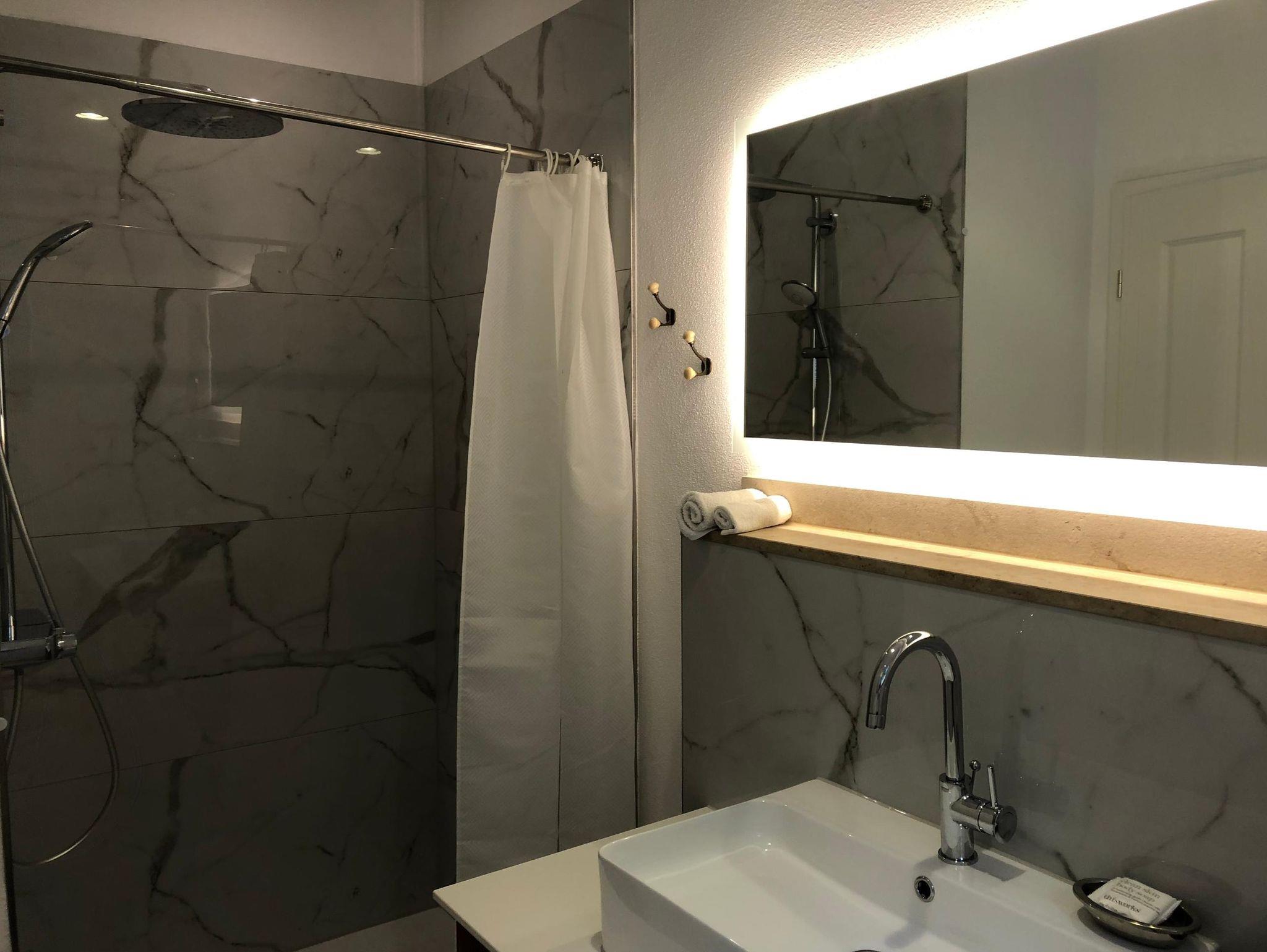 Das Schlafzimmer ist hell und ruhig. Getrennt durch eine Türe befindet sich das geschmackvoll eingerichtete Badezimmer mit geräumiger bodengleicher Dusche.