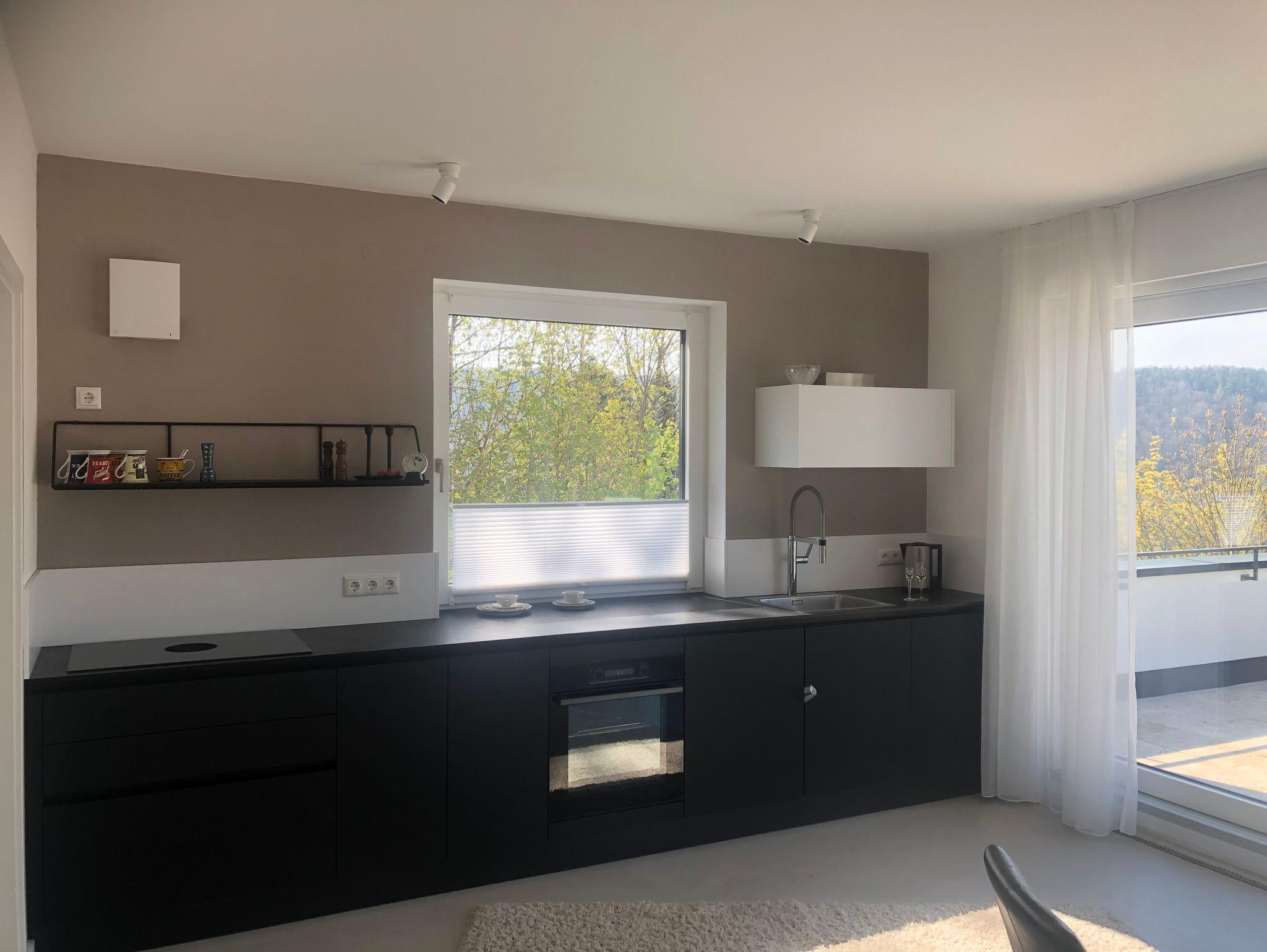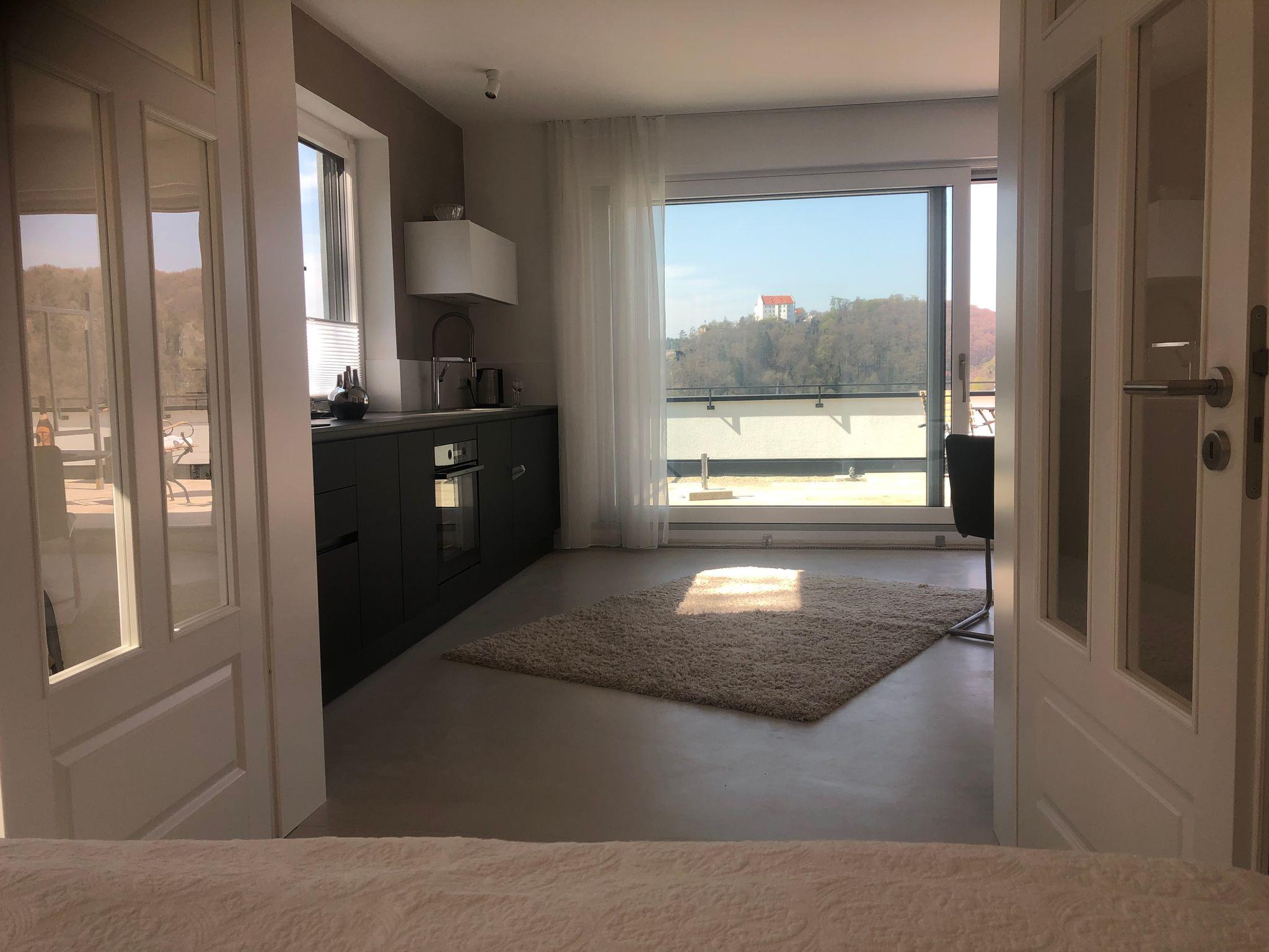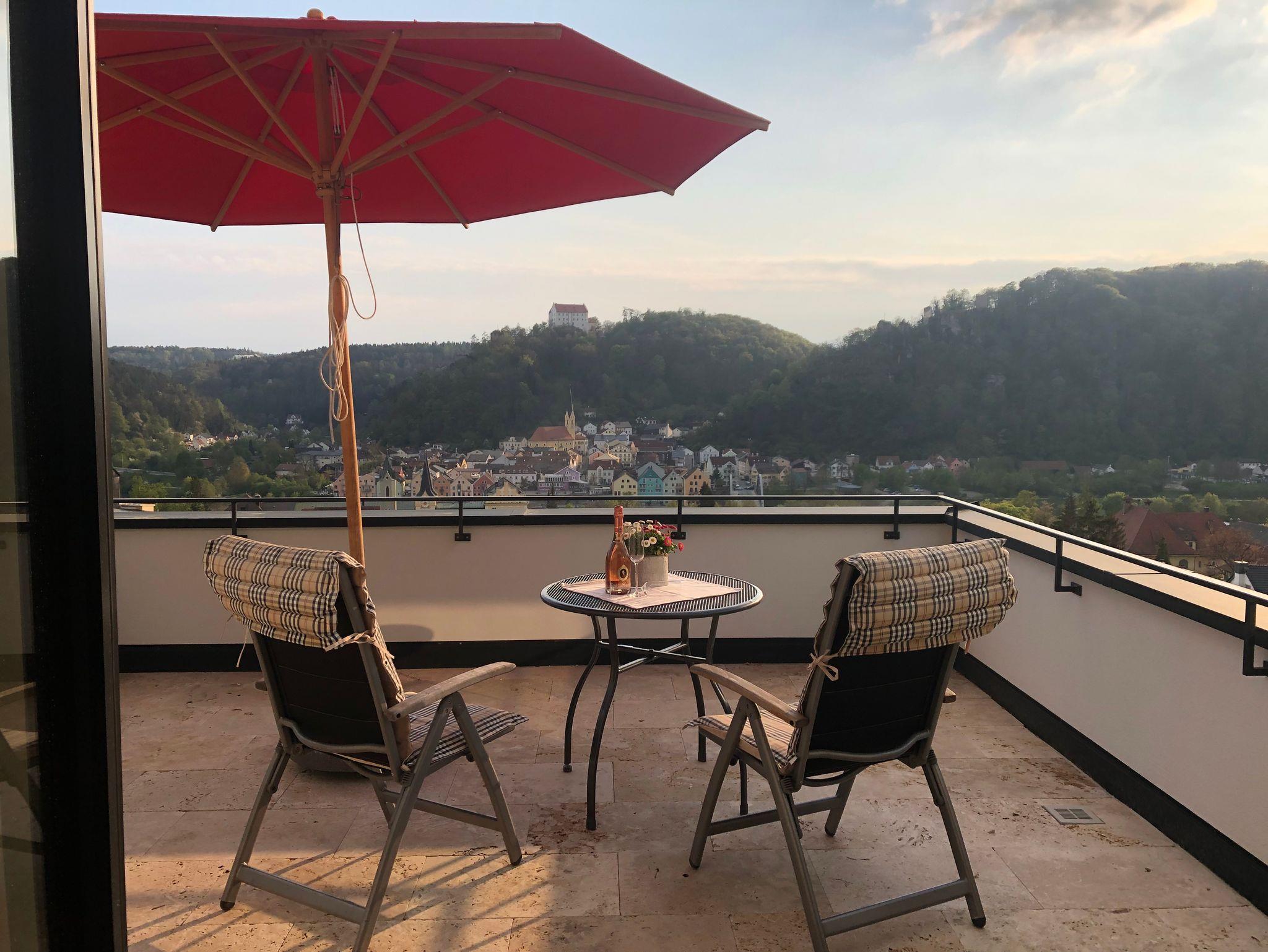 Eine neue Ferienwohnung mit herrlichen Blick auf Riedenburg. Die Wohnung bietet ein wunderschönes Ambiente: Fugenloser Boden, hohe Räume, Natursteinfliesen und ausgewähltes Mobiliar. Ein geräumiger Wohn-und Essraum bildet das Herzstück dieser wunderbaren Ferienwohnung.