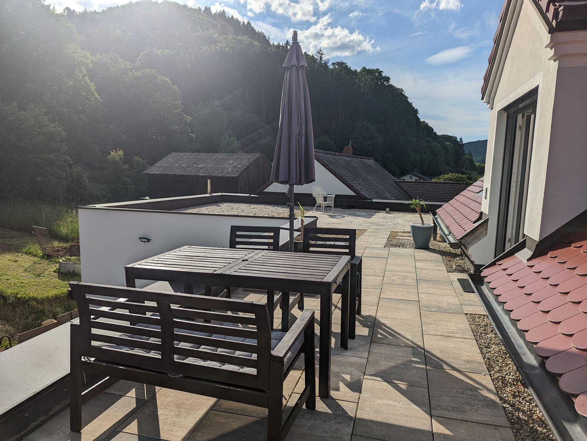 Eine Terrasse mit Gartenmöbeln und Sonnenschirm ist vorhanden.