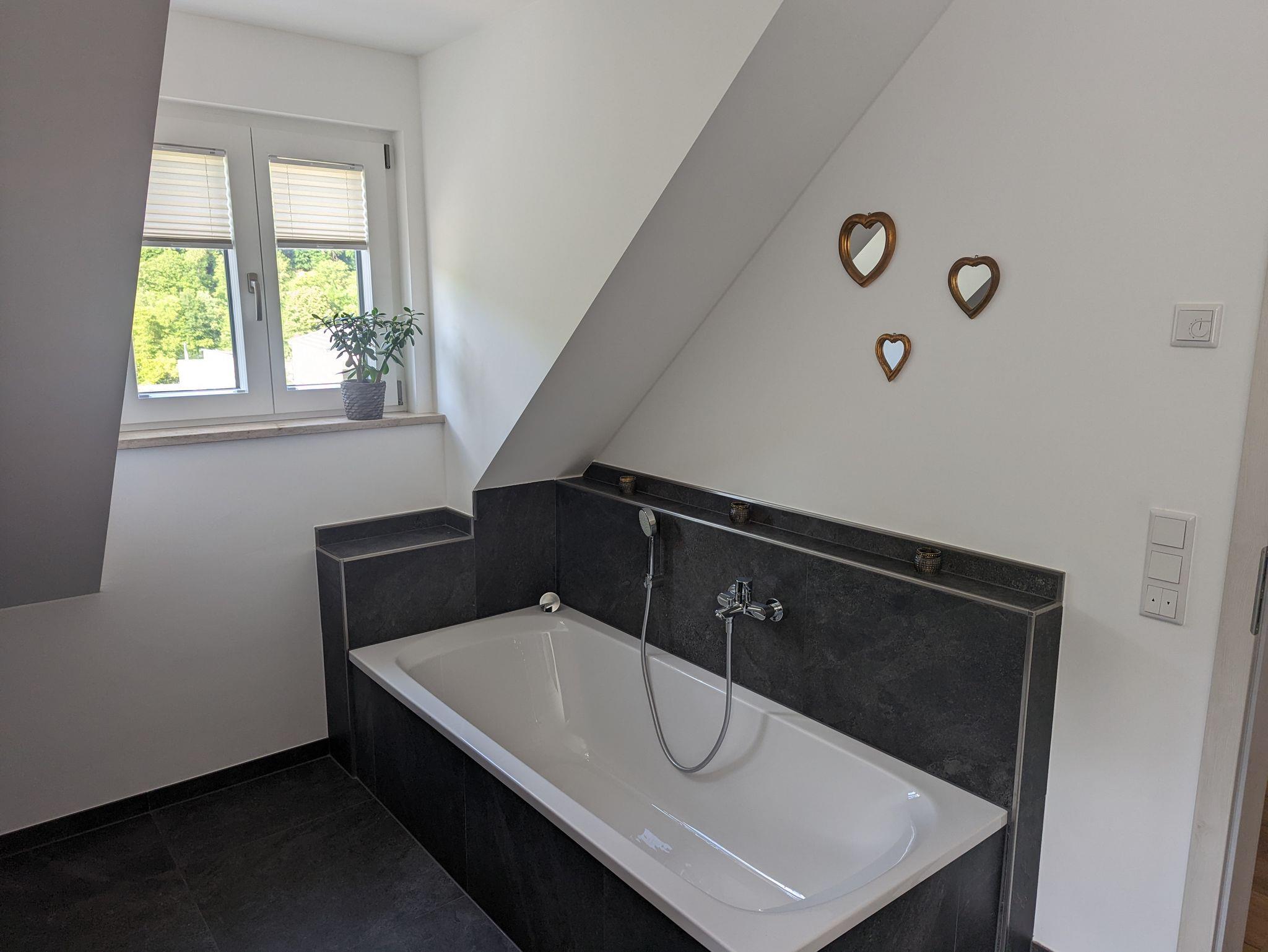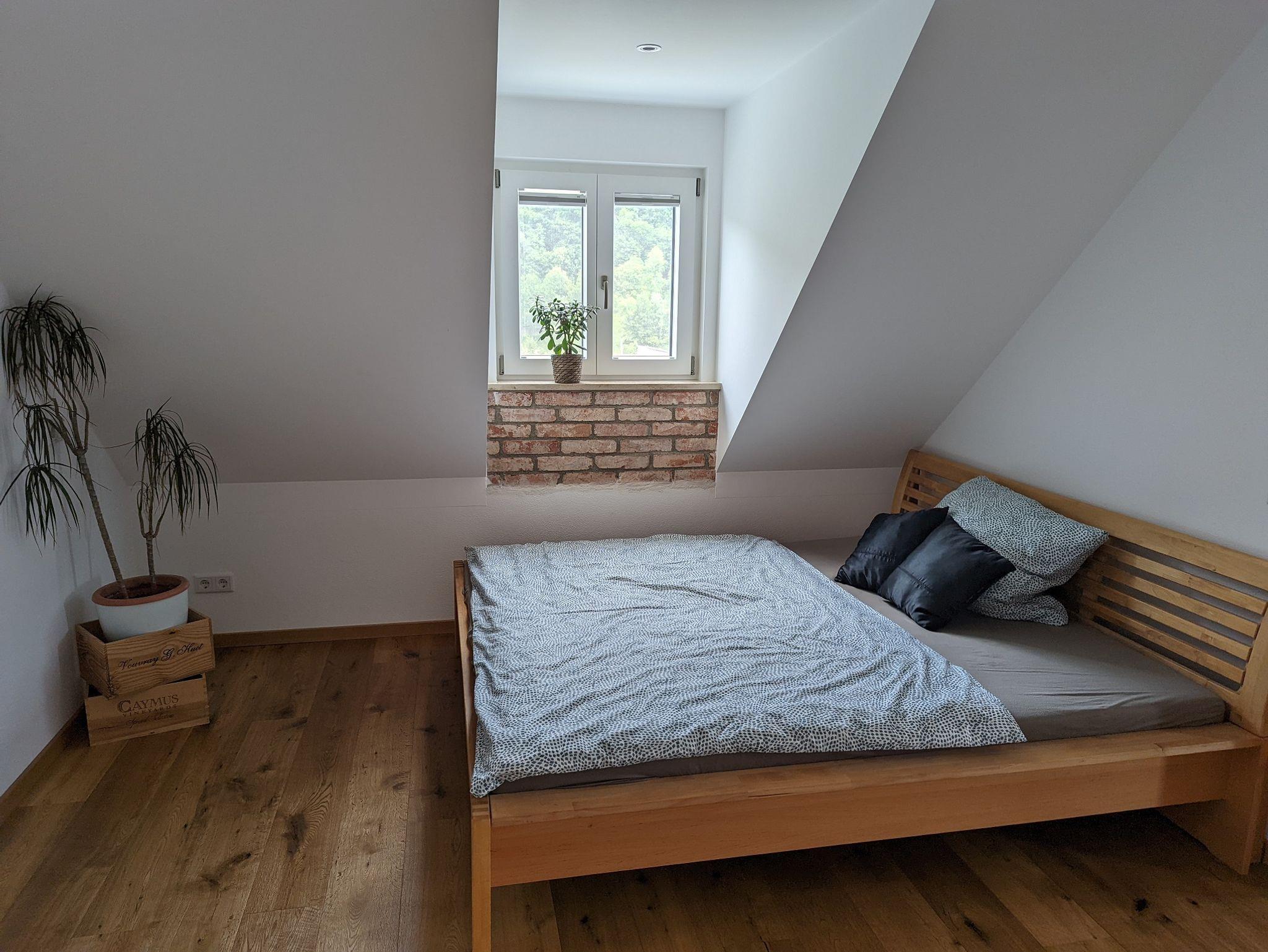 Ein Schlafzimmer mit Doppelbett sowie einem weiteren halb offenem Zimmer mit Doppelbett und einem Badezimmer mit Regendusche, WC und Badewanne sowie Waschmaschine. Der mögliche fünfte Schlafplatz ist unsere ausziehbare Schlafcouch im Wohnbereich.