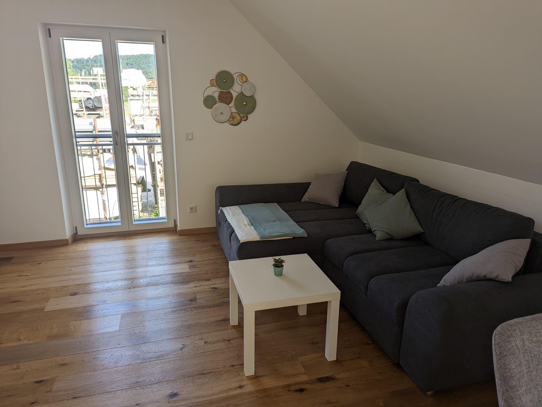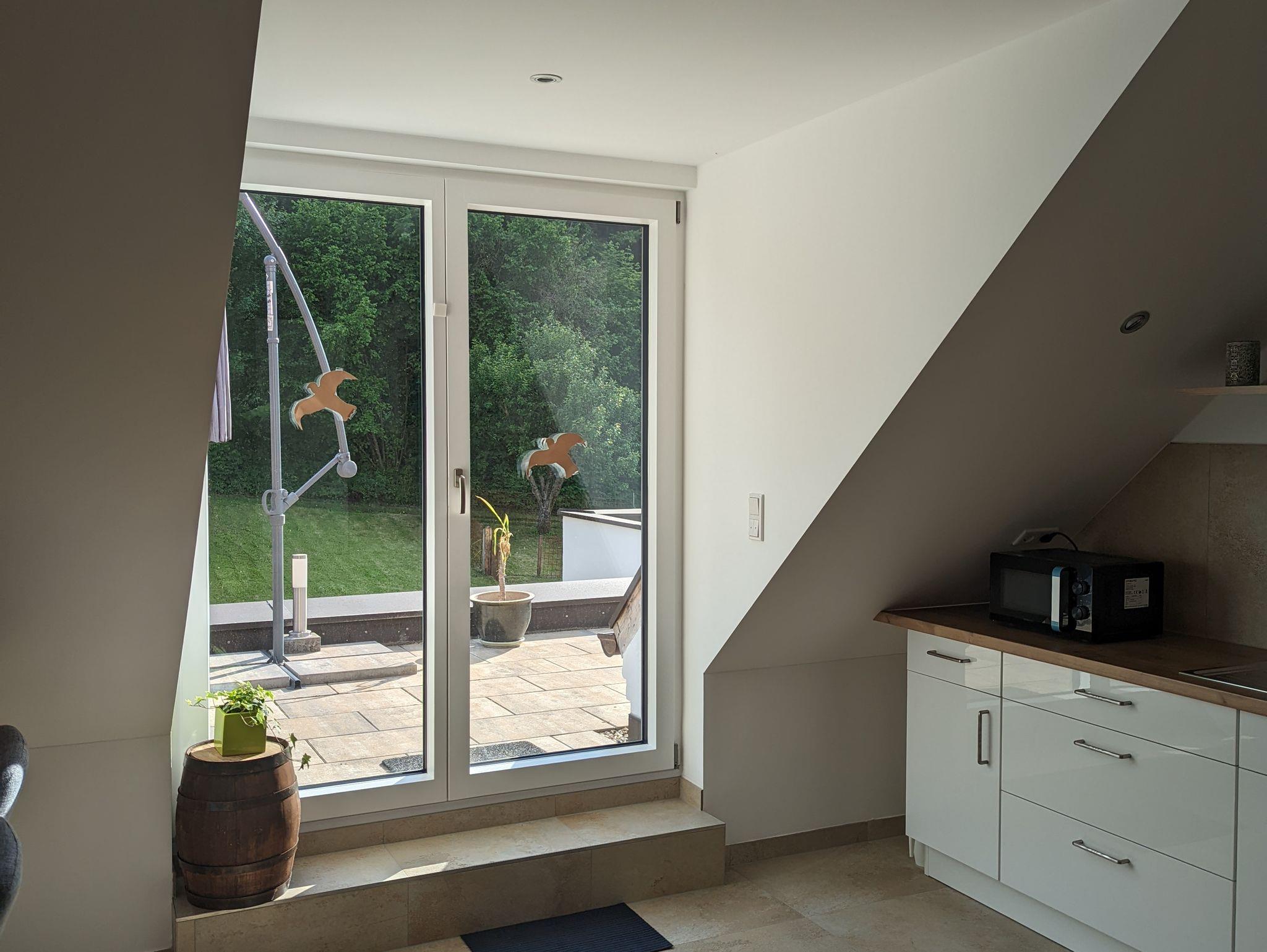 Die schöne moderne Ferienwohnung bietet Platz für bis zu 5 Personen, sie besteht aus einem Wohn/Essbereich mit offener Küche (voll Ausgestattet mit Backofen, Dunstabzug, Kaffeemaschine, Wasserkocher Eierkocher und Mikrowelle etc.) und Essplatz für 5 Personen mit großzügiger Couch und Zugang zur Dachterrasse.