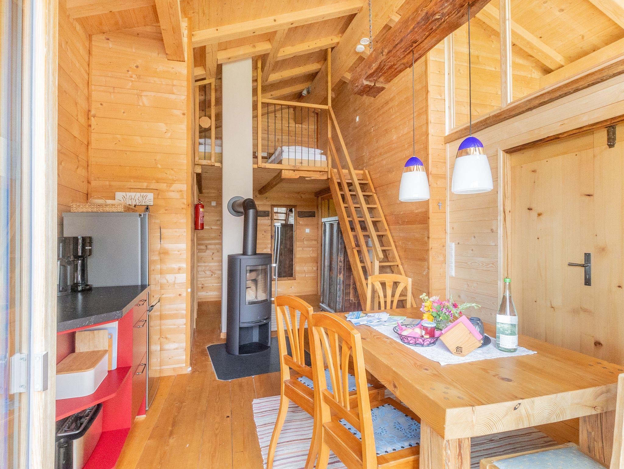 Ein schöner Holztisch lädt zum Frühstück ein oder Sie genießen das Frühstück auf dem Balkon, mit Aussicht auf die Kirche und die Berge.