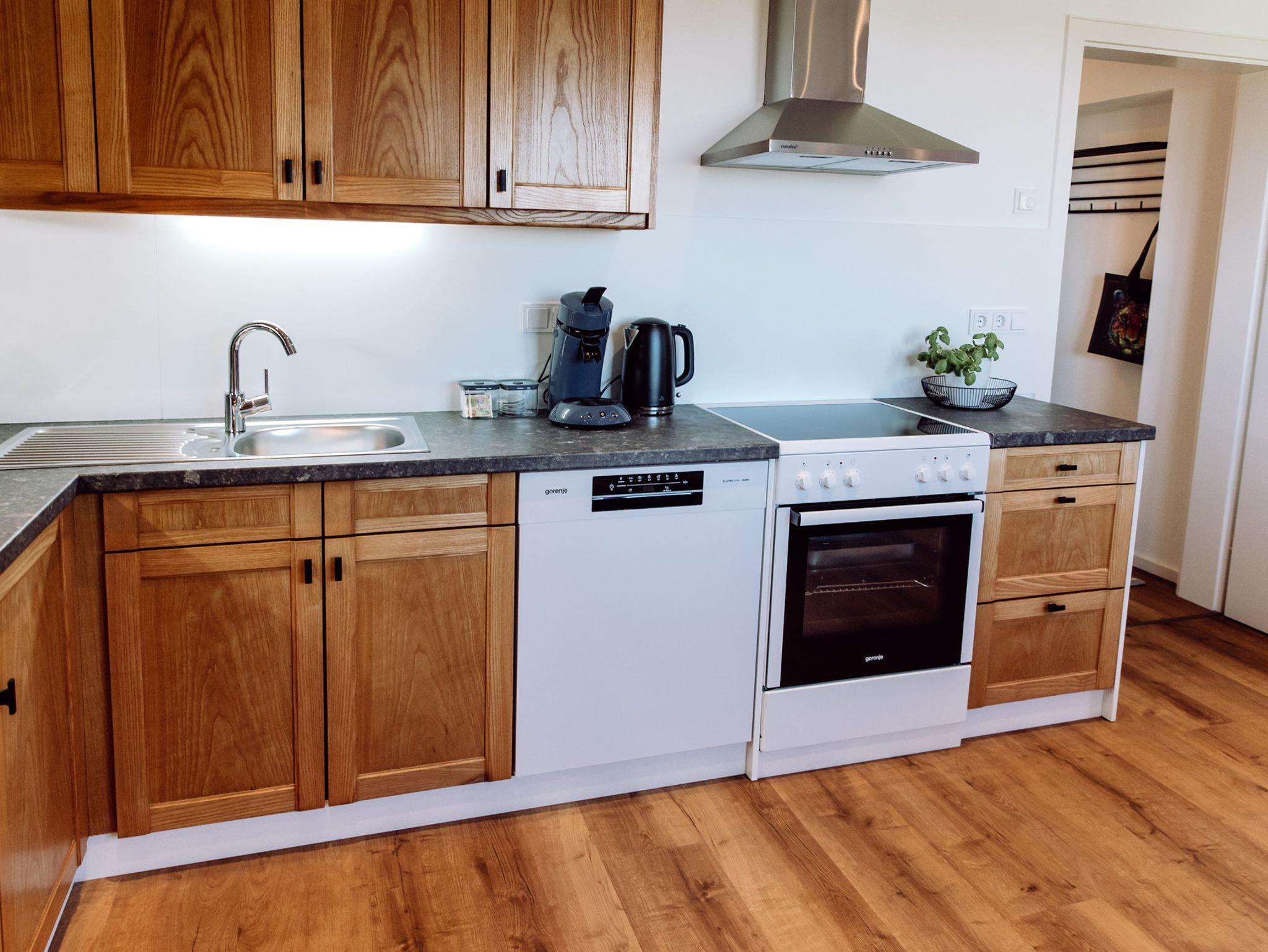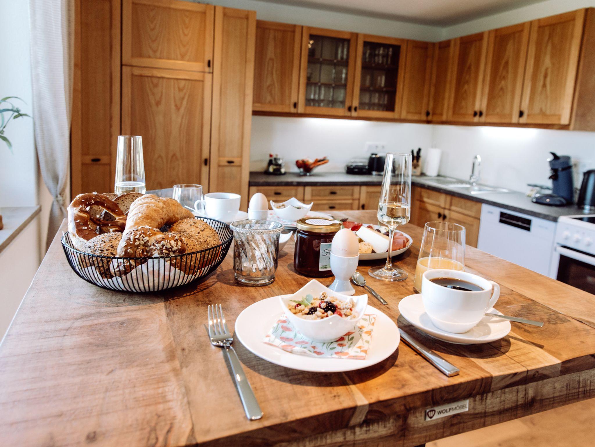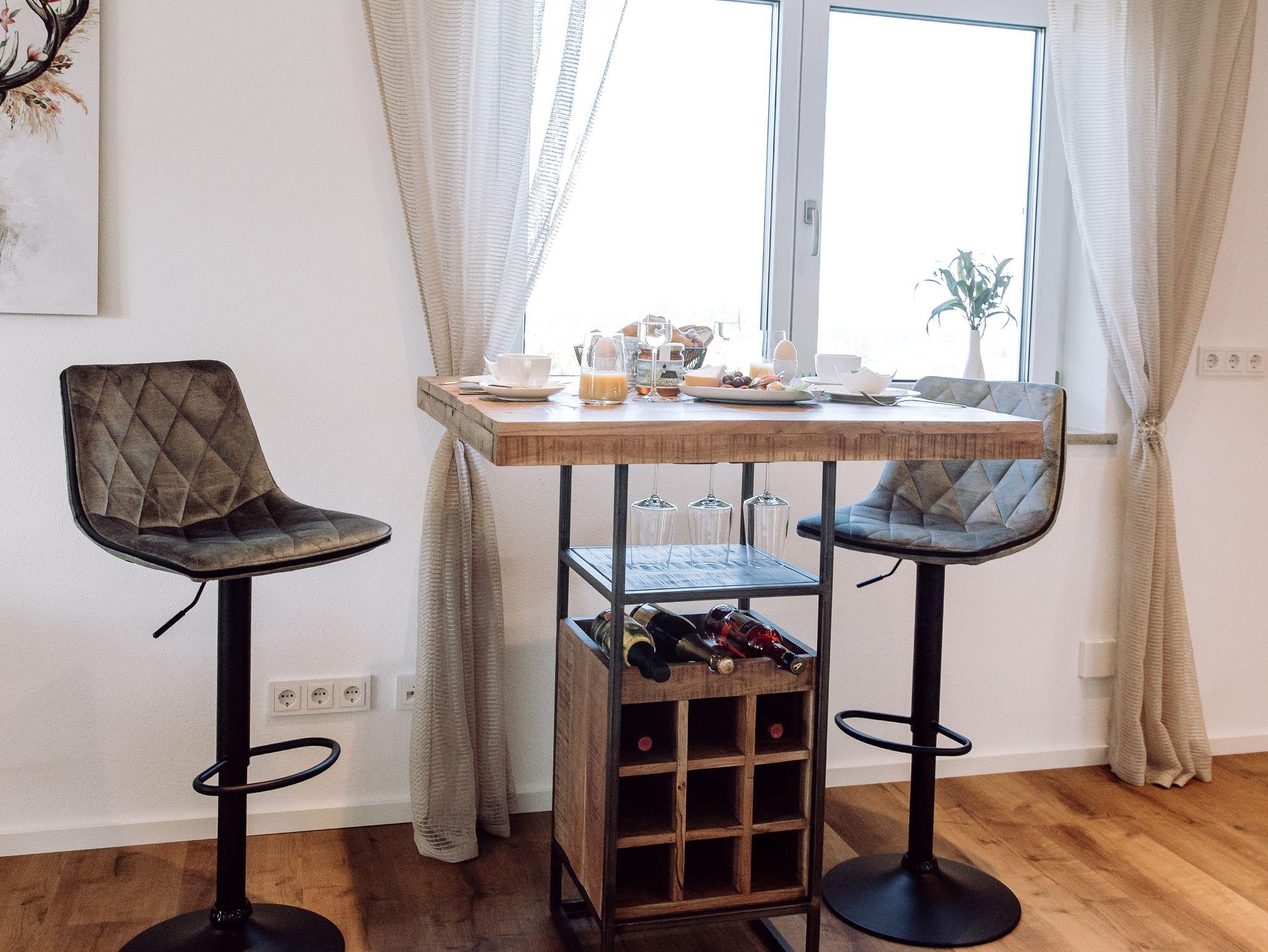 Die voll ausgestattete Küche lässt keine Wünsche offen: Moderne Geräte, großzügige Arbeitsflächen bieten alles für das miteinander Kochen. Der stilvolle Bartisch mit passenden Hockern schafft eine einladende Atmosphäre zum gemütlichen Verweilen.