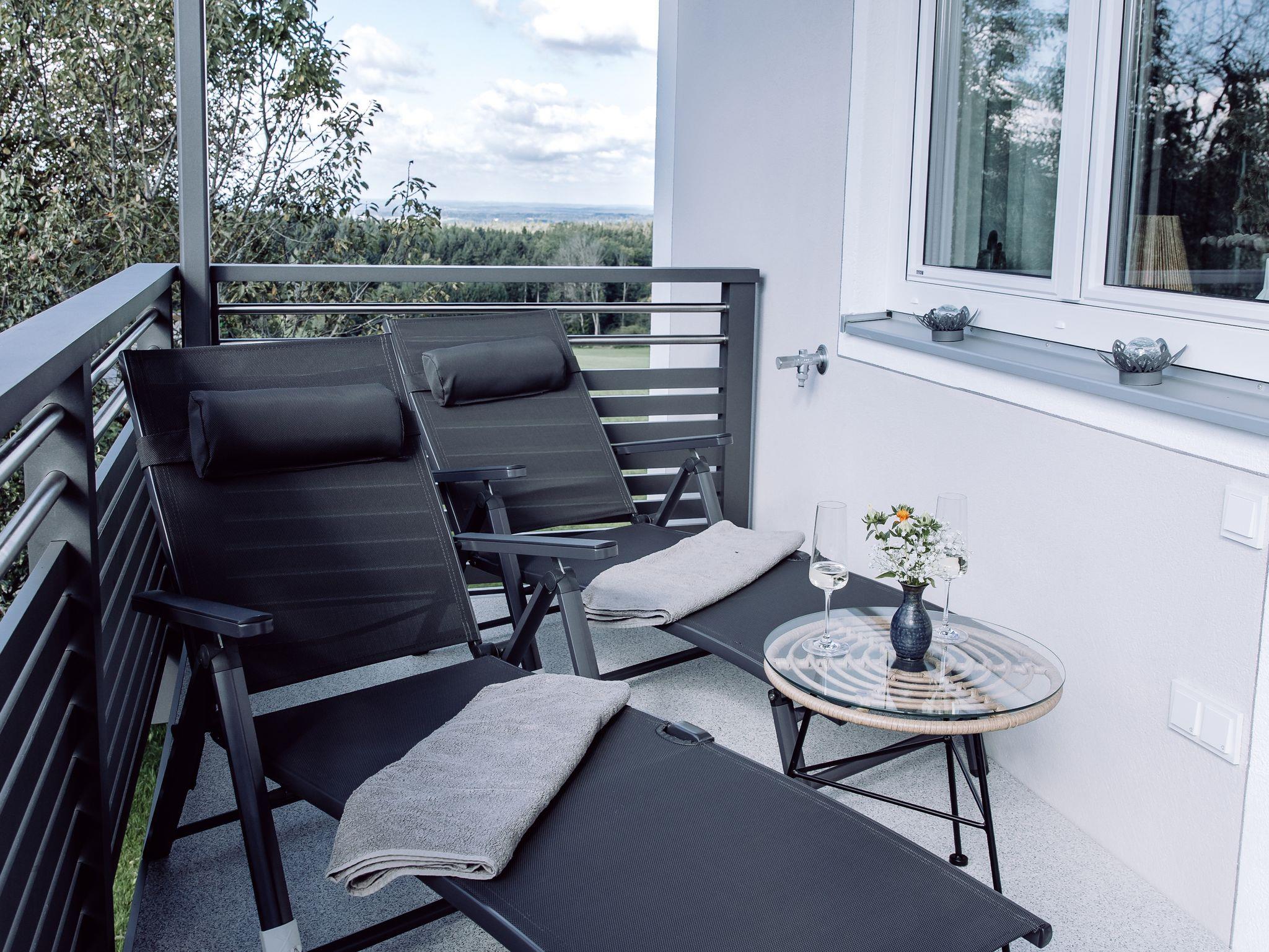Haus Horizont, Ferienwohnung 2 Ausblick im 1. Obergeschoss mit ausgestattetem Balkon