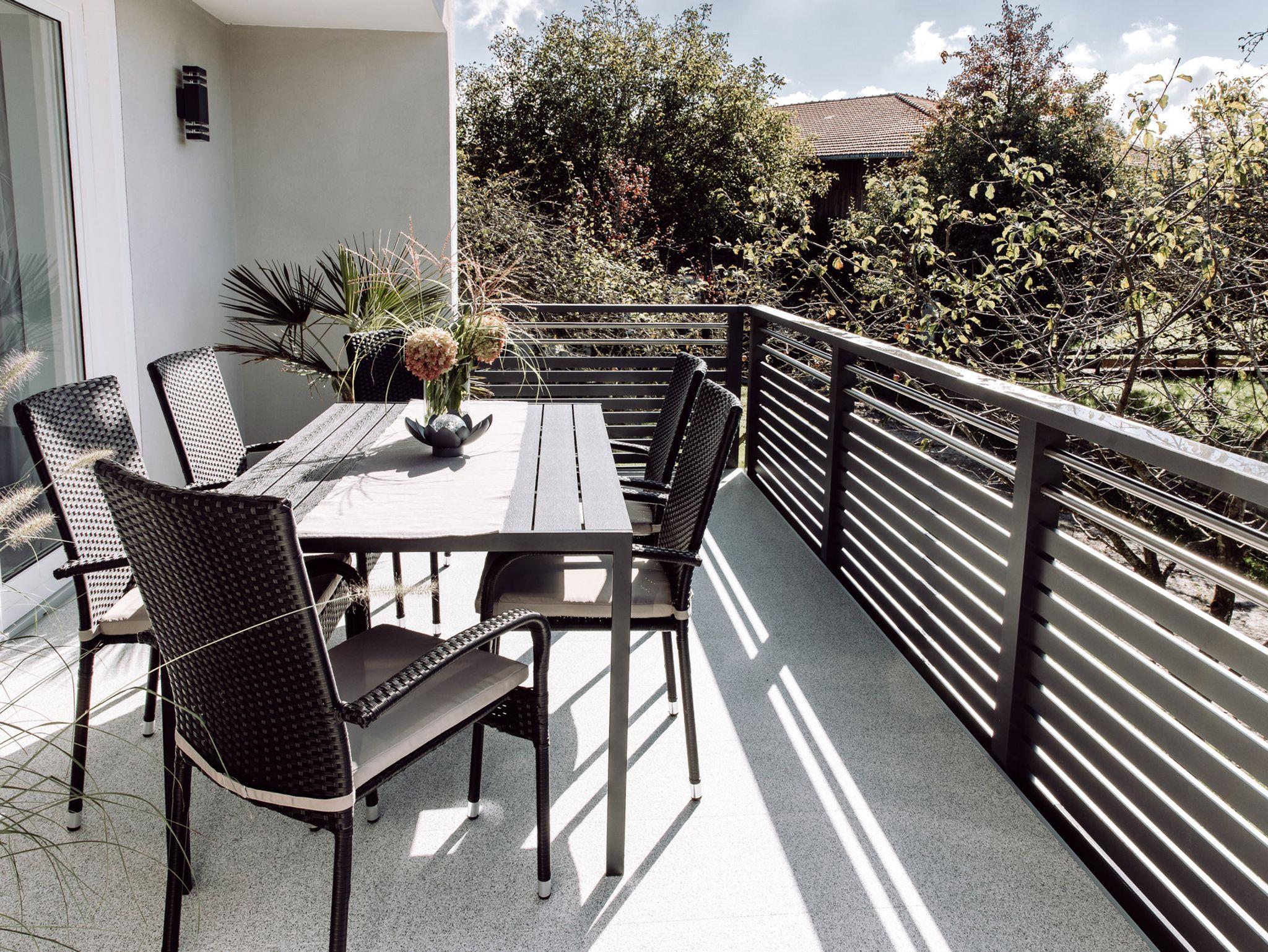 Besonderes Highlight ist der große Südbalkon mit 21qm2, ausgestattet mit Tisch, Stühlen und Liegen.