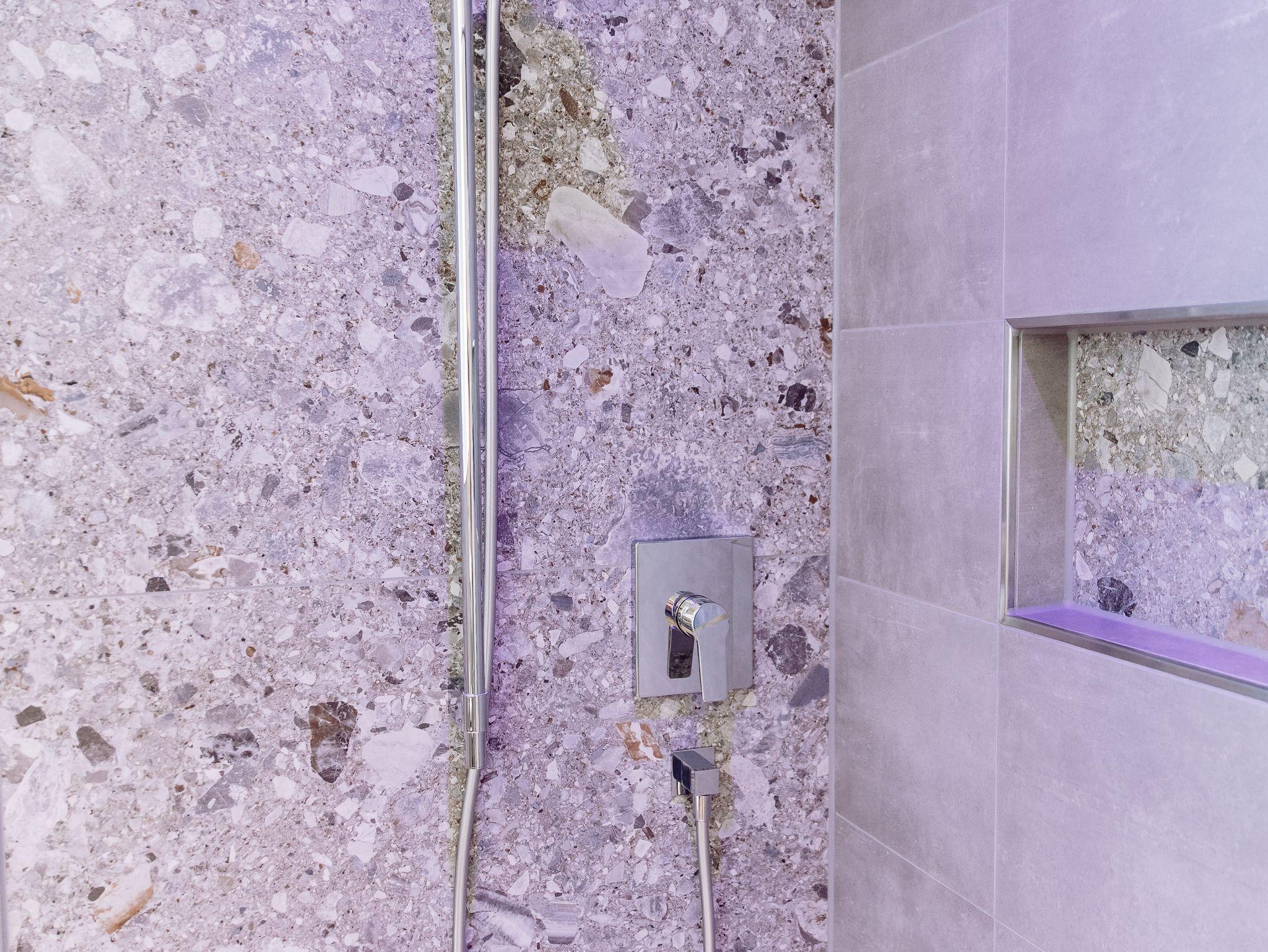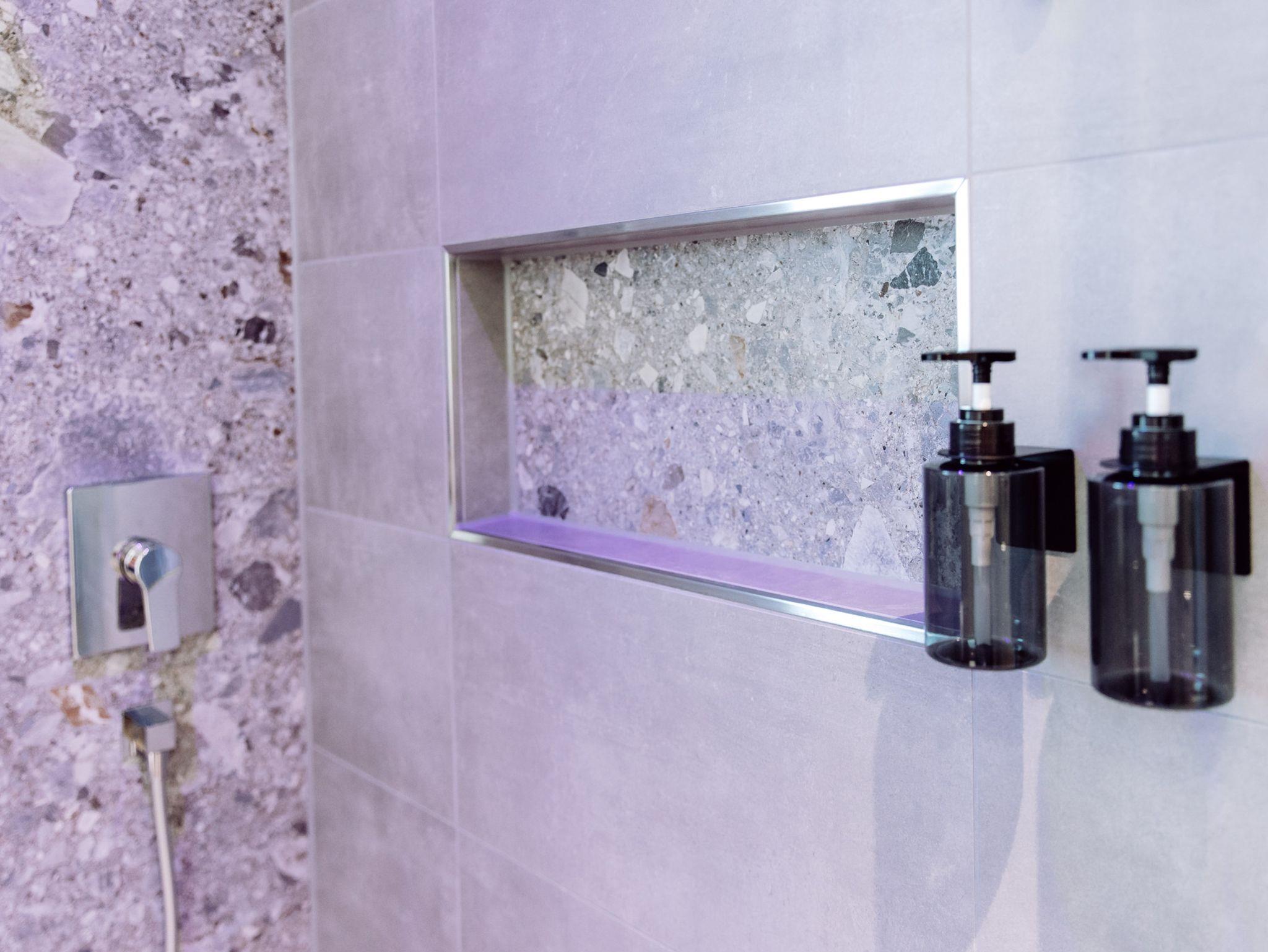 Das moderne Badezimmer verfügt über eine komfortable Dusche, stilvolle Amaturen und helle, freundliche Materialien.