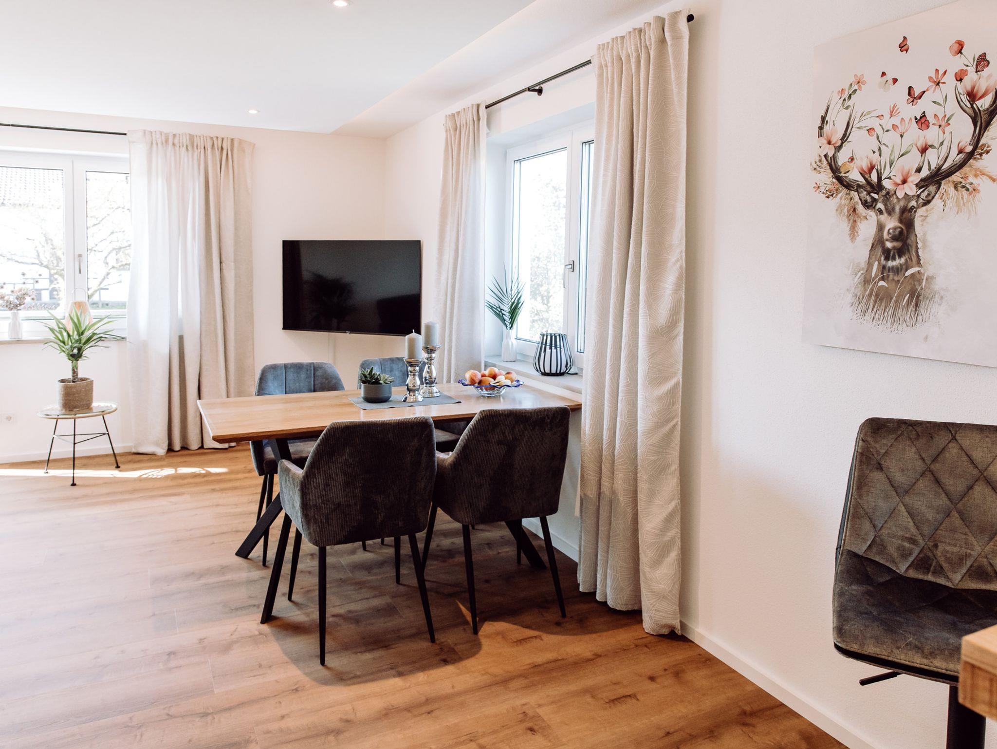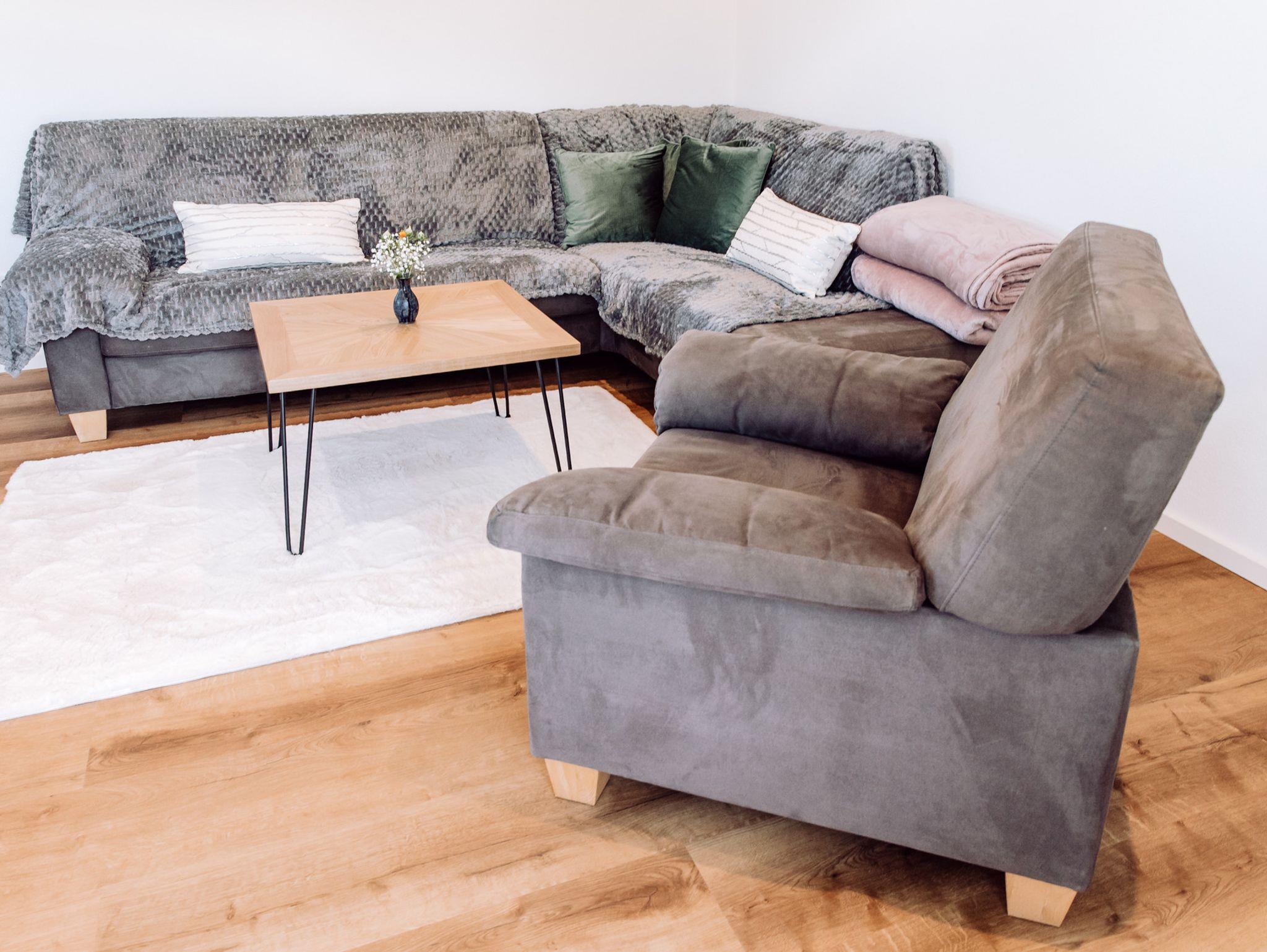 Das Wohnzimmer ist modern und gemütlich eingerichtet. Eine große, bequeme Couch lädt zum Entspannen ein. Für eine angenehme Atmosphäre sorgt eine stilvolle, indirekte Beleuchtung. Ein moderner Fernseher 55Zoll bietet Unterhaltungsmöglichkeiten.