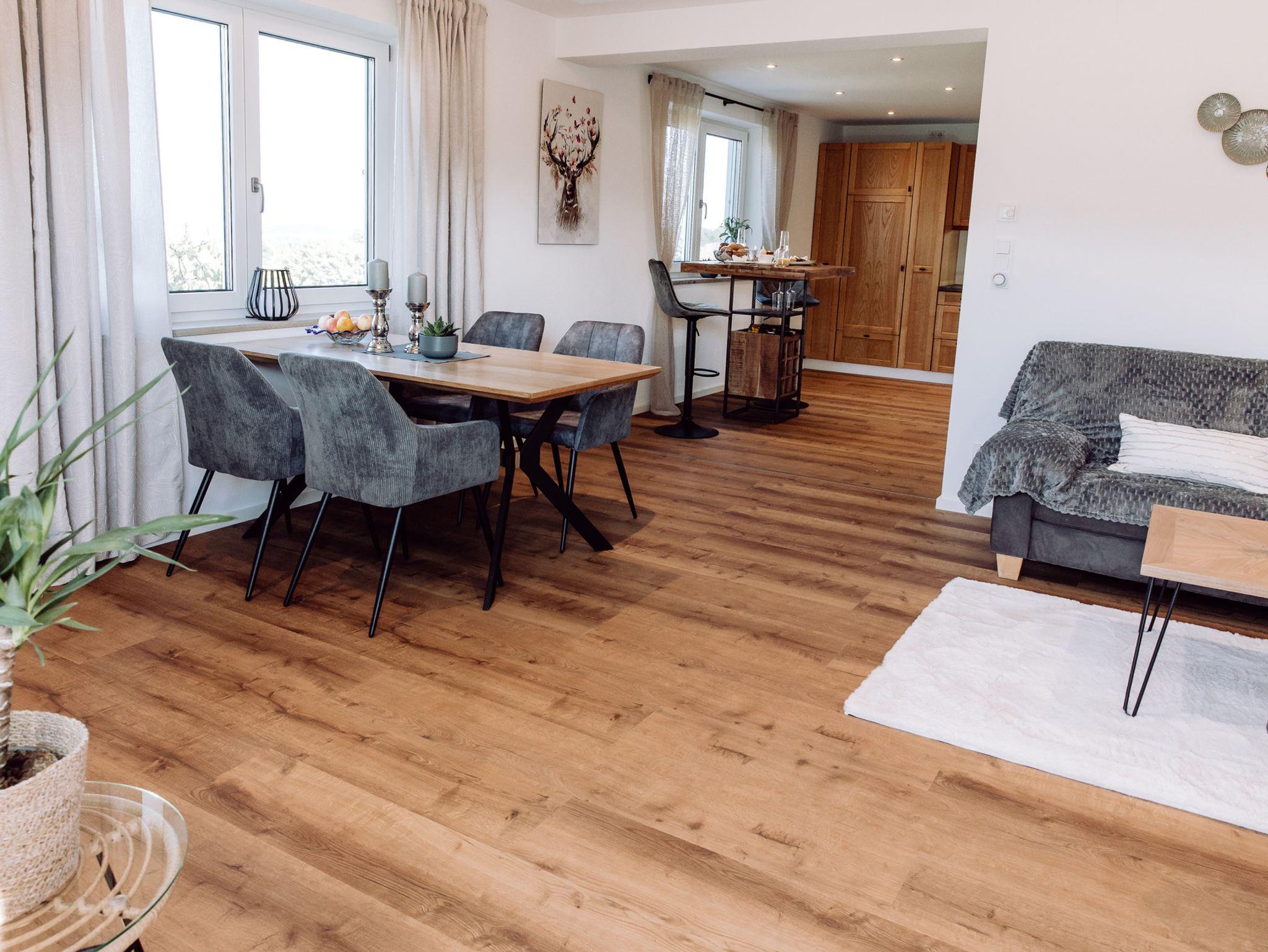 Der angrenzende Essbereich ist harmonisch integriert und lädt zum gemeinsamen Essen und Genießen ein.