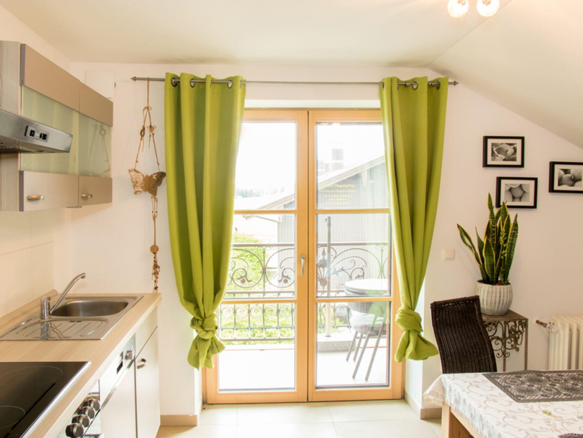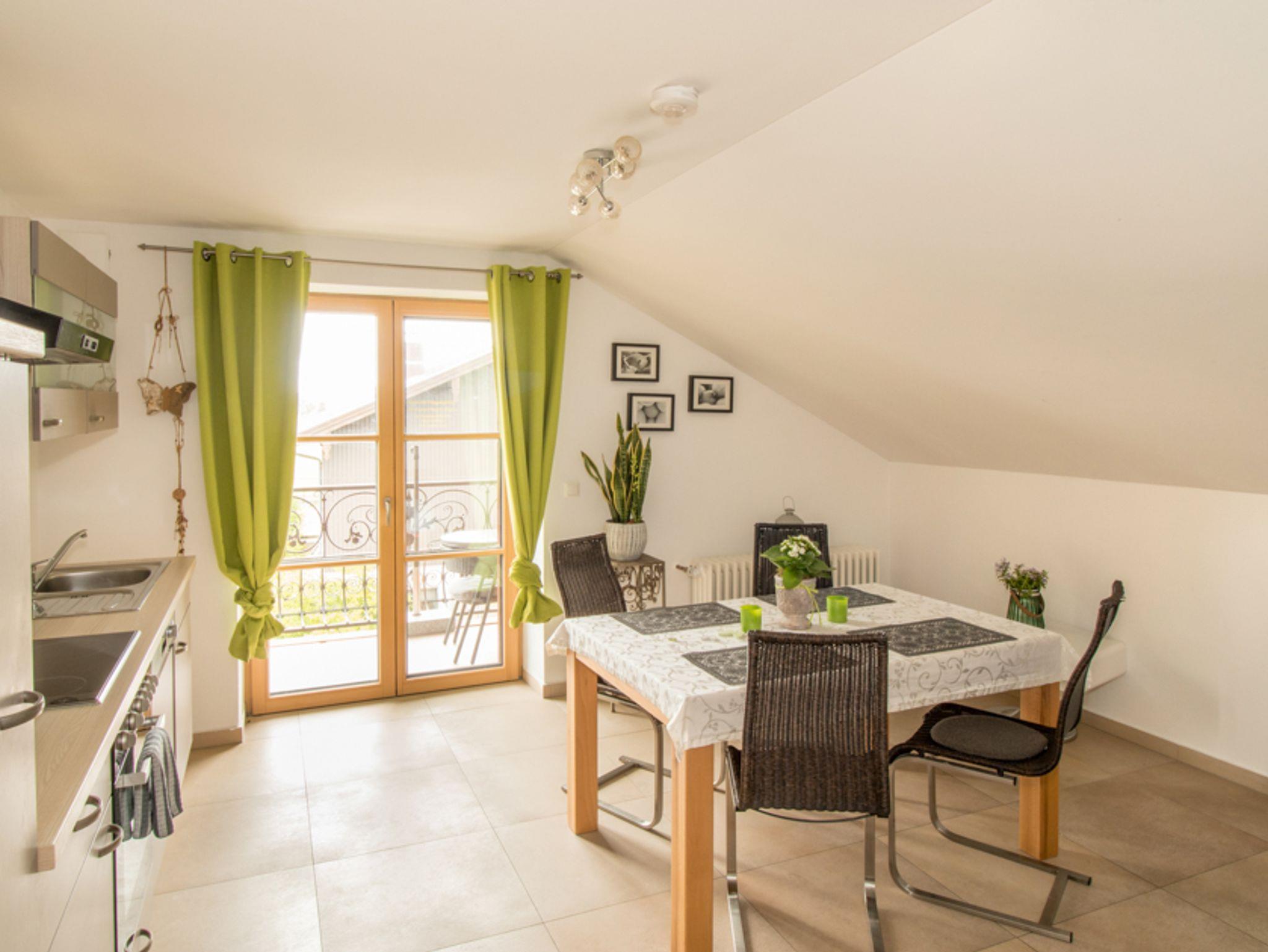 Unsere gemütliche Ferienwohnung ist mit einem Schlafzimmer (Doppelbett und Kinderhochbett), Wohnraum mit Küche und Schlafsofa, Bad (Dusche und WC) und Balkon mit Blick auf die Ratzinger Höhe und Kampenwand ausgestattet.