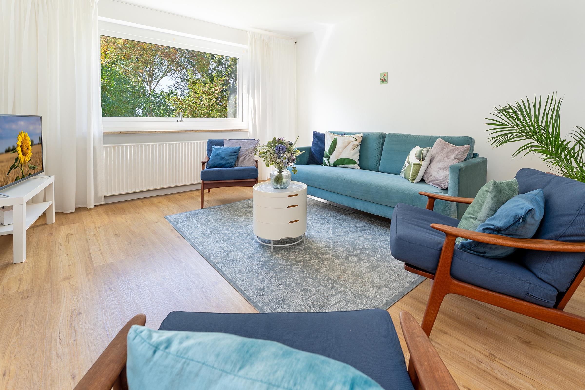 Das tageslichthelle und stilsichere Designbad begeistert mit bodentiefer Dusche, Fußbodenheizung, Waschmaschine, Trockner, beleuchtetem Spiegel und rundum gelungenem Ambiente. Im 1. Obergeschoss befinden sich beide Schlafzimmer: Eines der Schlafzimmer ist mit einem Doppelbett (2x 90x200 cm), Kommode und zwei Nachttischen möbliert, das zweite Schlafzimmer ist mit zwei Einzelbetten (je 80x200 cm), Kommode und TV ausgestattet. Gemütliche Sitzsäcke und eine Sitzecke mit zwei Cocktailsesseln laden im Obergeschoss zum Lümmeln und Entspannen ein. An grauen Tagen vertreiben Sie sich die Zeit mit der großen Spielesammlung oder schmökern in den vorhandenen Büchern und Zeitschriften.