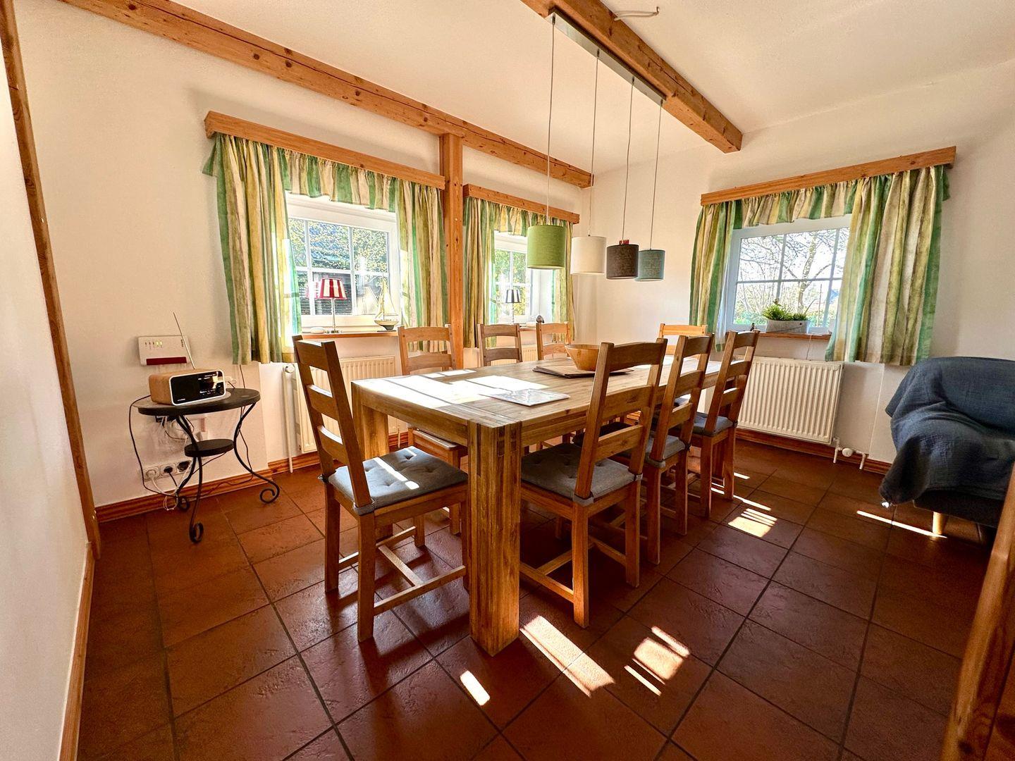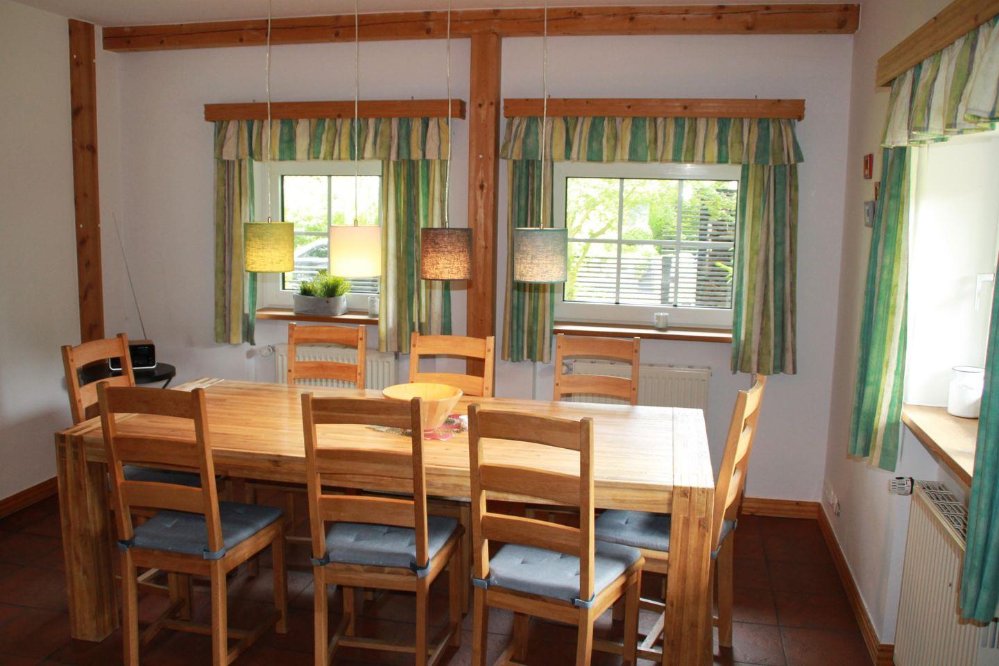 Die moderne und voll ausgestattete Küche lässt keine Wünsche offen. Sie verfügt über einen Herd, Backofen, Mikrowelle, Spülmaschine und Kühlschrank mit Gefrierfach, sodass kulinarischen Abenteuern in Ihrem Urlaub nichts im Wege steht. Für Ihr Frühstück oder den kleinen Hunger zwischendurch stehen Ihnen ein Wasserkocher, Toaster und eine Kaffeemaschine zur Verfügung. Genießen Sie die gemeinsamen Mahlzeiten im Essbereich oder auf der Terrasse!