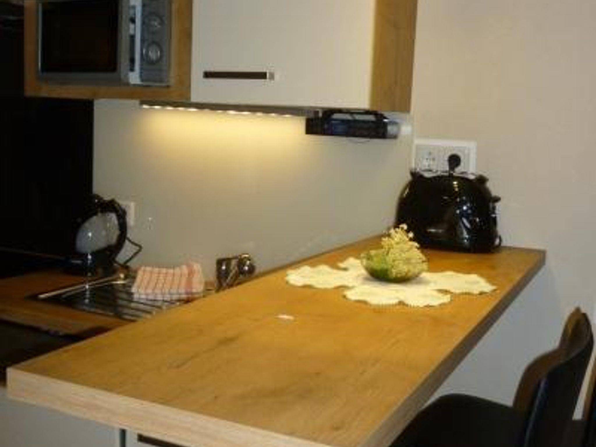 Ausstattung der Küche: Backofen, Cerankochfeld, Kühlschrank mit Gefrierfach, Geschirrspüler, Mikrowelle, Kaffeemaschine, Toaster, Wasserkocher.