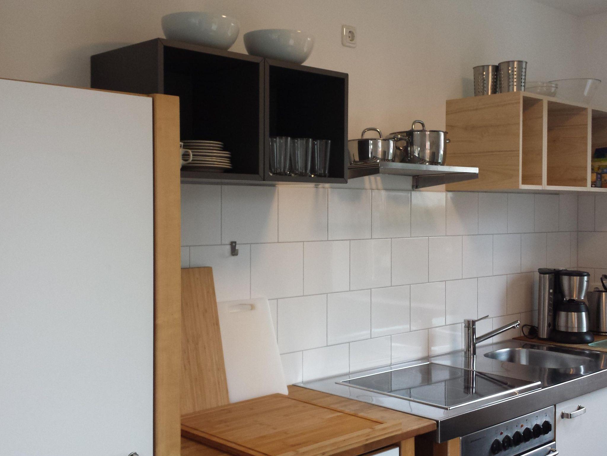 Die offene Küche ist komplett eingerichtet, ebenso wie das Badezimmer mit bodentiefer - / gleicher Dusche.