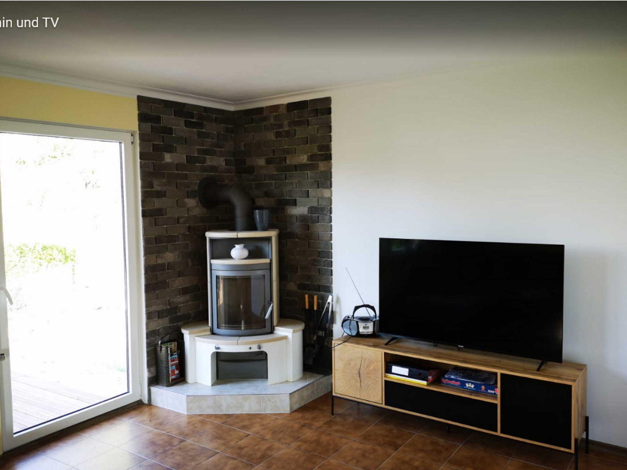 Im Wohnbereich befindet sich eine gemütliche Sitzlandschaft mit großem Hocker, Kissen und einem niedrigen Truhentisch. Gegenüber befindet sich das TV-Lowboard auf dem der Fernseher steht. Im Lowboard haben wir jede Menge Brettspiele zu Ihrer Unterhaltung verstaut. Links vom TV kuschelt sich unser kleiner Kaminofen in die Ecke. Aktuell ist er noch nicht in Betrieb, weil die Abnahme vom Schornsteinfeger noch aussteht. Aber wir wollen diesen Kamin auf jeden Fall nutzbar machen.