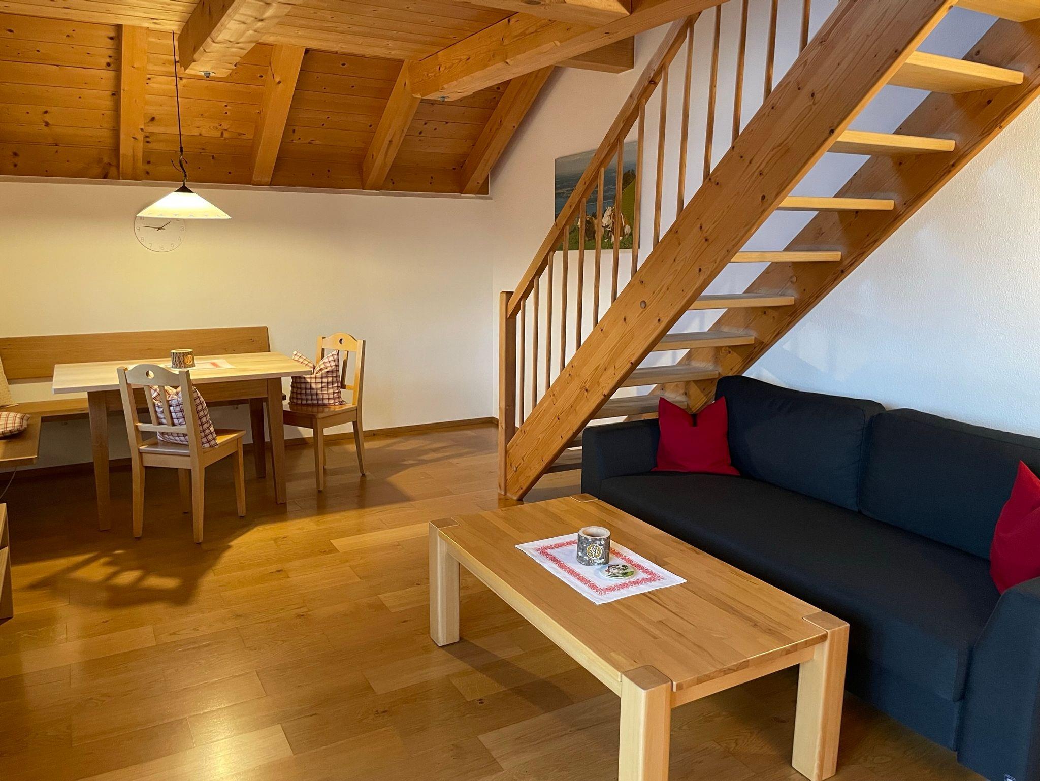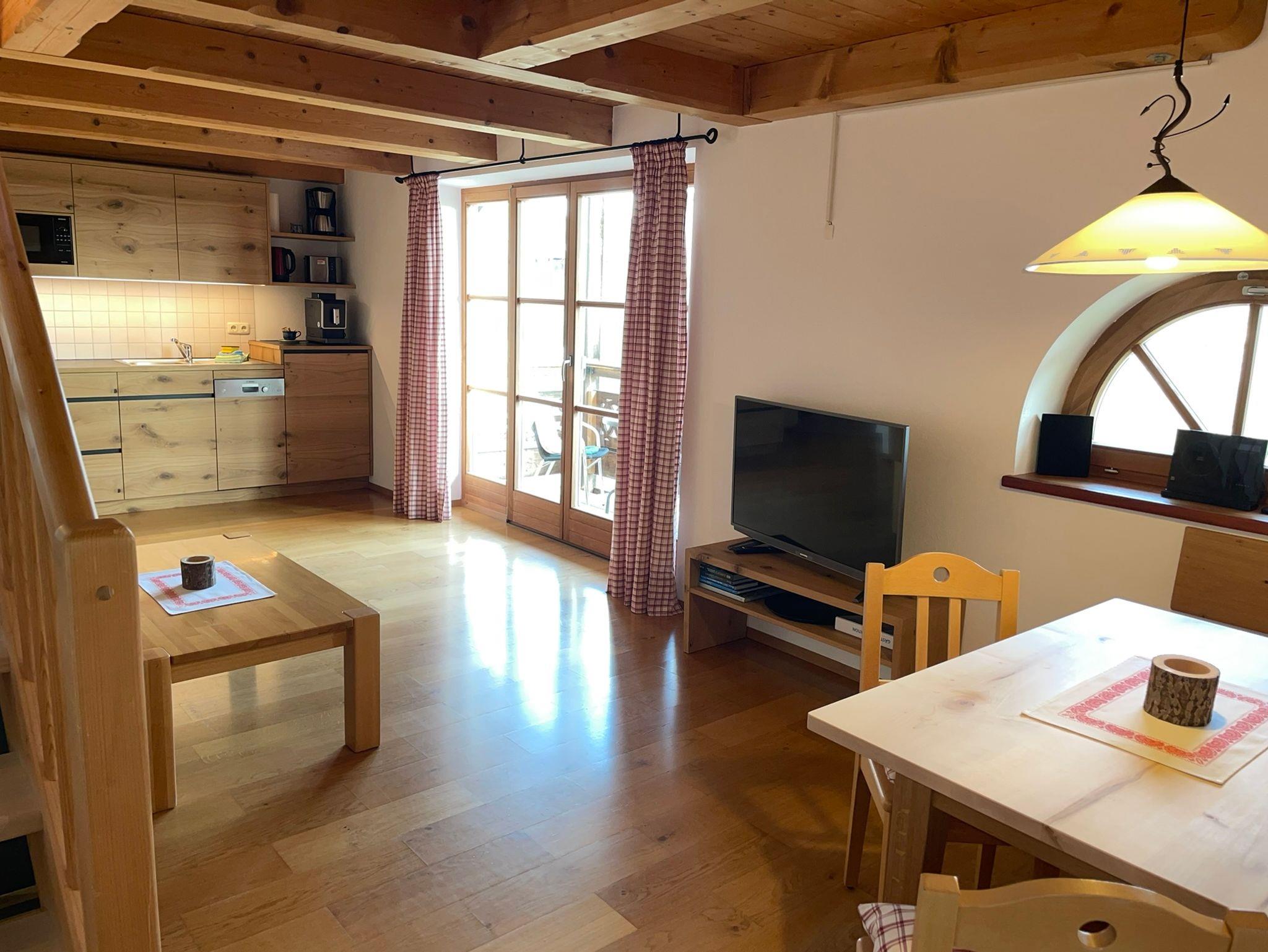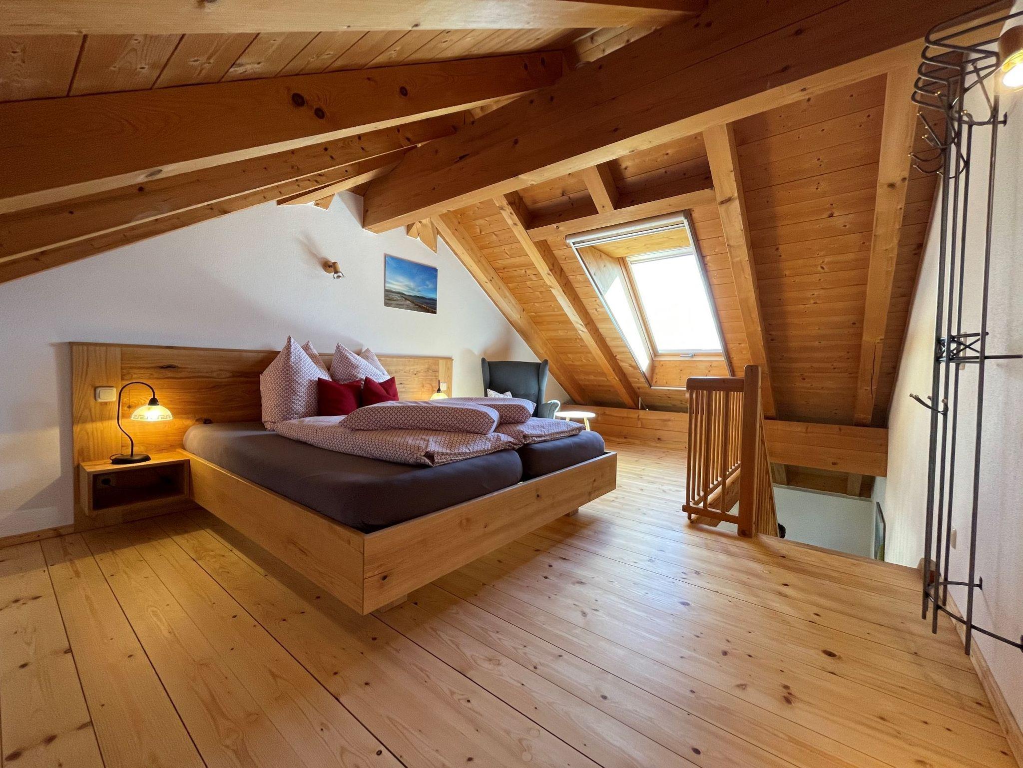 Die etwa 48 qm große Ferienwohnung ist durch eine Schlafgalerie räumlich getrennt und befindet sich im 2. Stock des See Cafe Toni, ein einzelstehendes Landhaus am Nordufer des Chiemsees mit Blick über die Schafwaschener Bucht und die Chiemgauer Alpenkette.