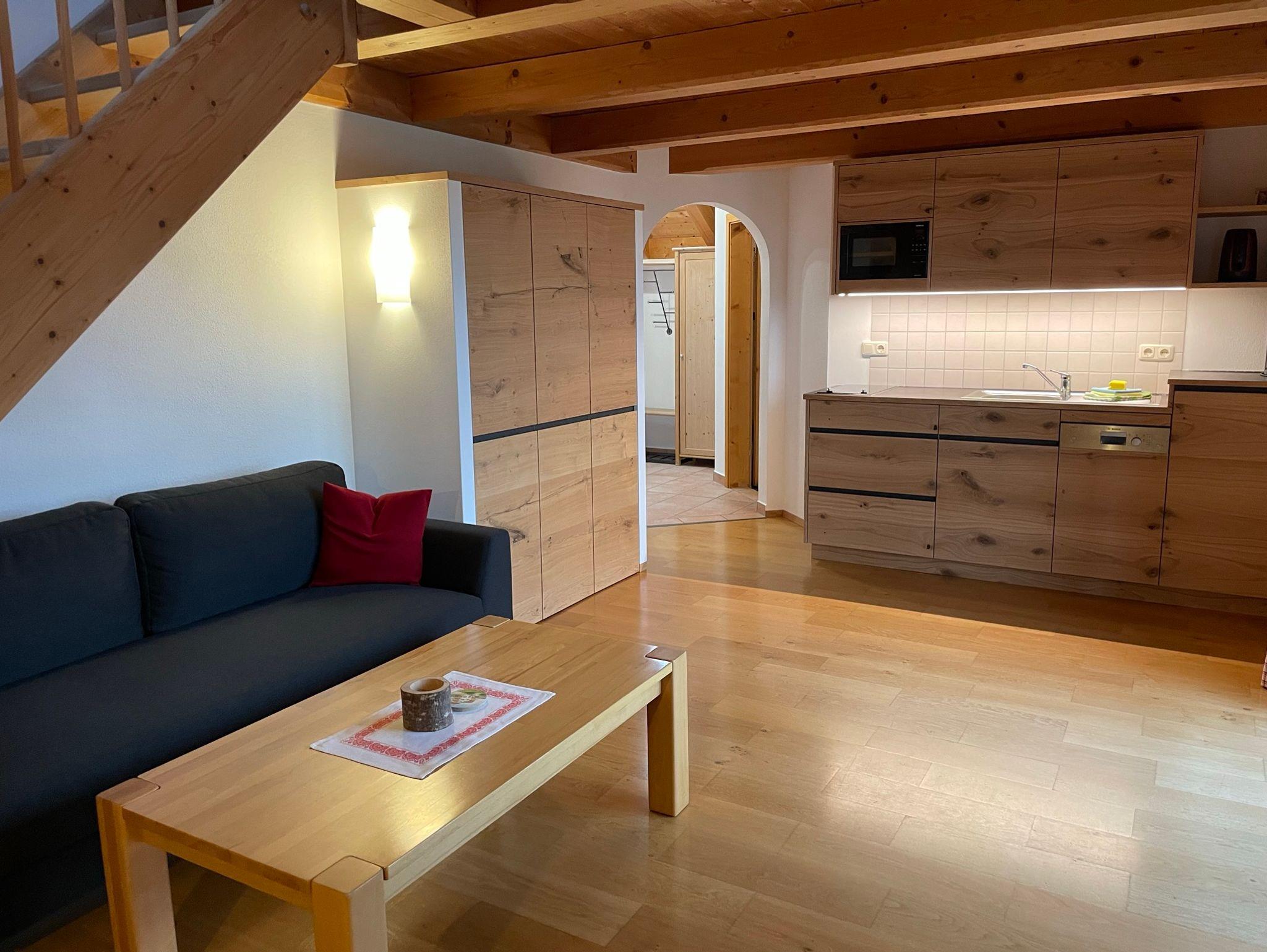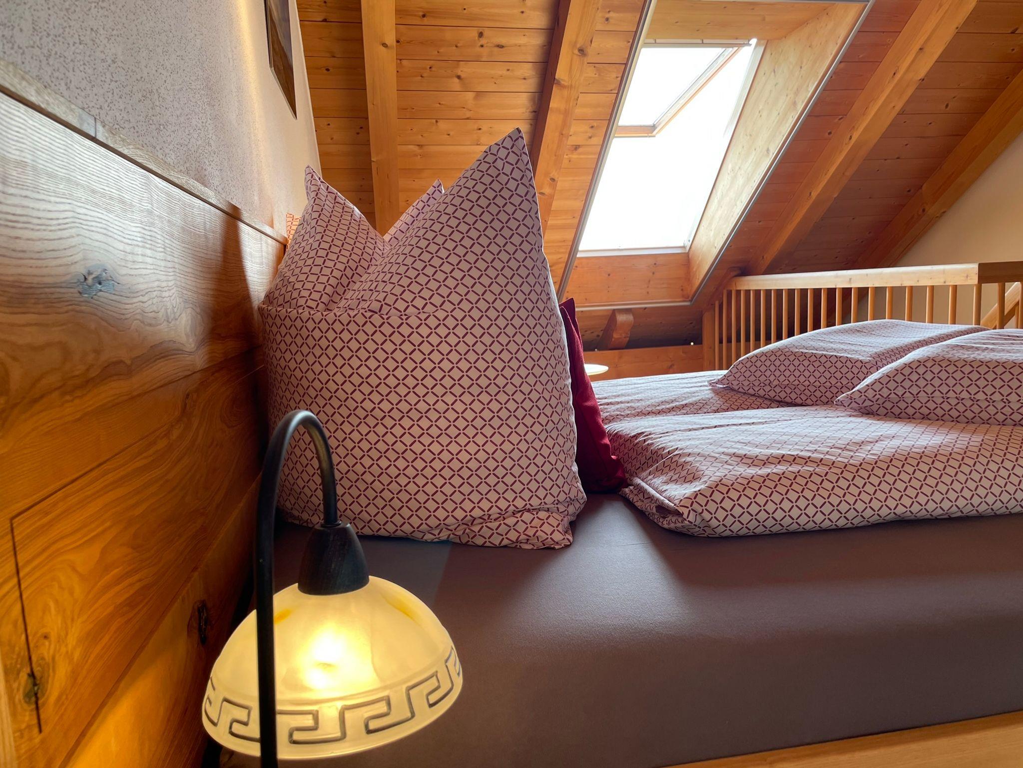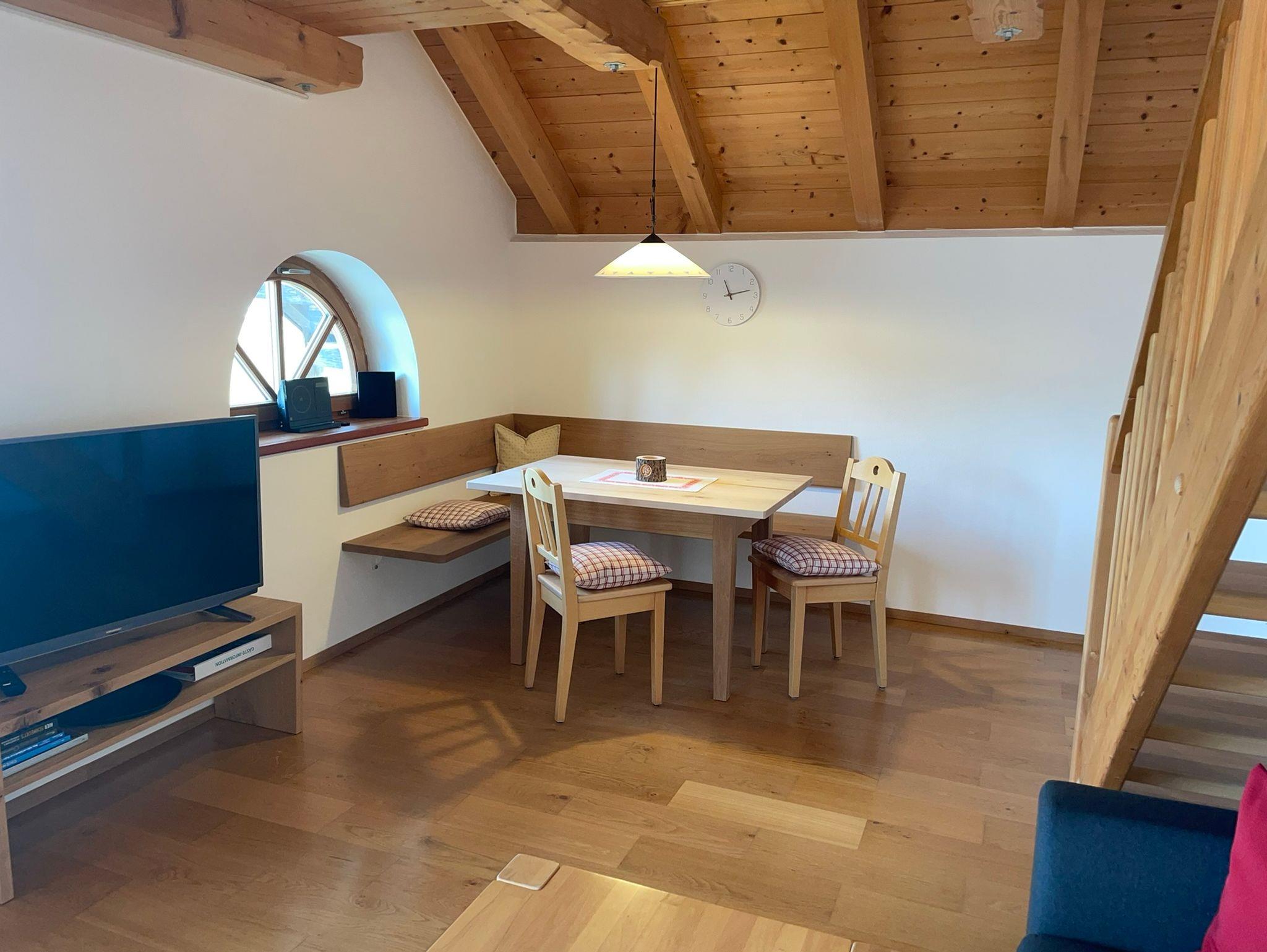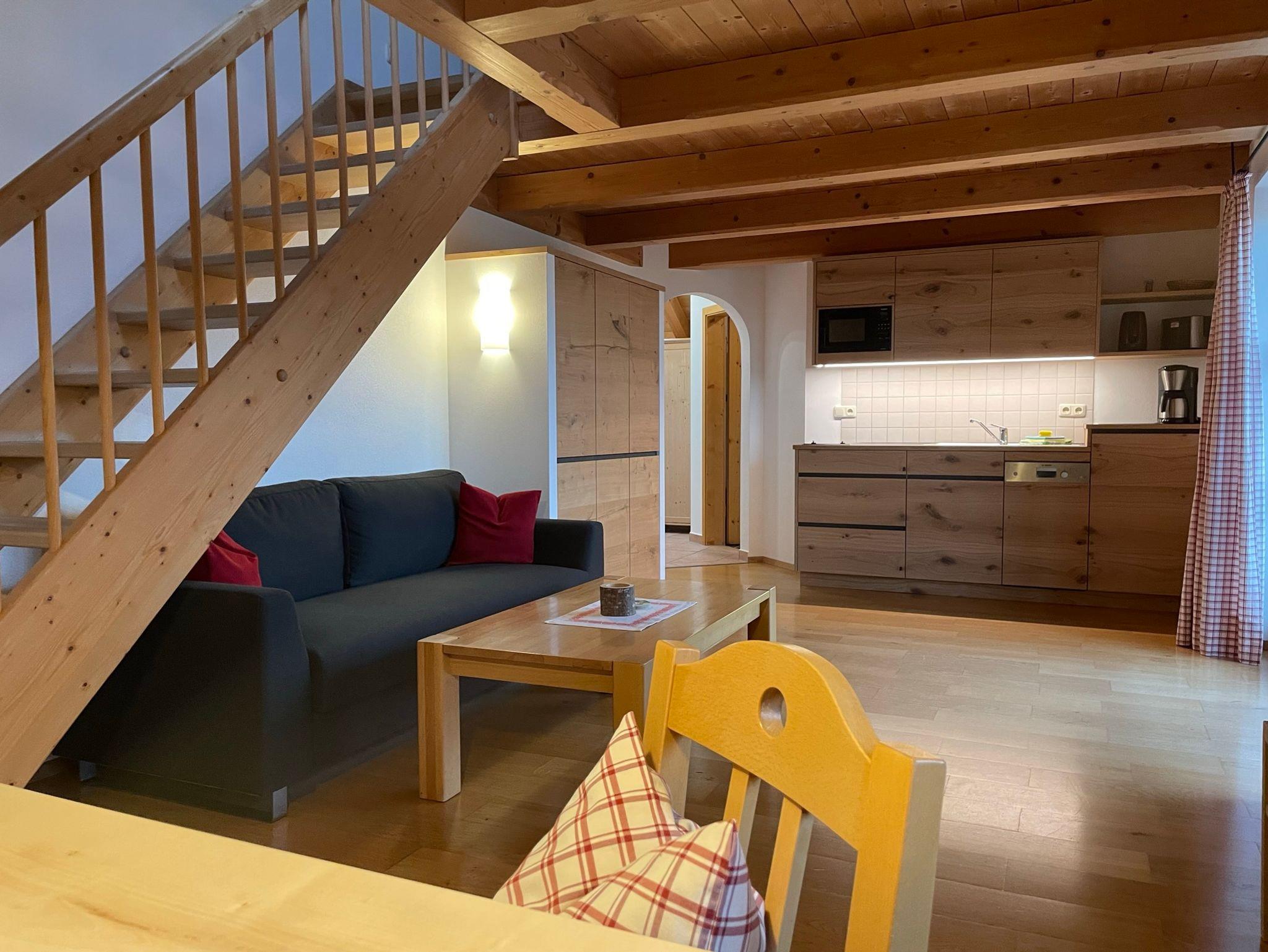 Die etwa 48 qm große Ferienwohnung ist durch eine Schlafgalerie räumlich getrennt und befindet sich im 2. Stock des See Cafe Toni, ein einzelstehendes Landhaus am Nordufer des Chiemsees mit Blick über die Schafwaschener Bucht und die Chiemgauer Alpenkette.