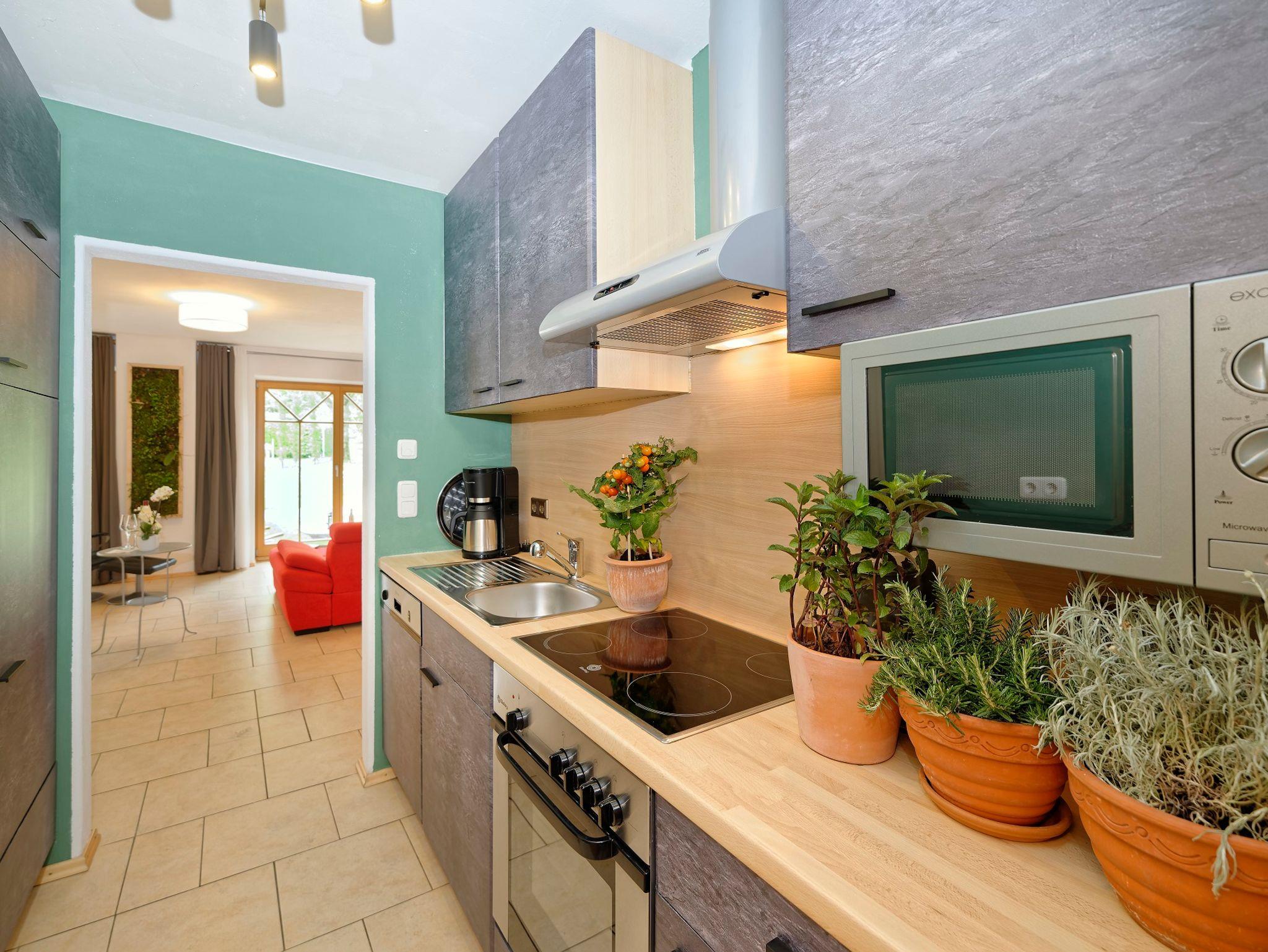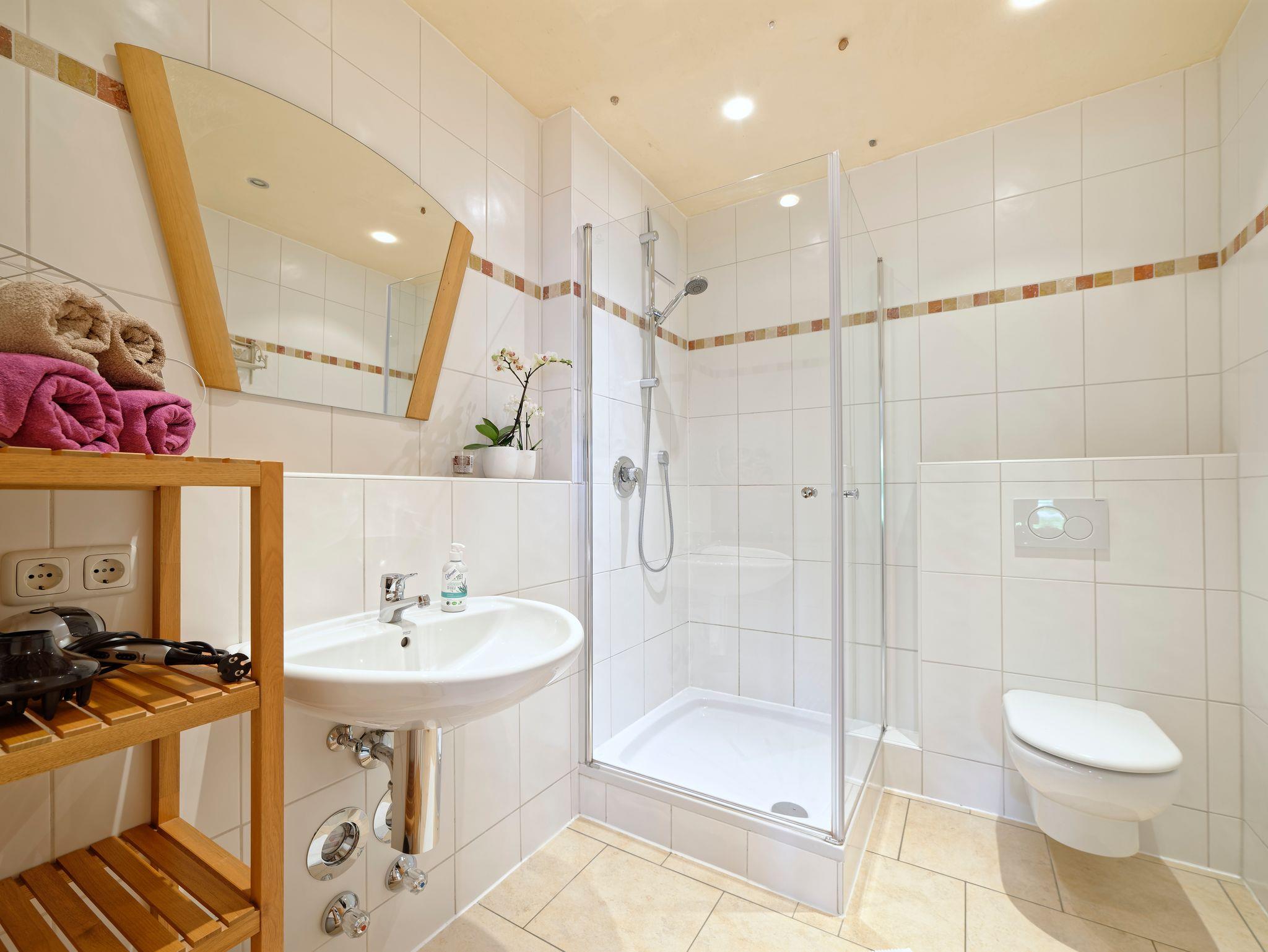 Wohn-Schlafraum, seperate Küche (Geschirrspüler, Mikrowelle, E-Herd), Dusche mit WC.