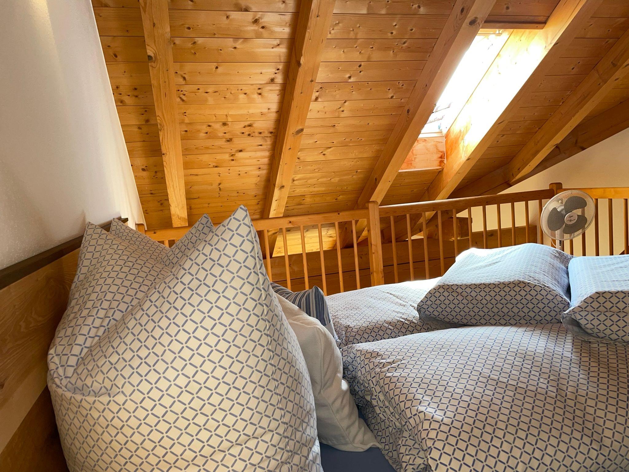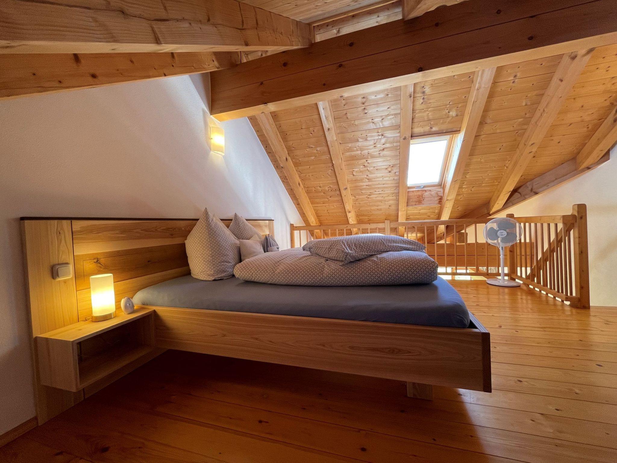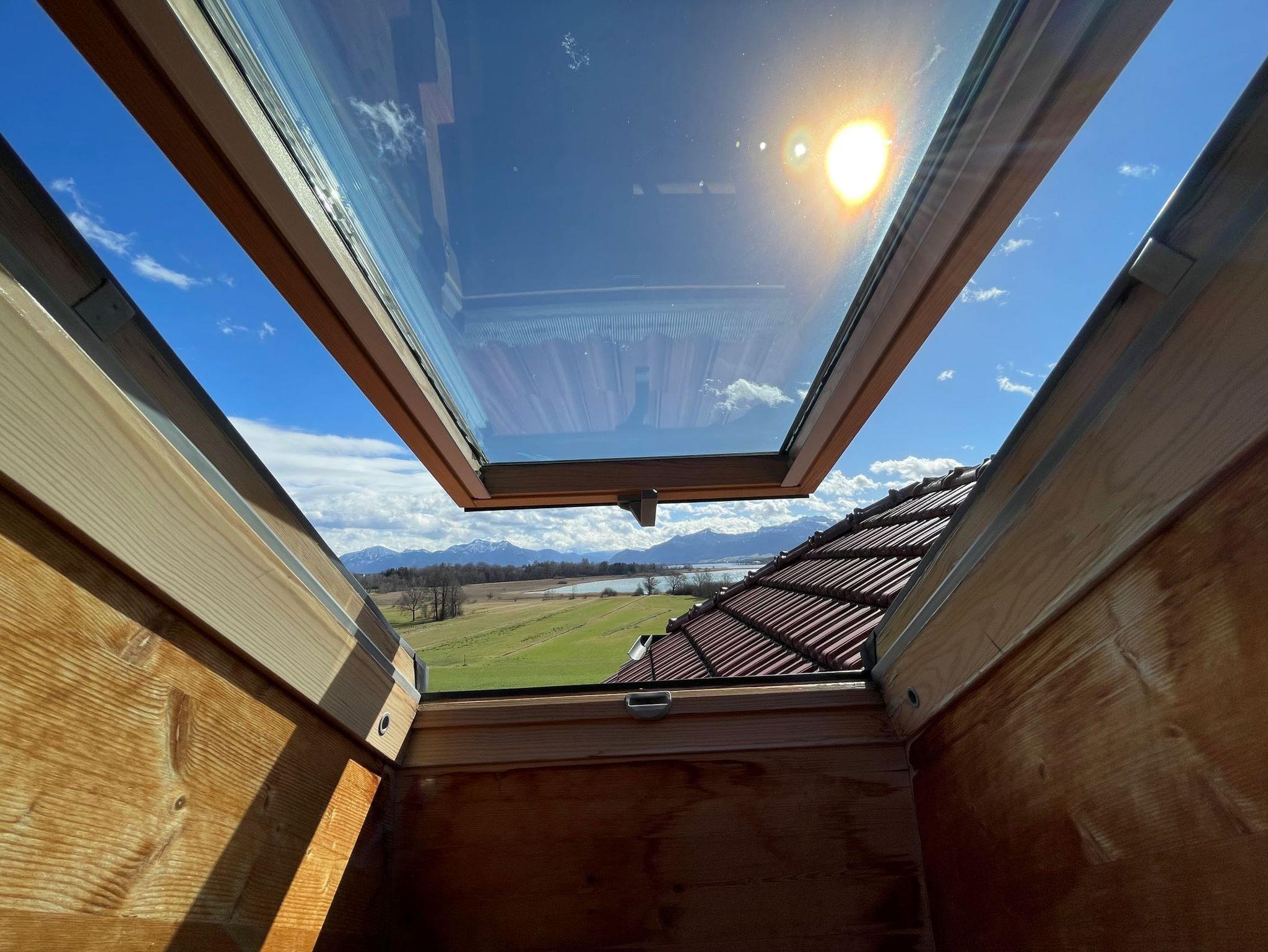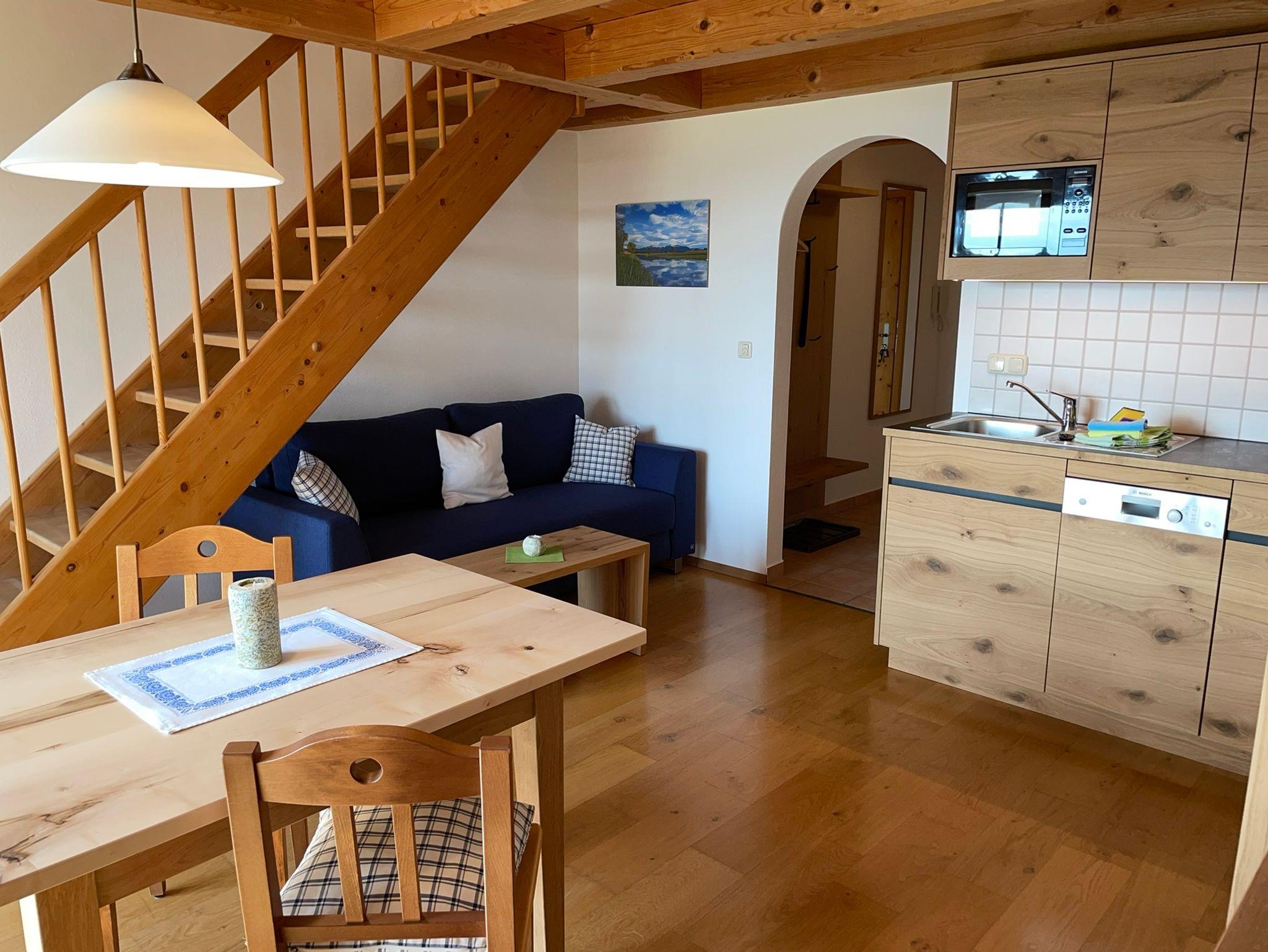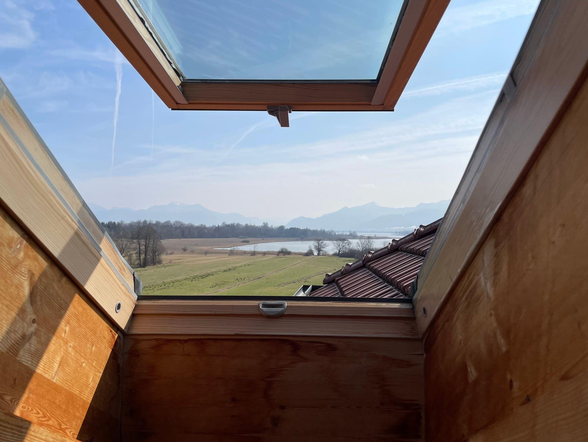 Die etwa 40 qm große Ferienwohnung ist durch eine Schlafgalerie räumlich getrennt und befindet sich im 2. Stock des See Cafe Toni, ein einzelstehendes Landhaus am Nordufer des Chiemsees mit Blick über die Schafwaschener Bucht und die Chiemgauer Alpenkette.