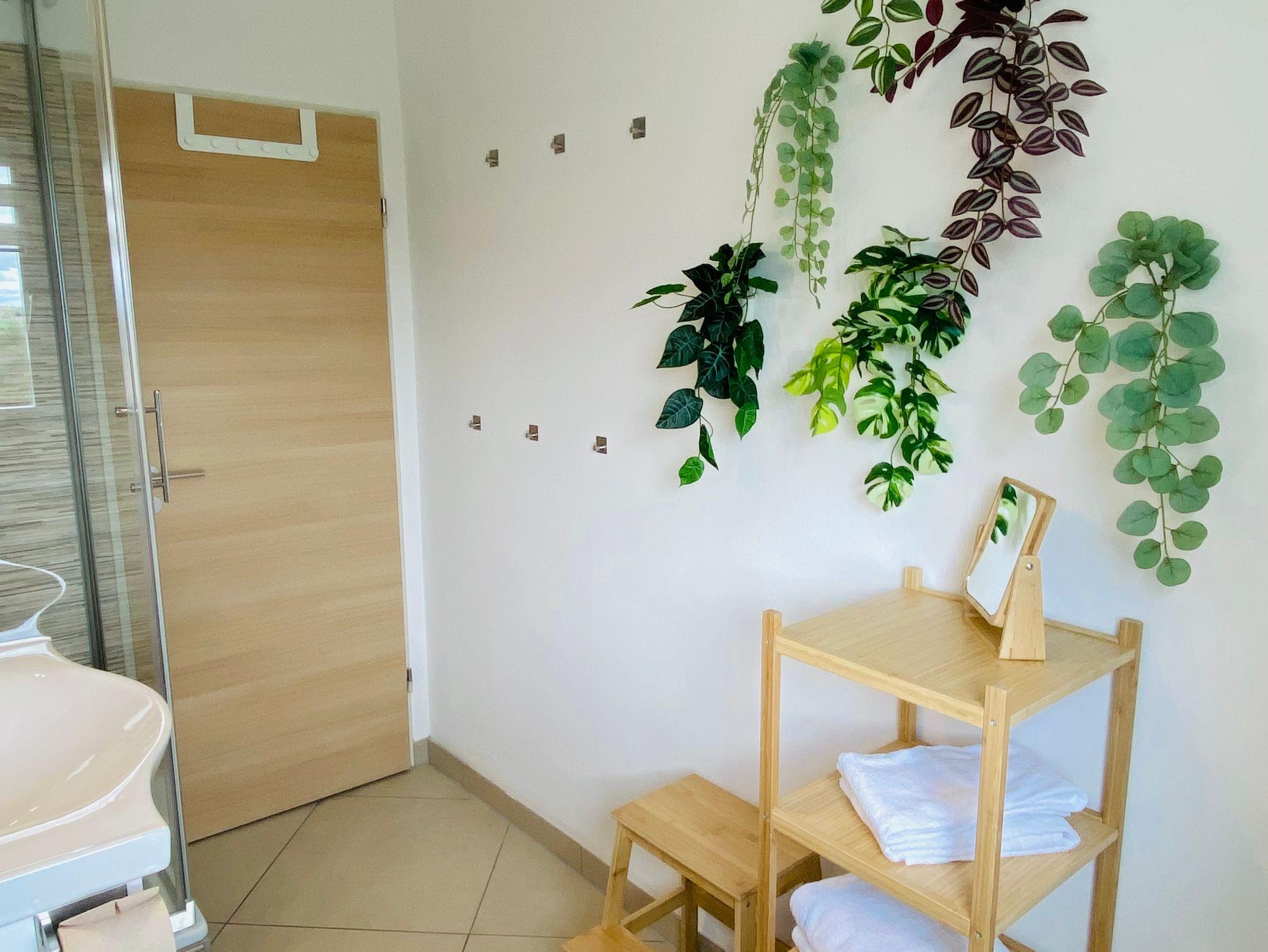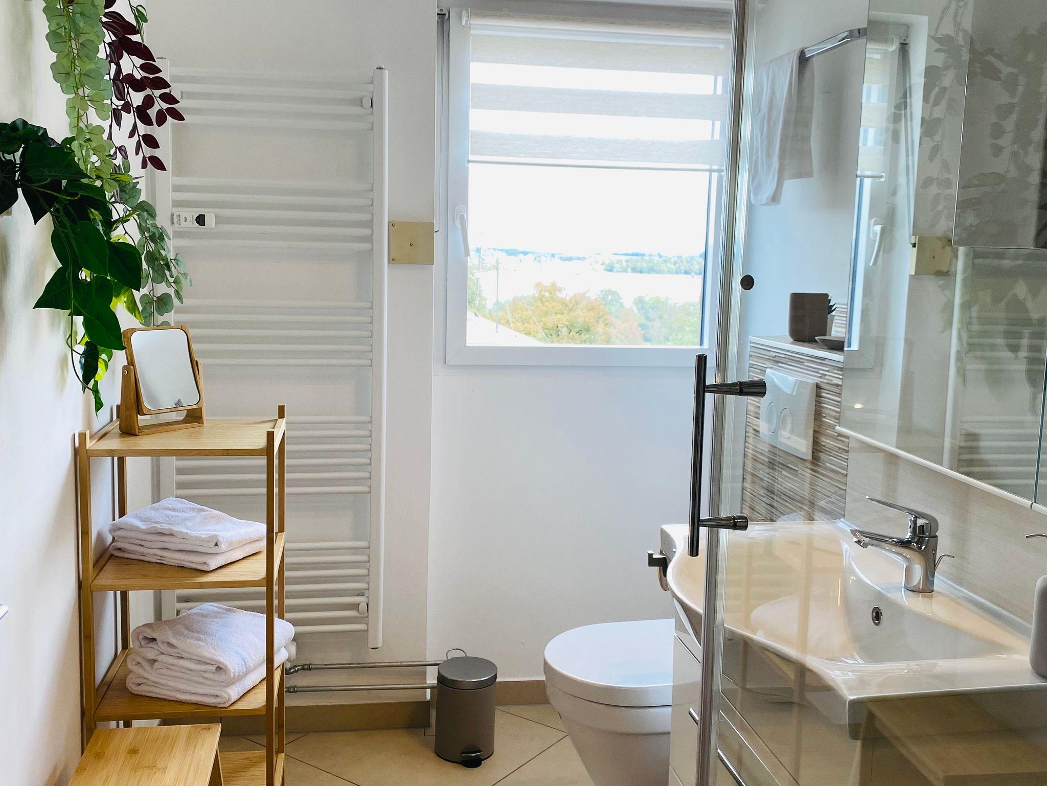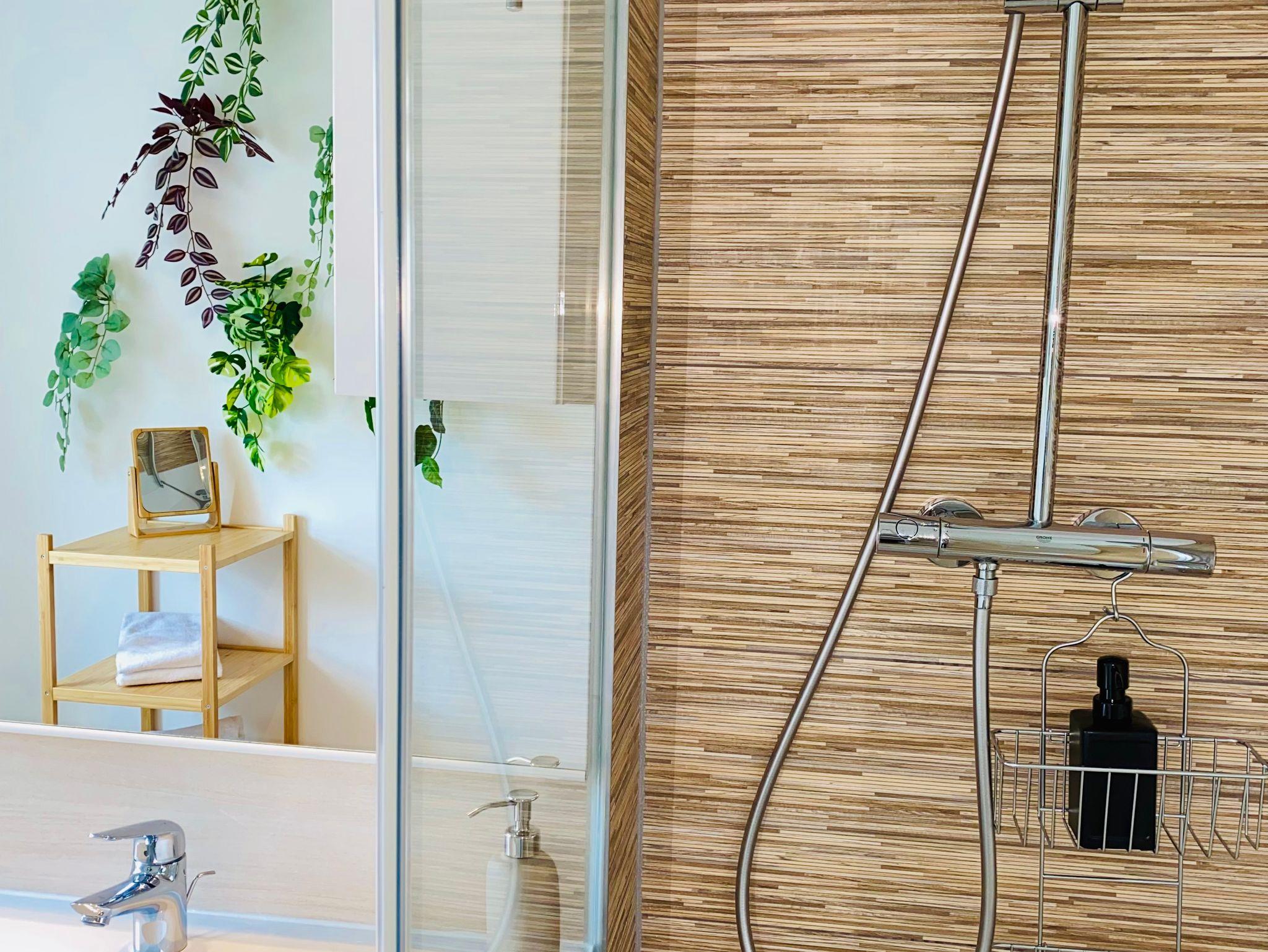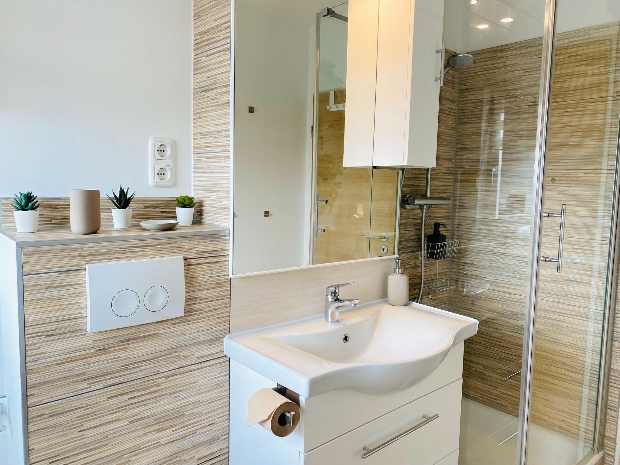 Das Bad bietet eine Dusche und einen Wasch-Trockner.