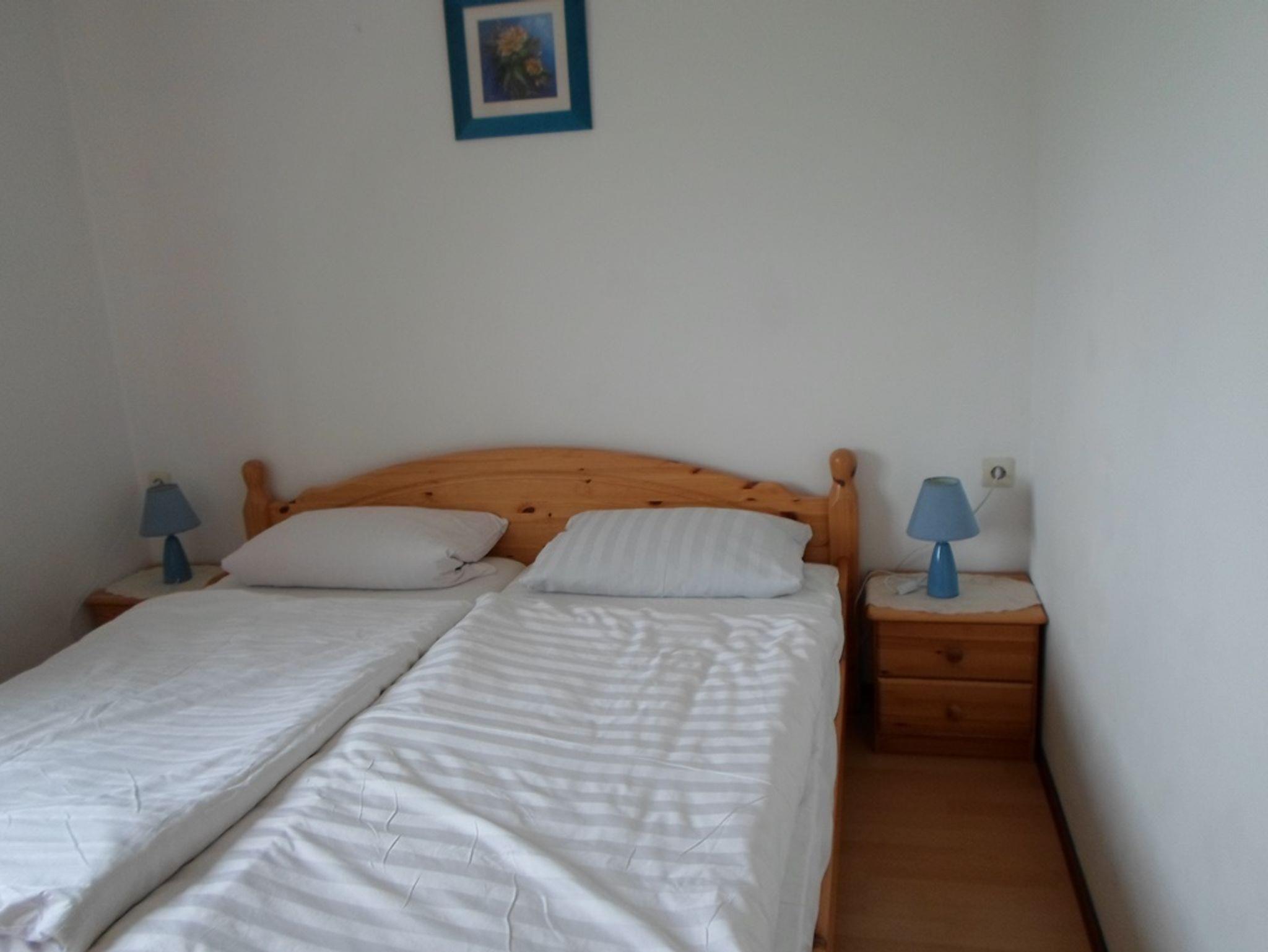 Ferienwohnung im 1.OG mit 1 sep. Schlafzimmmer und zusätzlicher Schlafmöglichkeit für die 3. und 4. Person im Wohnbereich. Die Wohnung ist über ca. 15 Treppenstufen erreichbar. Bad mit Dusche, vollausgestattete Küchenzeile mit Grundausstattung an Gewürzen. Balkon mit Balkonmöbeln, Grillmöglichkeit und Siztplatz an der Terrasse am Haus.