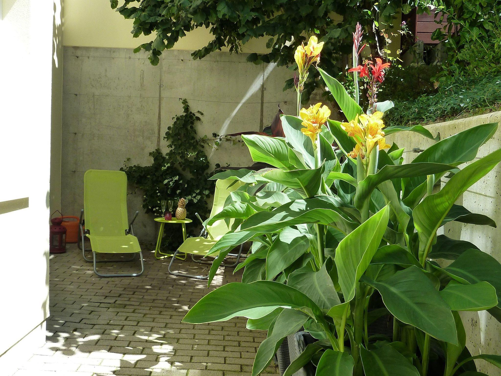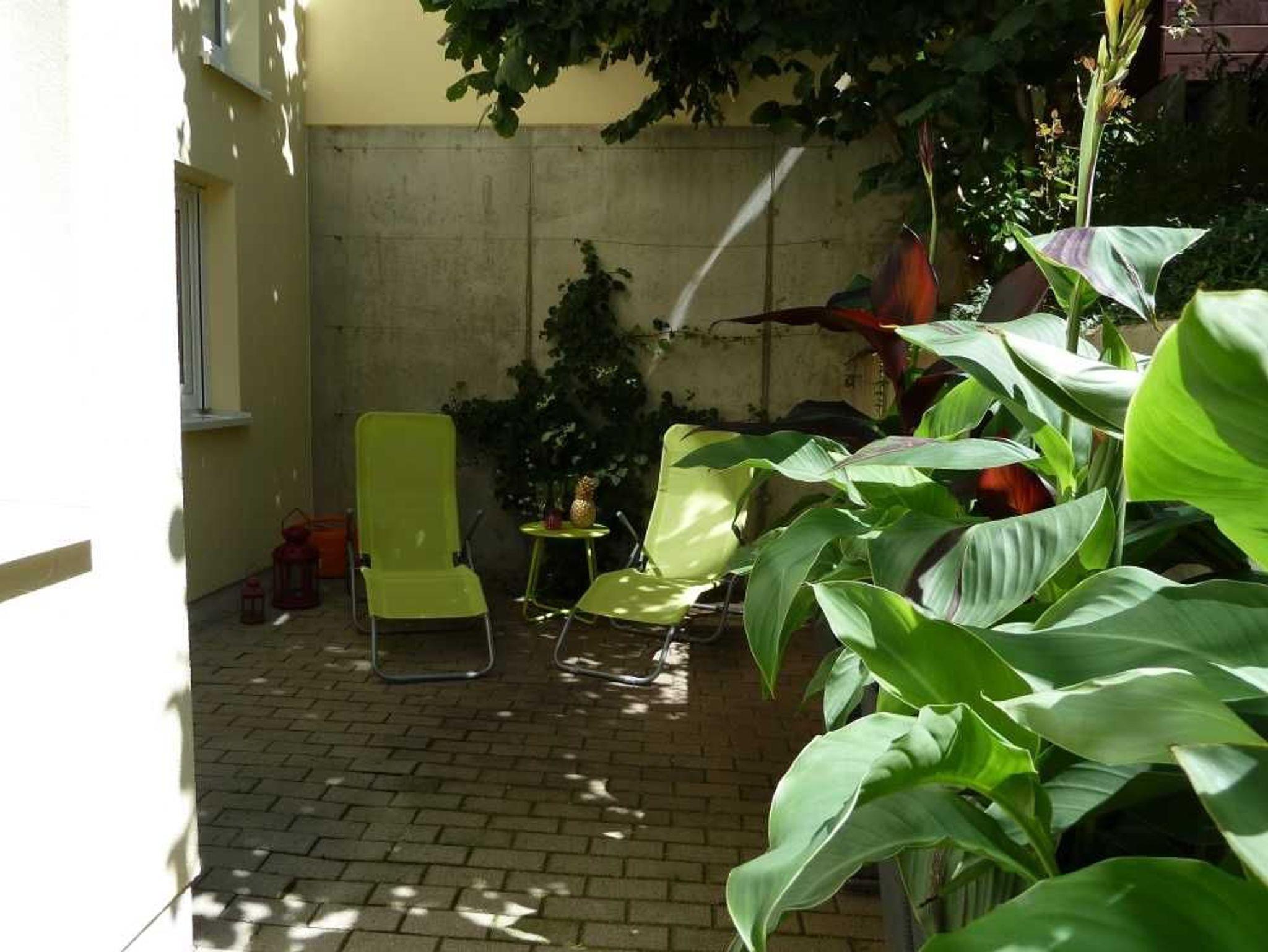 • Auf der großen privaten Terrasse können sie unterm Sonnenschirm, umgeben von viel Grün speisen, oder den Platz unterm Baum zur Entspannung nutzt.