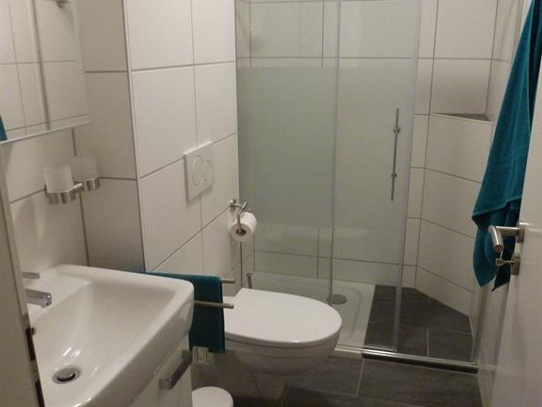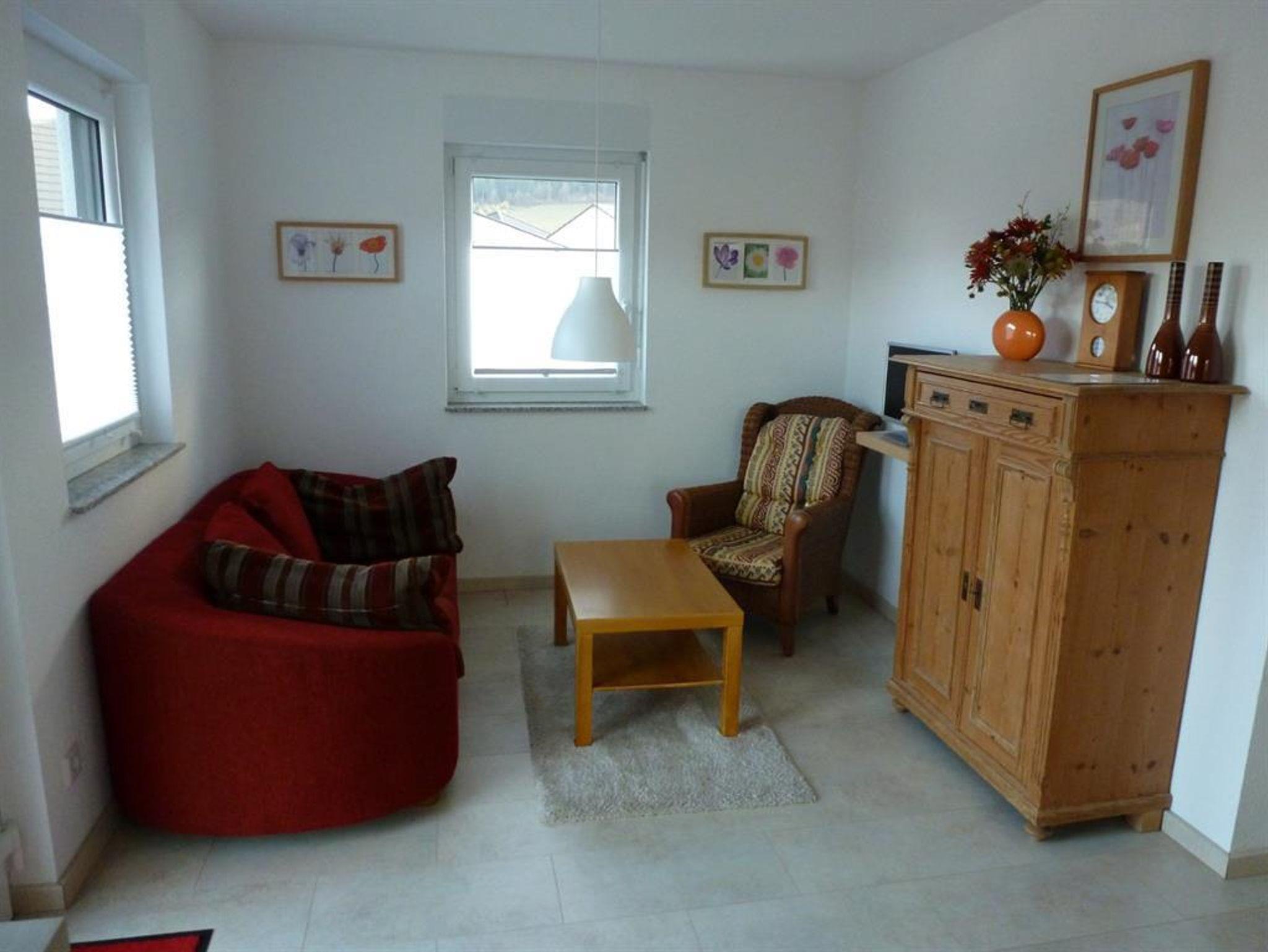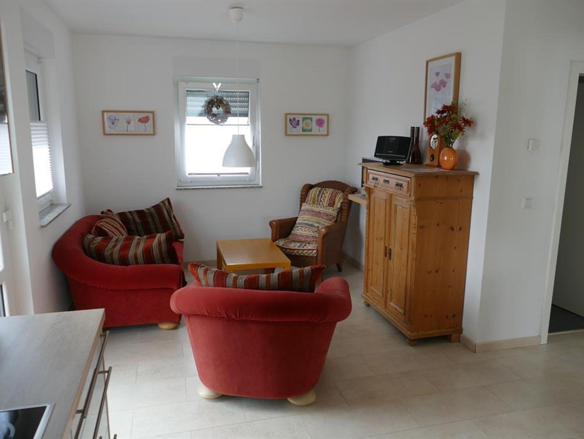 Neue Ferienwohnung (45 m²) mit komplett eingerichteter Küchenzeile mit Backofen, Ceranfeld, Mikrowelle, Geschirrspüler, Kühlschrank mit Gefrierfach, Sitzecke mit SAT-TV, DVD-Recorder und Radio/CD, 1 Doppelschlafzimmer, 1 Schlafzimmer mit Einzelbett (Bett auf Doppelbett ausziehbar für bis zu 2 Personen), Bad mit Dusche/WC.