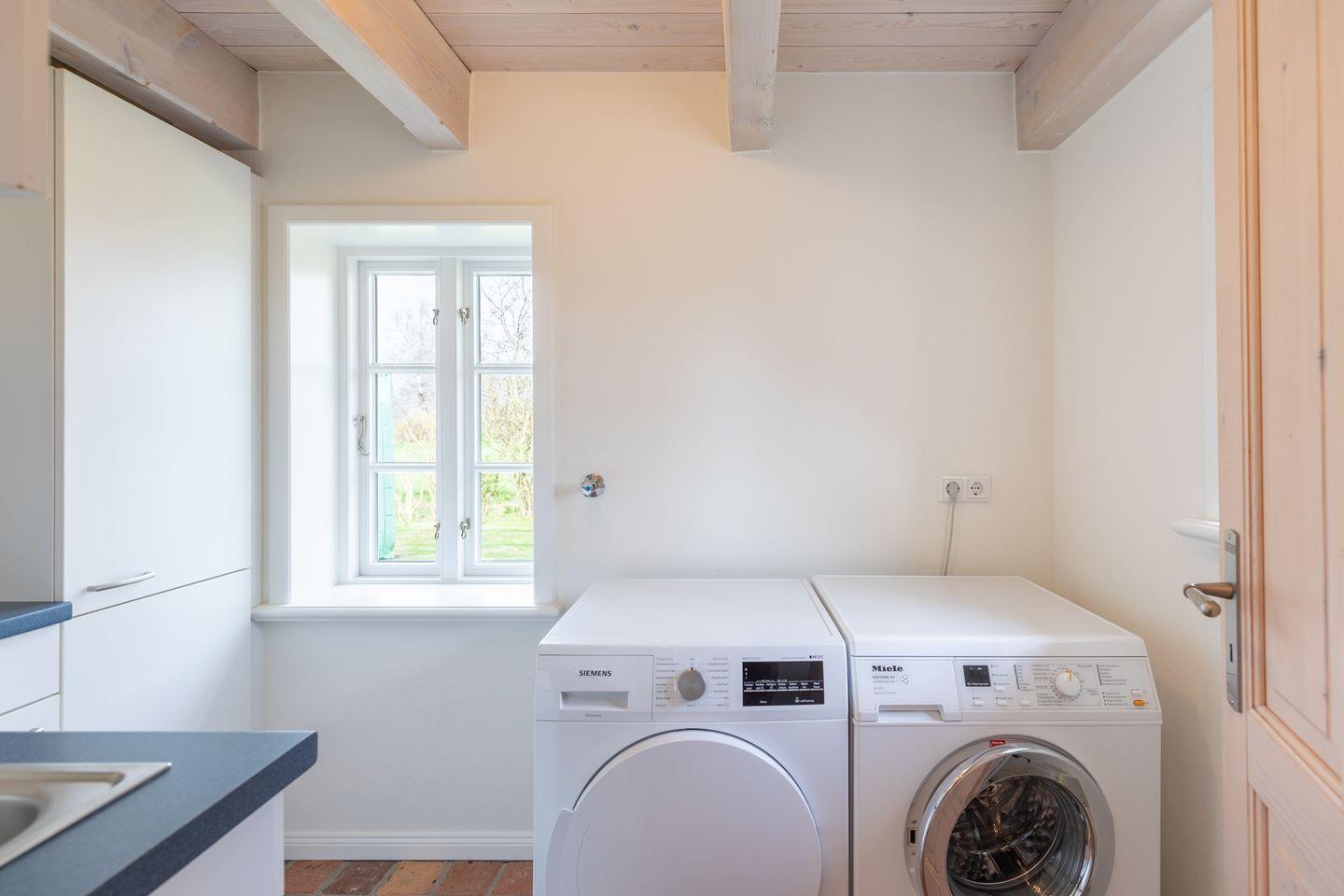 Eine Waschmaschine und ein Trockner stehen Ihnen im Hauswirtschaftraum zur Verfügung. Der liebevoll gepflegte Garten mit verschiedenen Sitzmöglichkeiten und einem Strandkorb kann genutzt werden und lädt für ein gemütliches Kaffee trinken bei sonnigem Wetter ein!