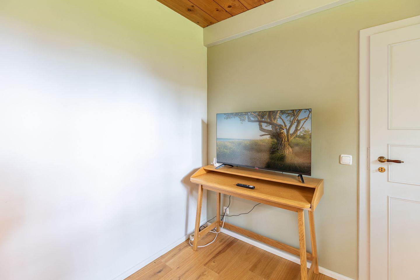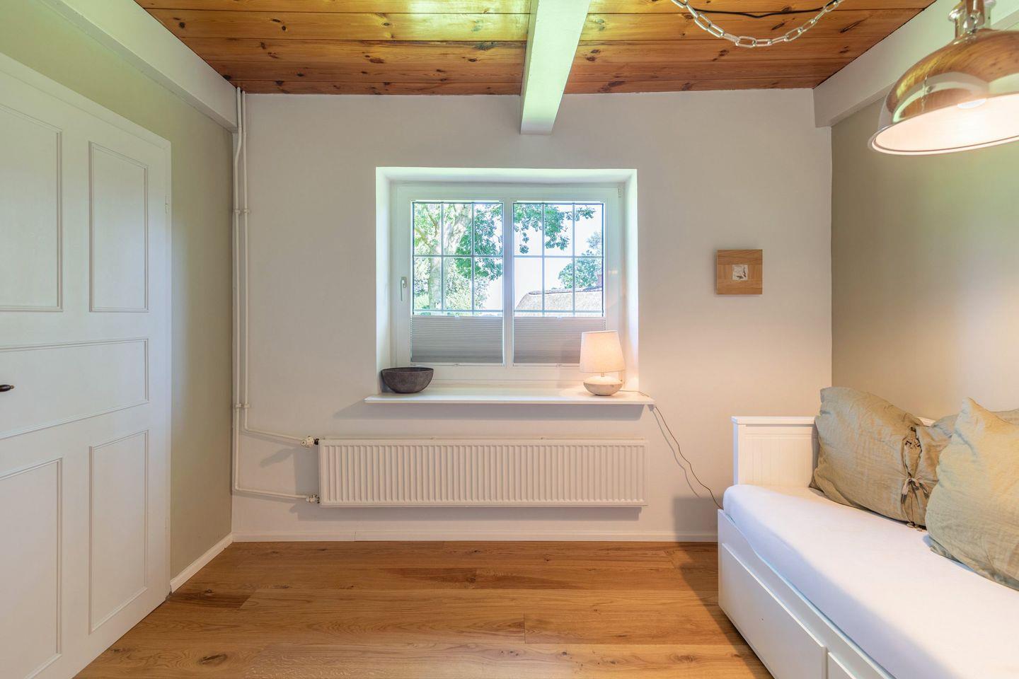 Das gemütliche Wohnzimmer ist mit einem schwedischen Holzofen ausgestattet und lädt zu entspannten Abenden bei knisterndem Kaminfeuer ein. Von hier aus haben Sie direkten Zugang zur sonnigen Westterrasse, wo Sie die Weite der nordfriesischen Landschaft bei einem Glas Wein oder einer Tasse Tee genießen können. Das Schlafzimmer ist mit einem komfortablen Doppelbett (170 x 200 cm) und einem geräumigen Kleiderschrank ausgestattet, während das zweite Schlafzimmer ein Einzelbett (90 x 200 cm) sowie einen Schreibtisch mit Fernseher bietet – ideal für Gäste, die auch im Urlaub gelegentlich arbeiten möchten.