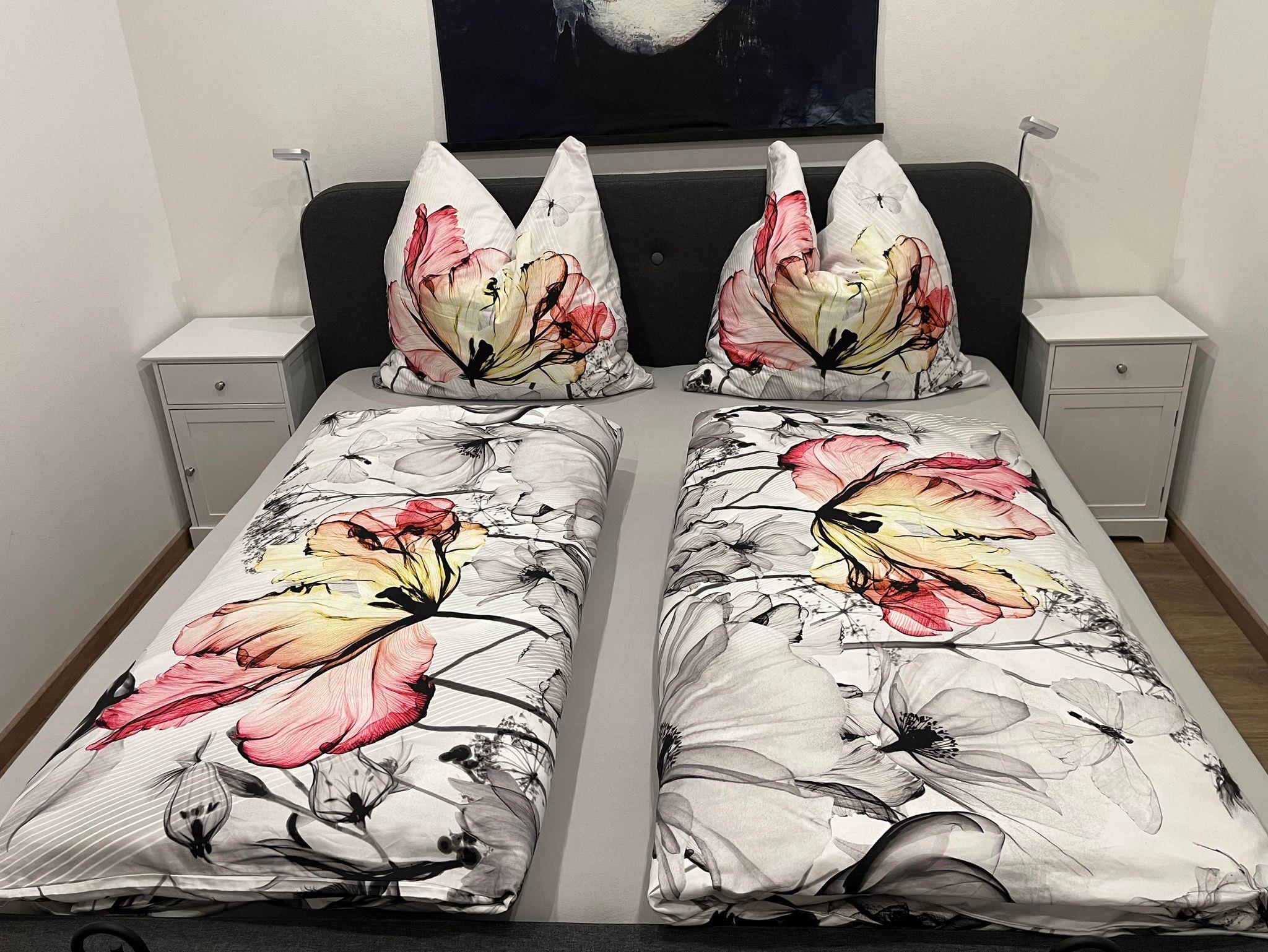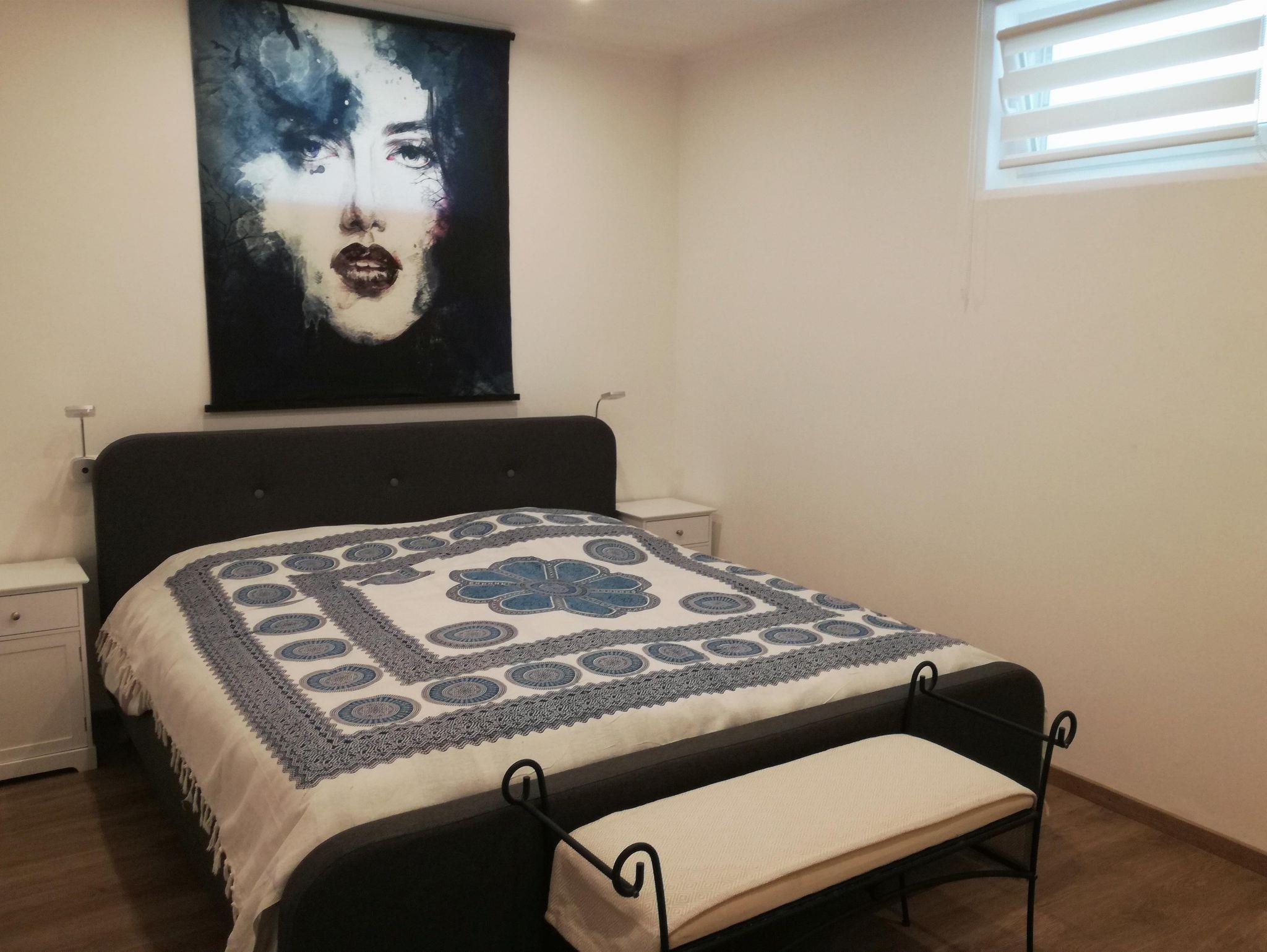 Wir bieten Ihnen ein Schlafzimmer mit einem großen Standard Doppelbett (1,80x2,00 m). Es ist möglich, ein kleines Kinderbett in diesem Raum zuzustellen. Außerdem gibt es für eine weitere Person eine ausklappbare, hochwertige Schlafcouch im Wohnzimmer.