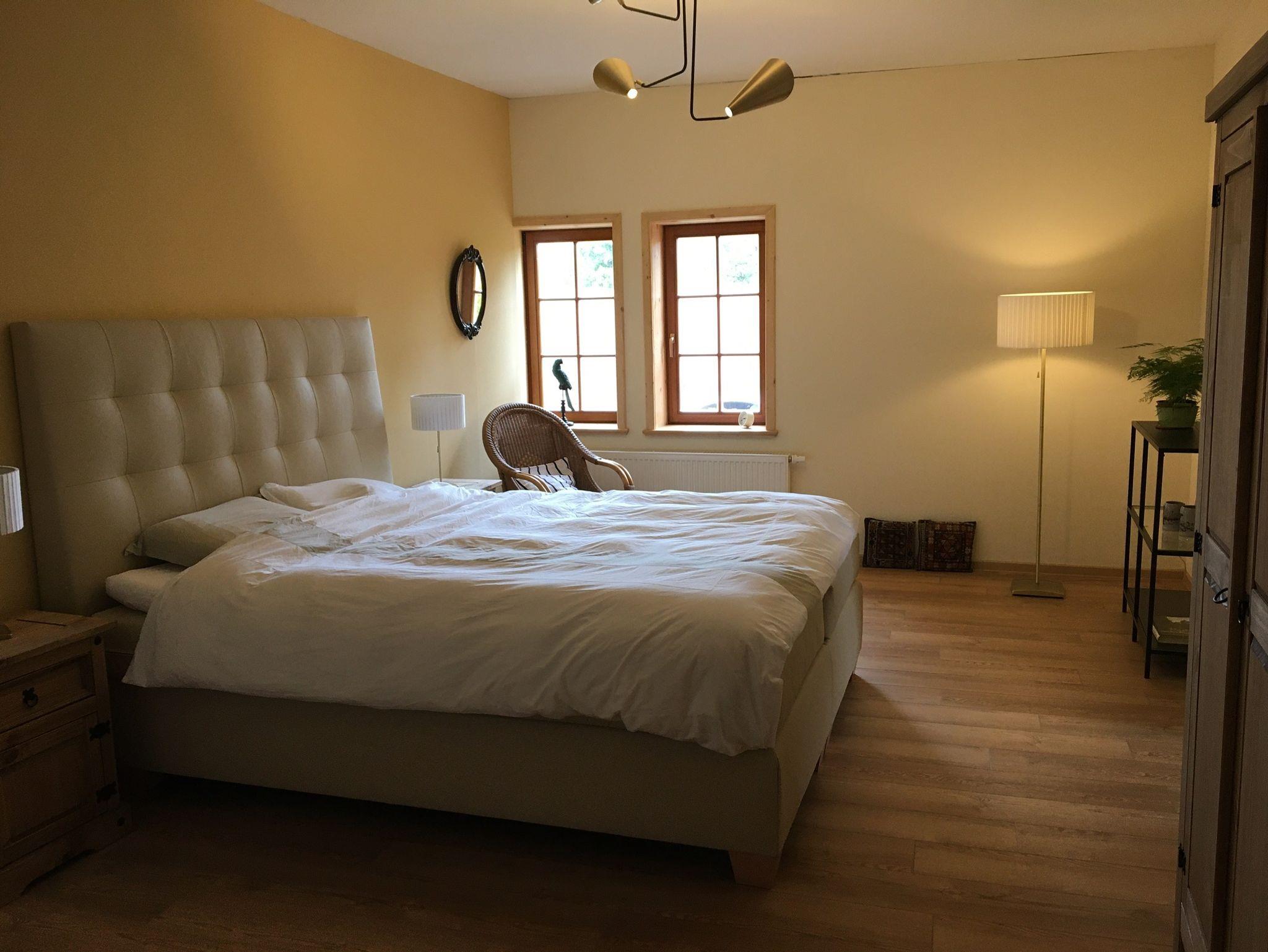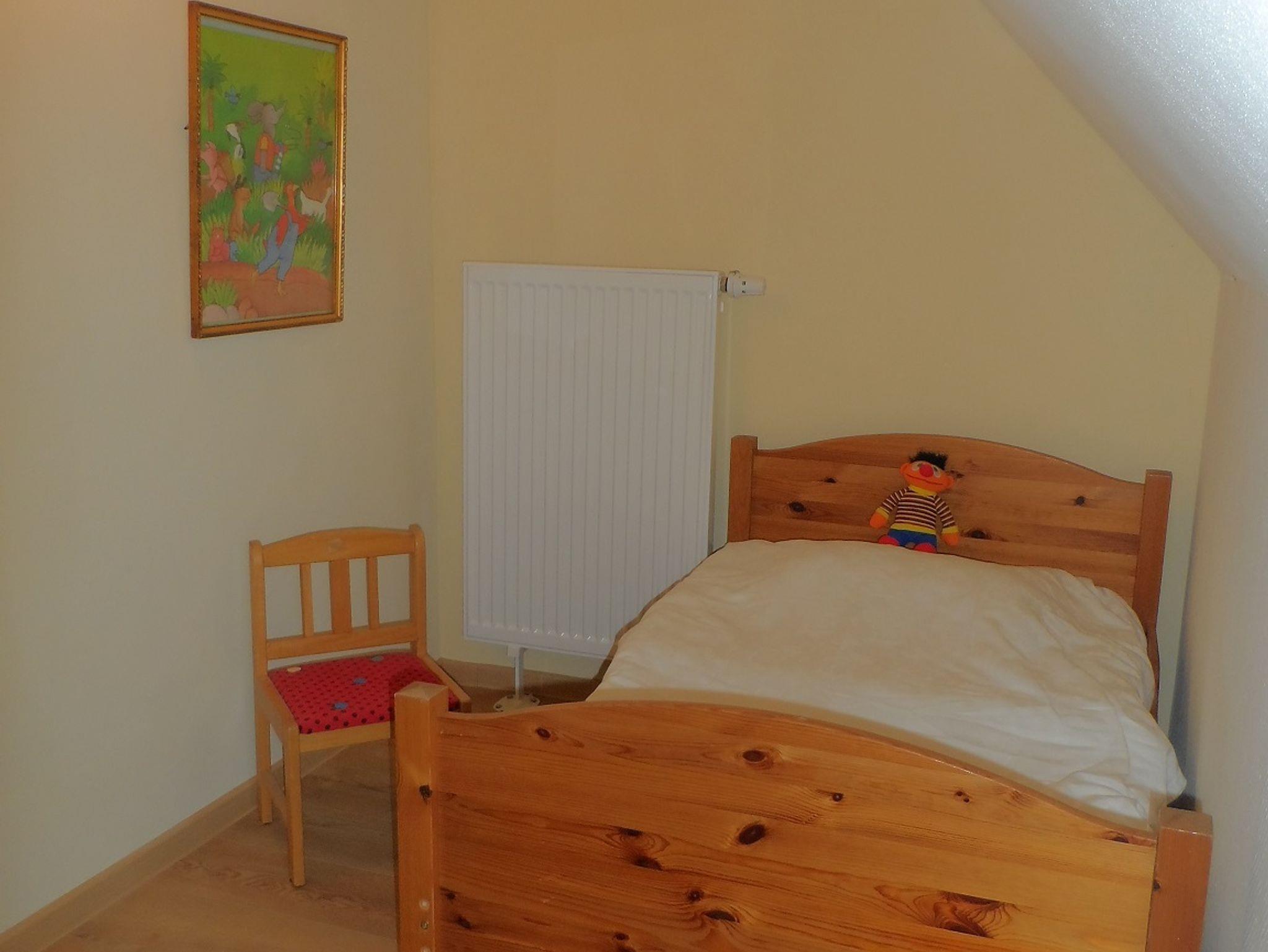 Das Bett im Schlafzimmer ist 220cm lang. Ein (Kinder-)Bett (Breite:80cm und Länge: bis 200cm steht in einen kleinen Nebenraum neben dem Schlafzimmer. Da gibt es auch der Tür zum Badezimmer.