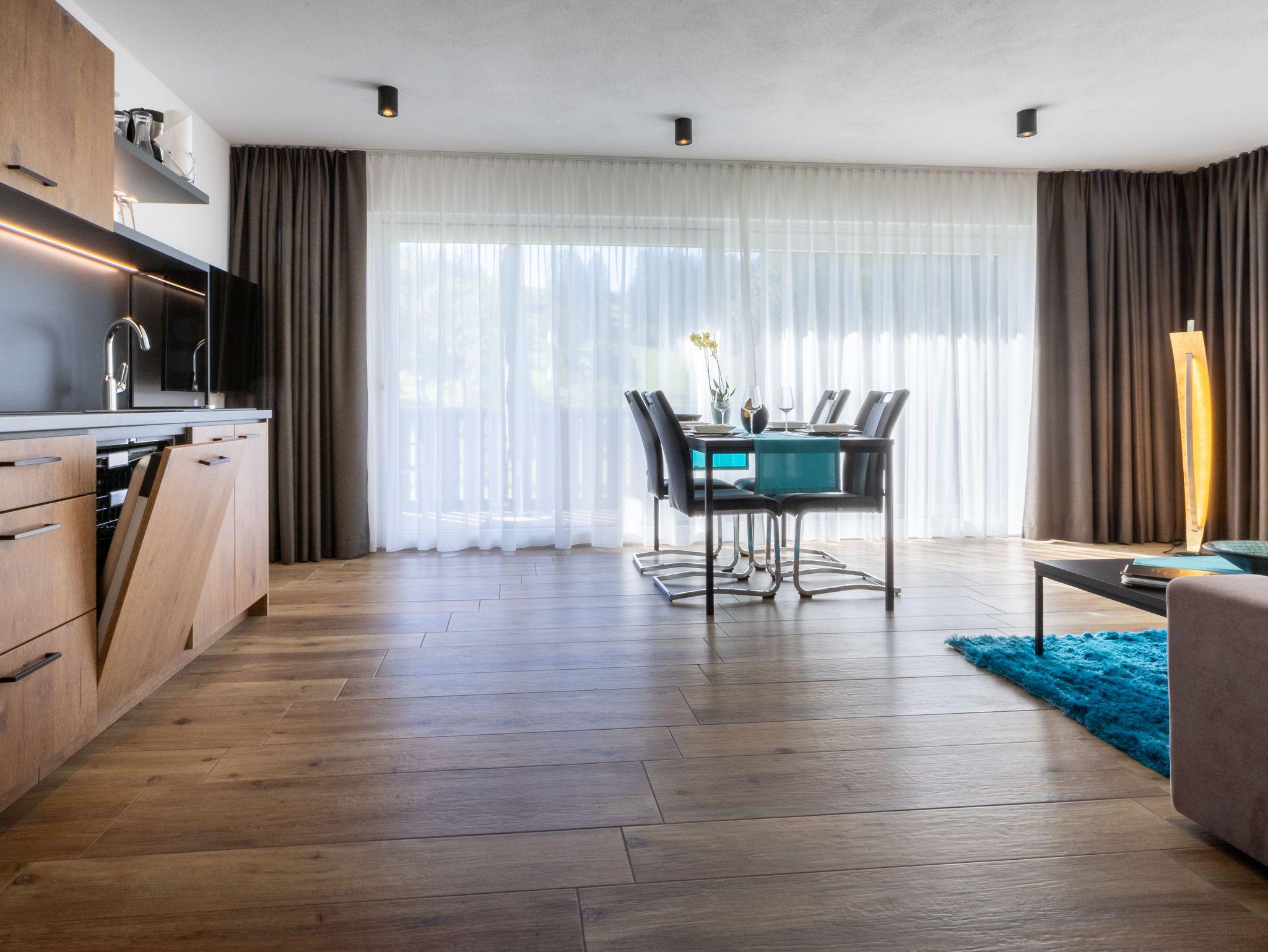 Mit effizient gestalteten Schlafzimmern mit zum Teil bodentiefen Fenstern und Boxspringbetten, modern gestalteten Bädern mit Regendusche, offen gehaltenem Flur, Wohn- und Essbereichen lässt es sich wunderbar entspannen und dem Alltag entfliehen. Unser dezentrales Lüftungssystem realisiert den geforderten Luftwechsel und sorgt für einen behaglichen und gesunden Luftumtausch in allen Appartements. Alle Appartements sind mit WLAN und TV-Flatscreen in allen Wohn- und Schlafzimmern ausgestattet und über einen Personenaufzug von der Tiefgarage bis zum Dachgeschoss erreichbar.
