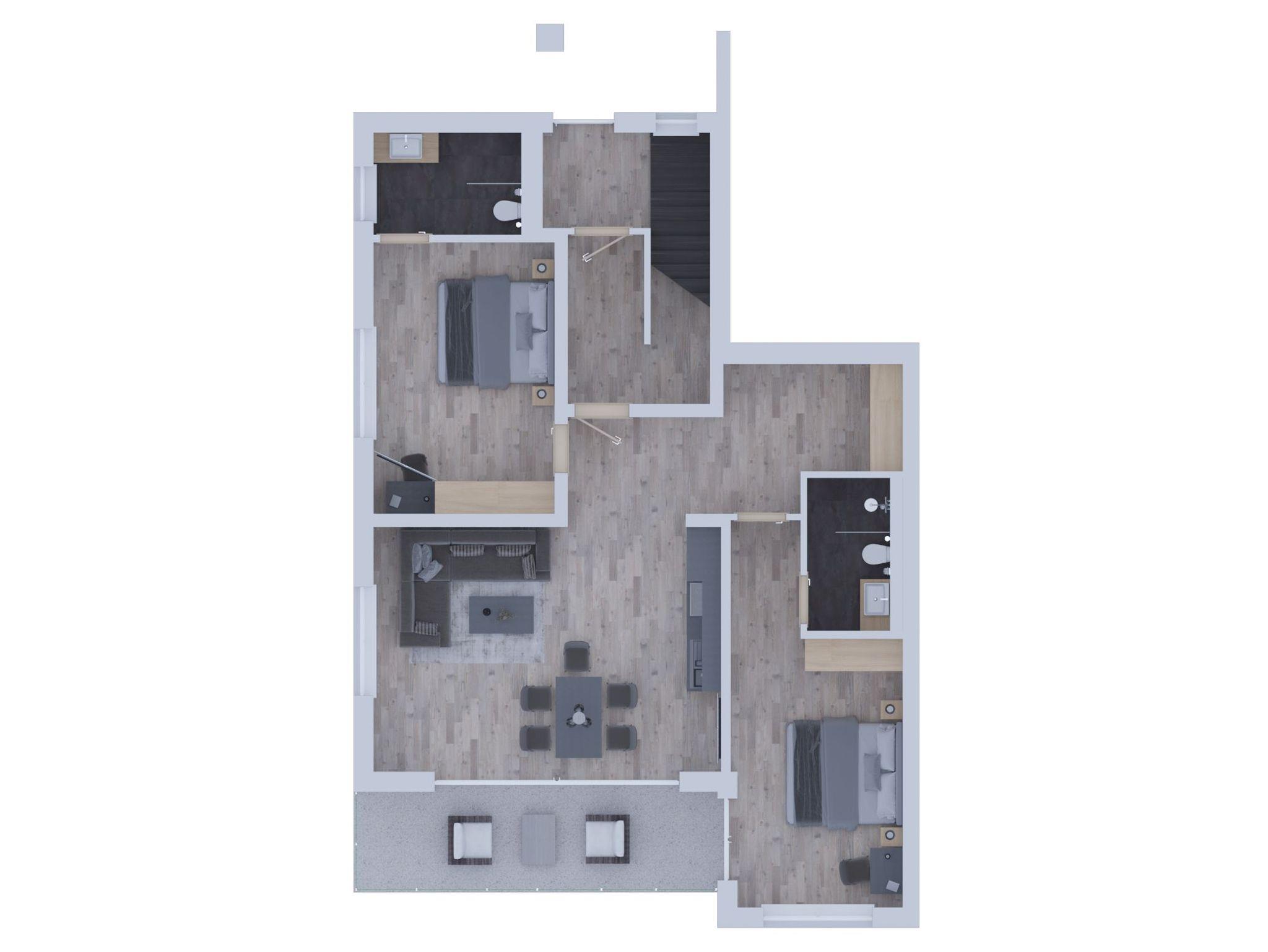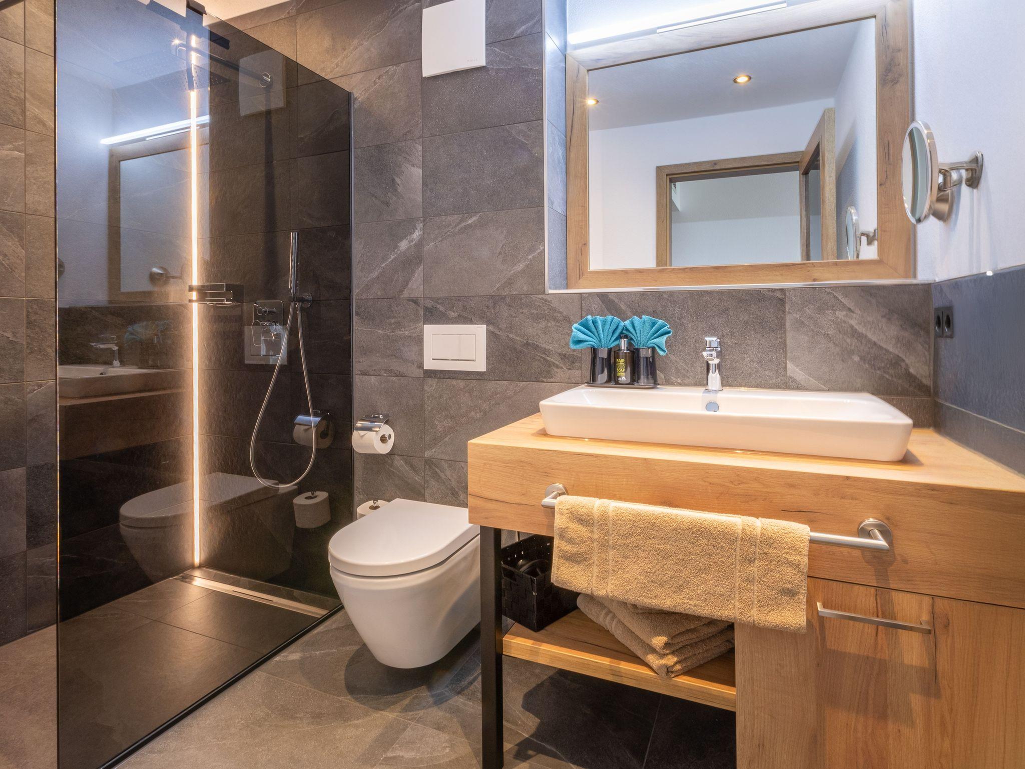 Die Wohnung verfügt über 4 Badezimmer, jeweils ausgestattet mit einer modernen Regendusche und hochwertigen Annehmlichkeiten wie Handtücher, Kosmetikspiegel und einem Föhn. Zwei komplett ausgestattete Küchen ermöglichen eine flexible Selbstversorgung.