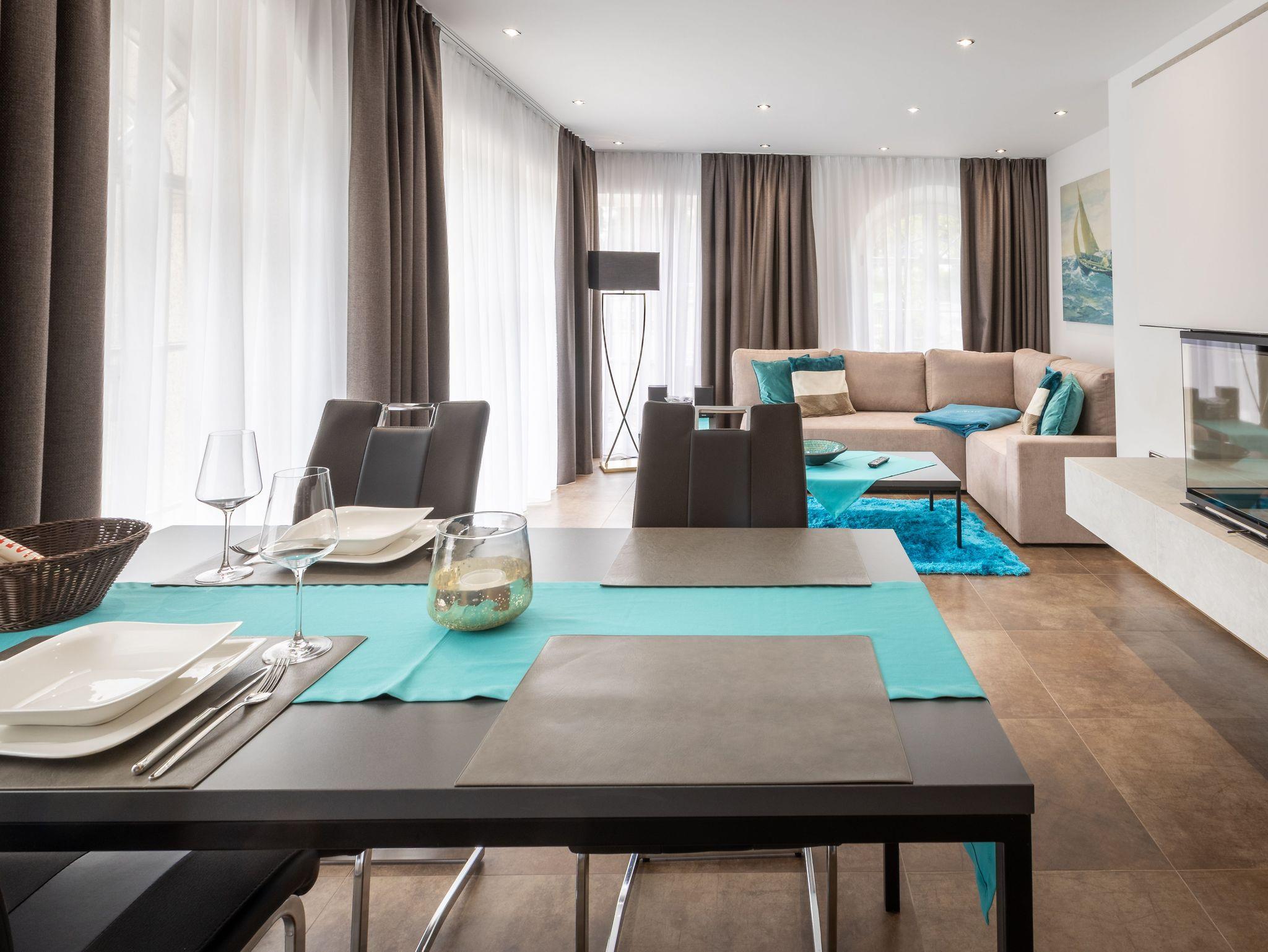 Mit effizient gestalteten Schlafzimmern mit zum Teil bodentiefen Fenstern und Boxspringbetten, modern gestalteten Bädern mit Regendusche, offen gehaltenem Flur, Wohn- und Essbereichen lässt es sich wunderbar entspannen und dem Alltag entfliehen. Unser dezentrales Lüftungssystem realisiert den geforderten Luftwechsel und sorgt für einen behaglichen und gesunden Luftumtausch in allen Appartements. Alle Appartements sind mit WLAN und TV-Flatscreen in allen Wohn- und Schlafzimmern ausgestattet und über einen Personenaufzug von der Tiefgarage bis zum Dachgeschoss erreichbar.