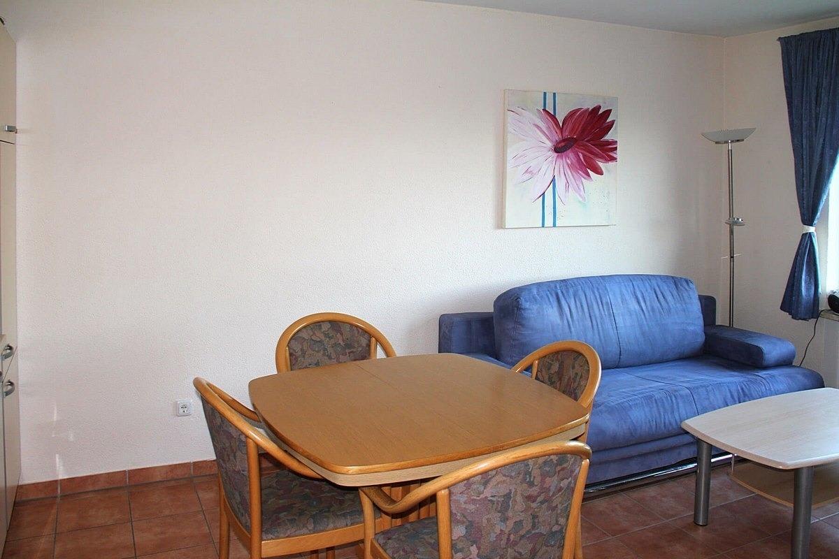 Sie enthält eine geräumige Wohnküche mit Schlafcouch und Essgruppe, TV, DVD-Player und ein schöner Süd-Balkon mit Panoramablick und Sitzmöbeln.
