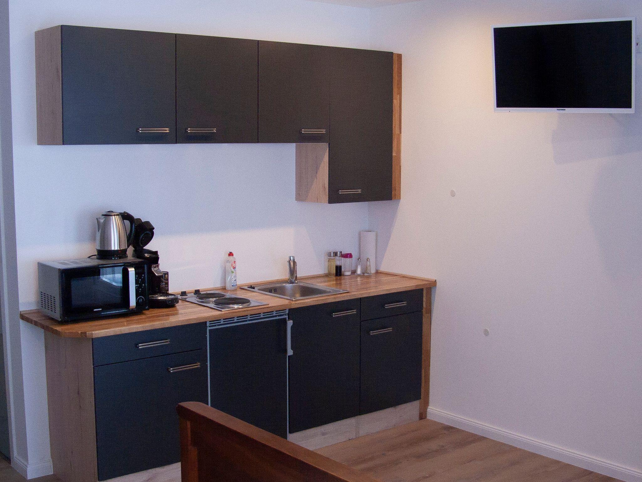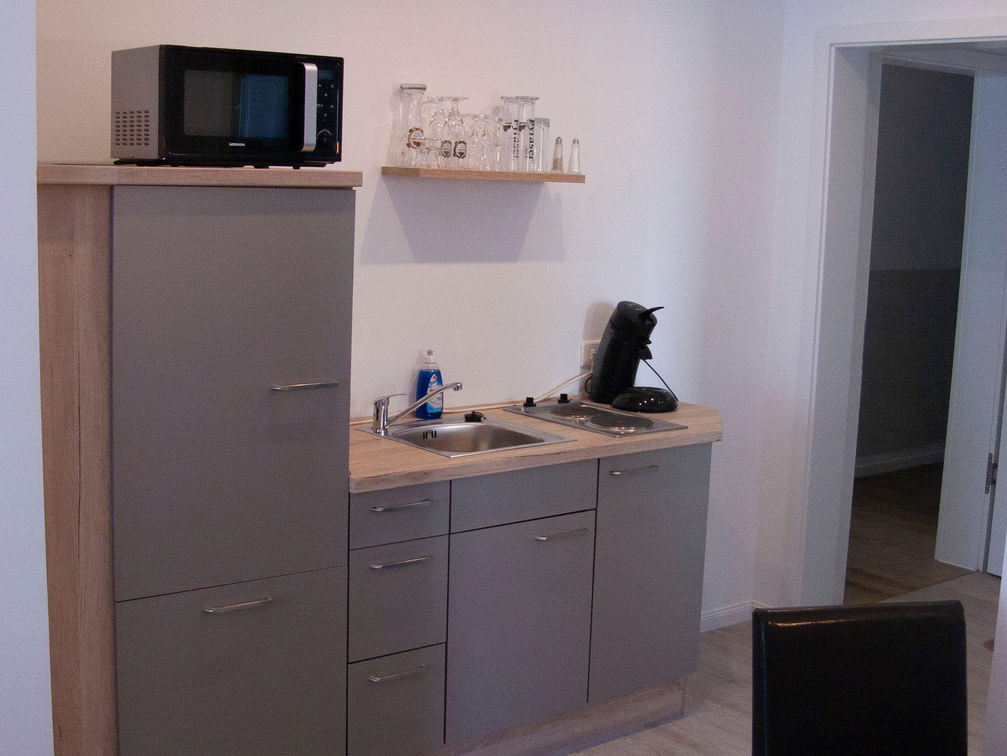 In der Küchenzeile ist alles soweit vorhanden was man normalerweise benötigt ( Senseo Maschine, Wasserkocher, Toster, Mikrowelle, Tassen, Teller, Besteck, Töpfe, Pfanne, Geschirrtuch, Zewa).
