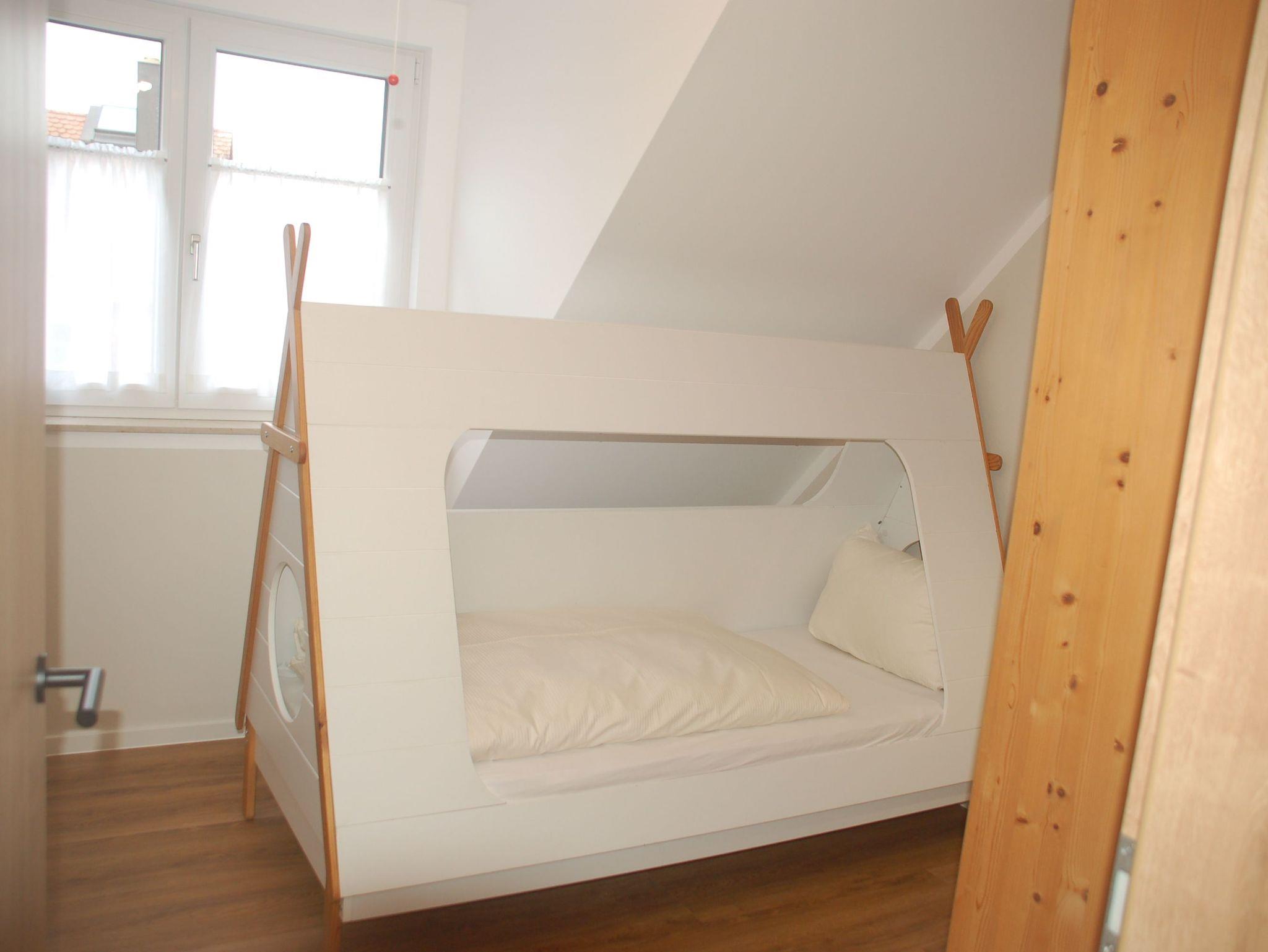 Im Kinderschlafzimmer freuen sich unsere kleinen Gäste auf ein Tipibett (200 x 90 cm). Ein zweites Bett mit ebenfalls 200 x 90 cm komplettiert die Kinderzimmerausstattung.