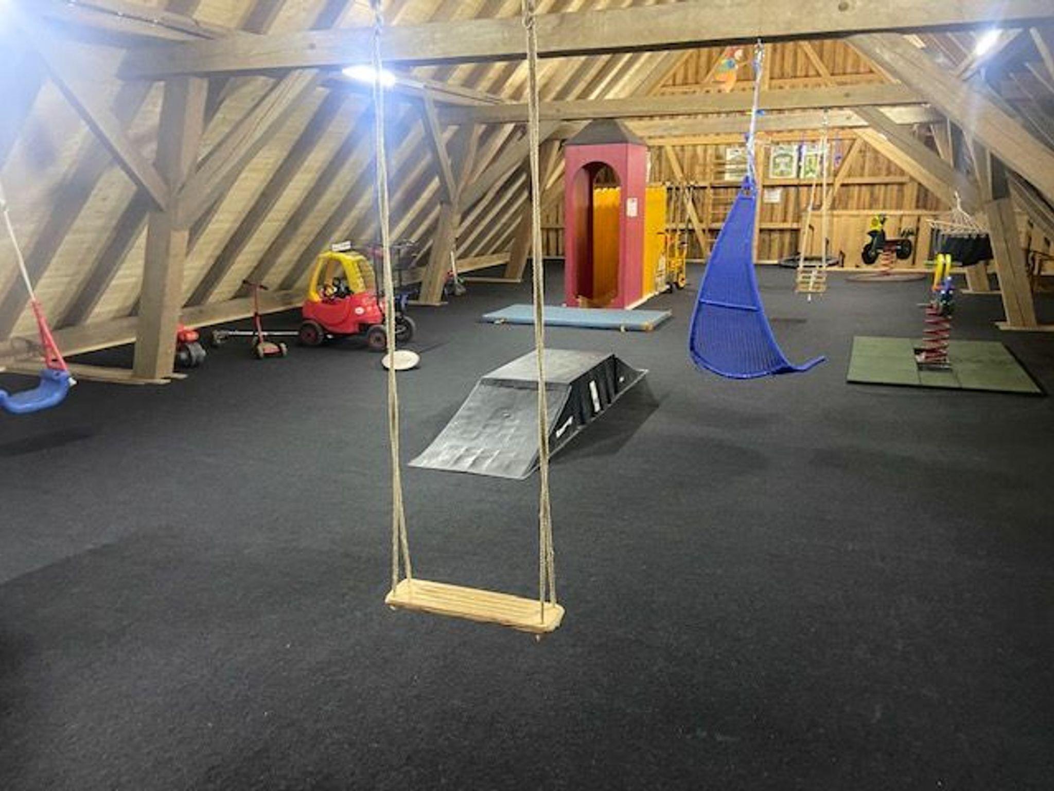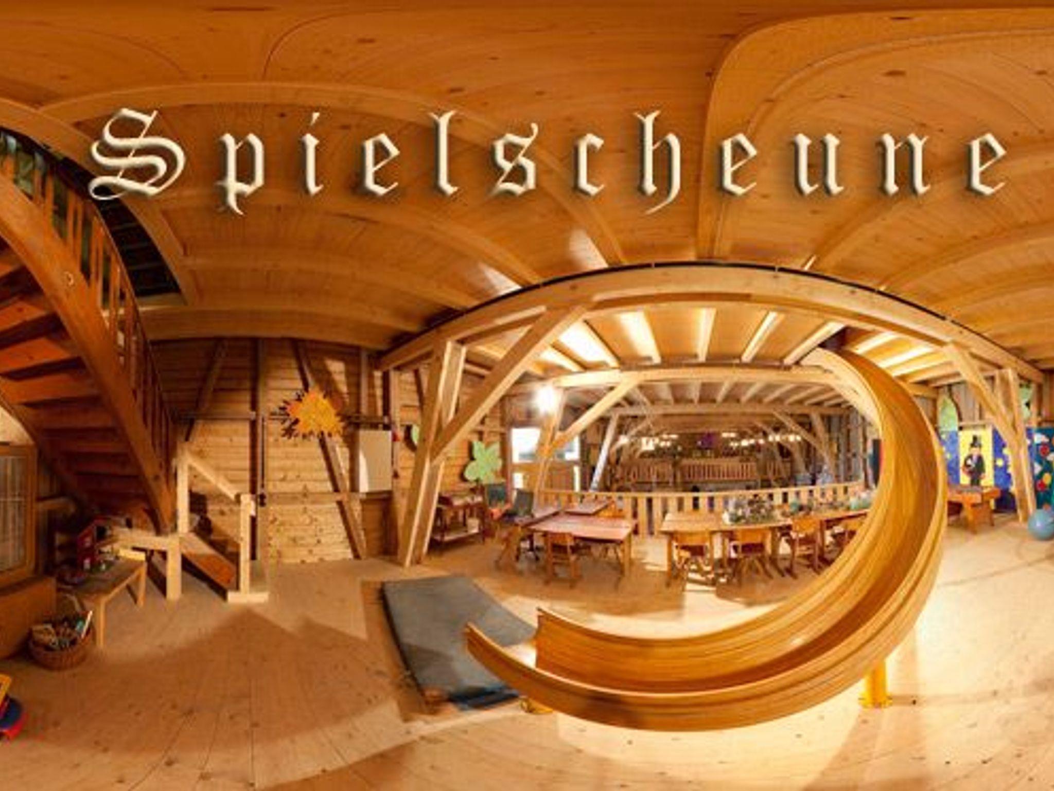 Bei schlechtem Wetter bietet die Spielscheune mit großer Rutsche und vielen Spielmöglichkeiten einen trockenen Platz zum Toben.