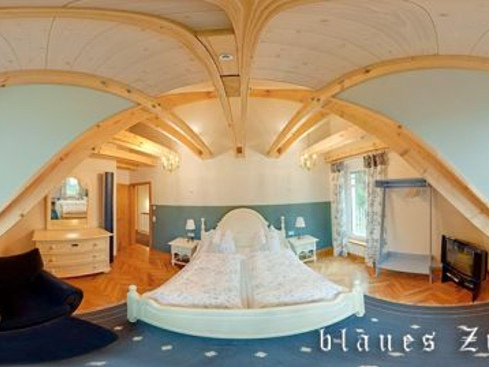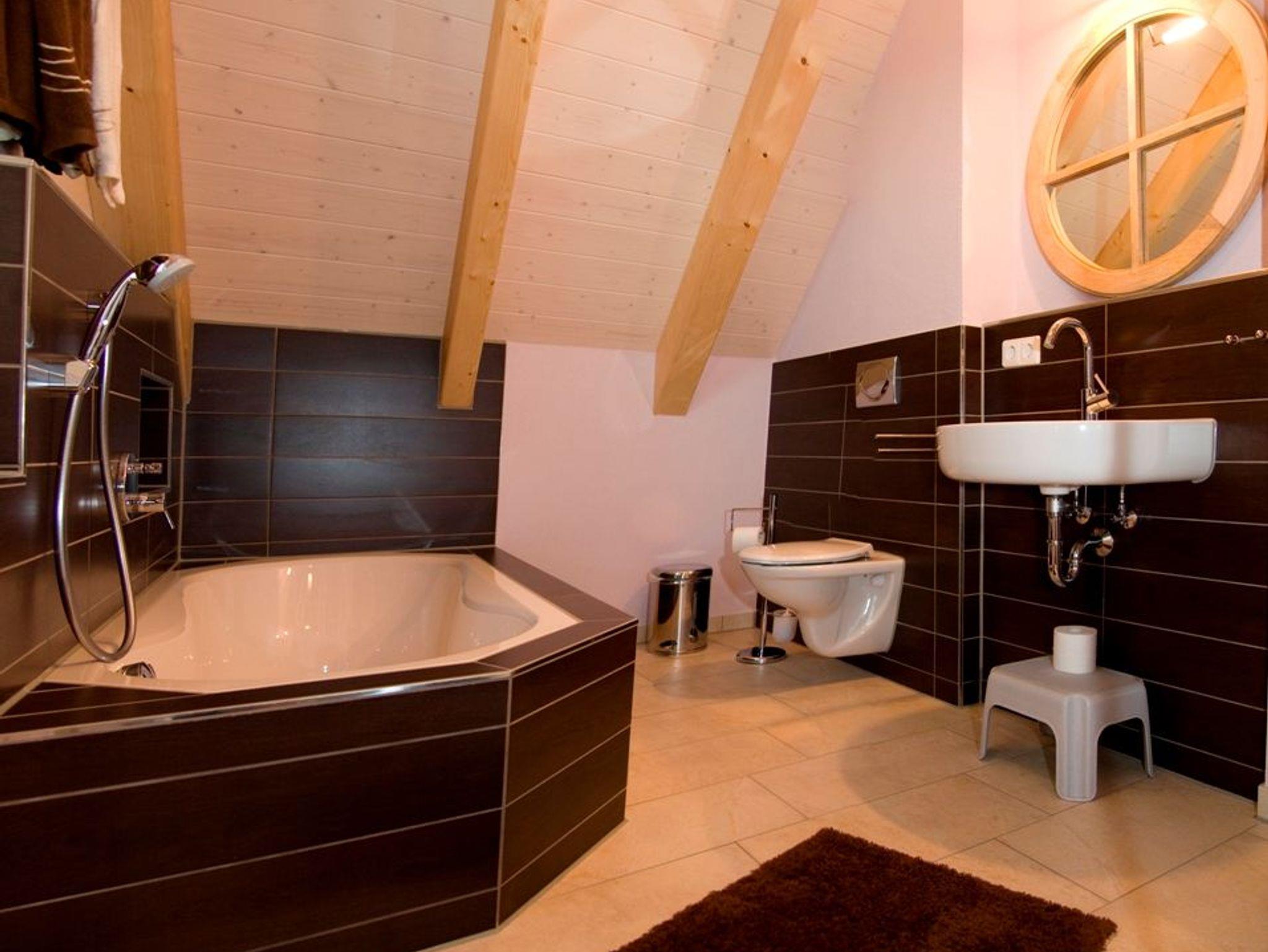 Im Erdgeschoss befindet sich neben dem Wohnbereich noch ein Schlafzimmer, desse Einelbetten zu einem Doppelbett zusammen geschoben werden können. Direkt gegenüber hat das Ergeschossbad eine ebenerdige Dusche sowie ein WC. Im Obergeschoss gibt es 3 weitere Schlafzimmer mit ganz unterschriedlichen Designs und Ausstattungen. Die Räume im OG reichen bis unter den Dachspitz. Sichtbares Dachgebälk und Fußbodenheizung in allen Räumen stehen für die hochwertige Ausstattung des mit 5 Sternen ausgezeichneten Mühlen-Chalets. Das Bad im OG bietet neben einer ebenerdigen Dusche auch eine Badewanne.