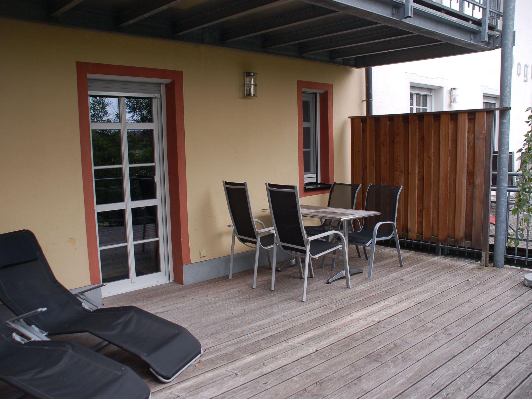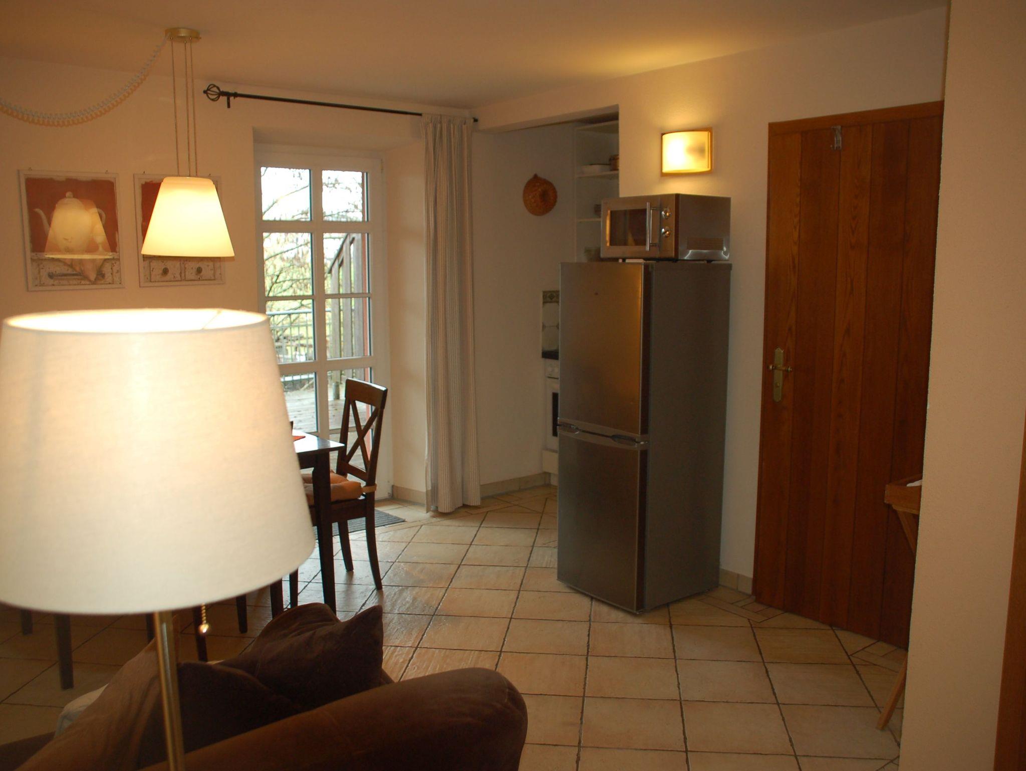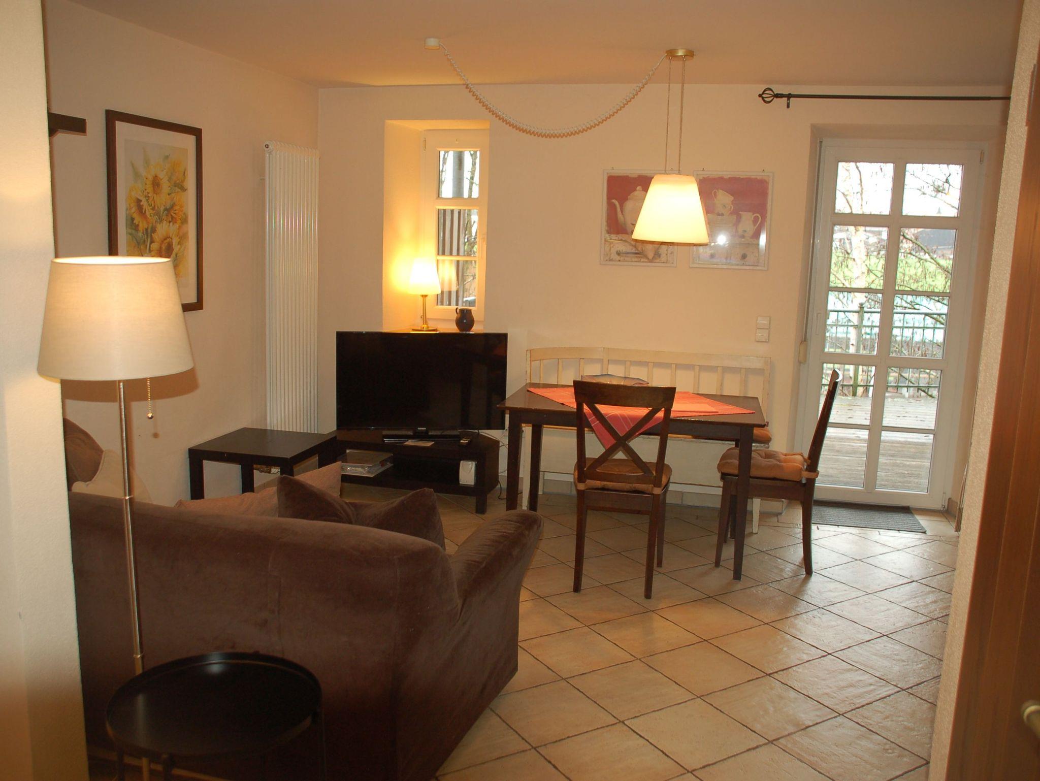 Die im ehemaligen Wohnhaus der Müller gelegene Erdgeschosswohnung verfügt über eine sehr große, zum Teil überdachte Terrasse. Von dieser haben unsere Gäste einen direkten Ausblick auf die durchfließende Biber und den Streichelzoo. Die Süd-West-Ausrichtung der Terrasse gibt die Gelegenheit Sonnenstunden entspannt zu genießen. Im Wohn-/Essbereich verfügt die Biberburg über eine funktionale und sehr gut ausgestattete Küche mit allen nötigen Elektrogeräten. Auf Wunsch können die Gäste im Mühlenbüro Raclette, Fondue oder Sandwichmaker ausleihen.