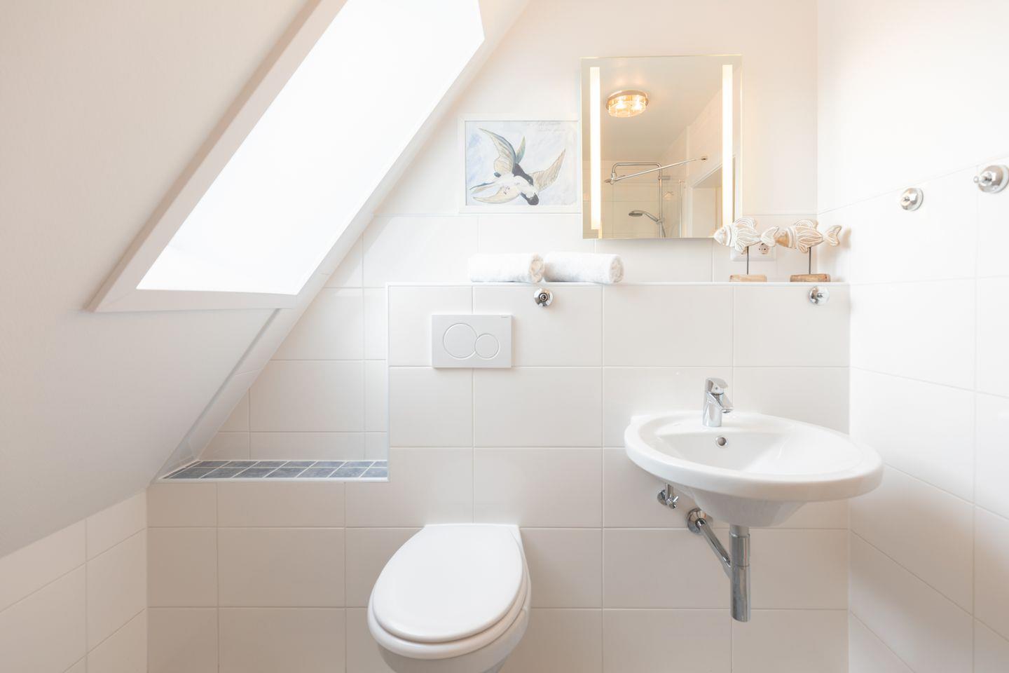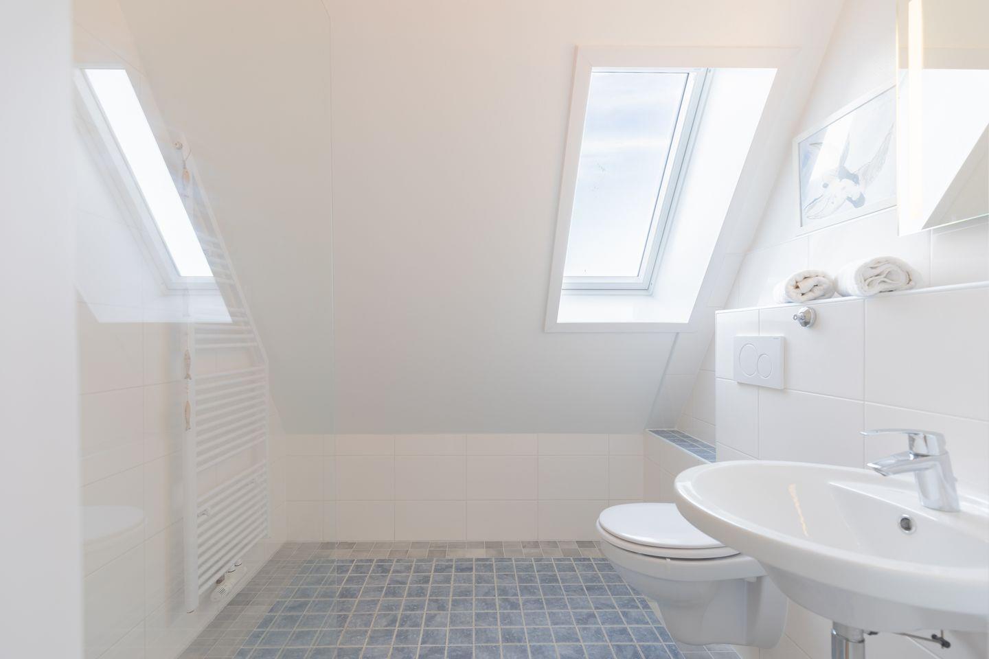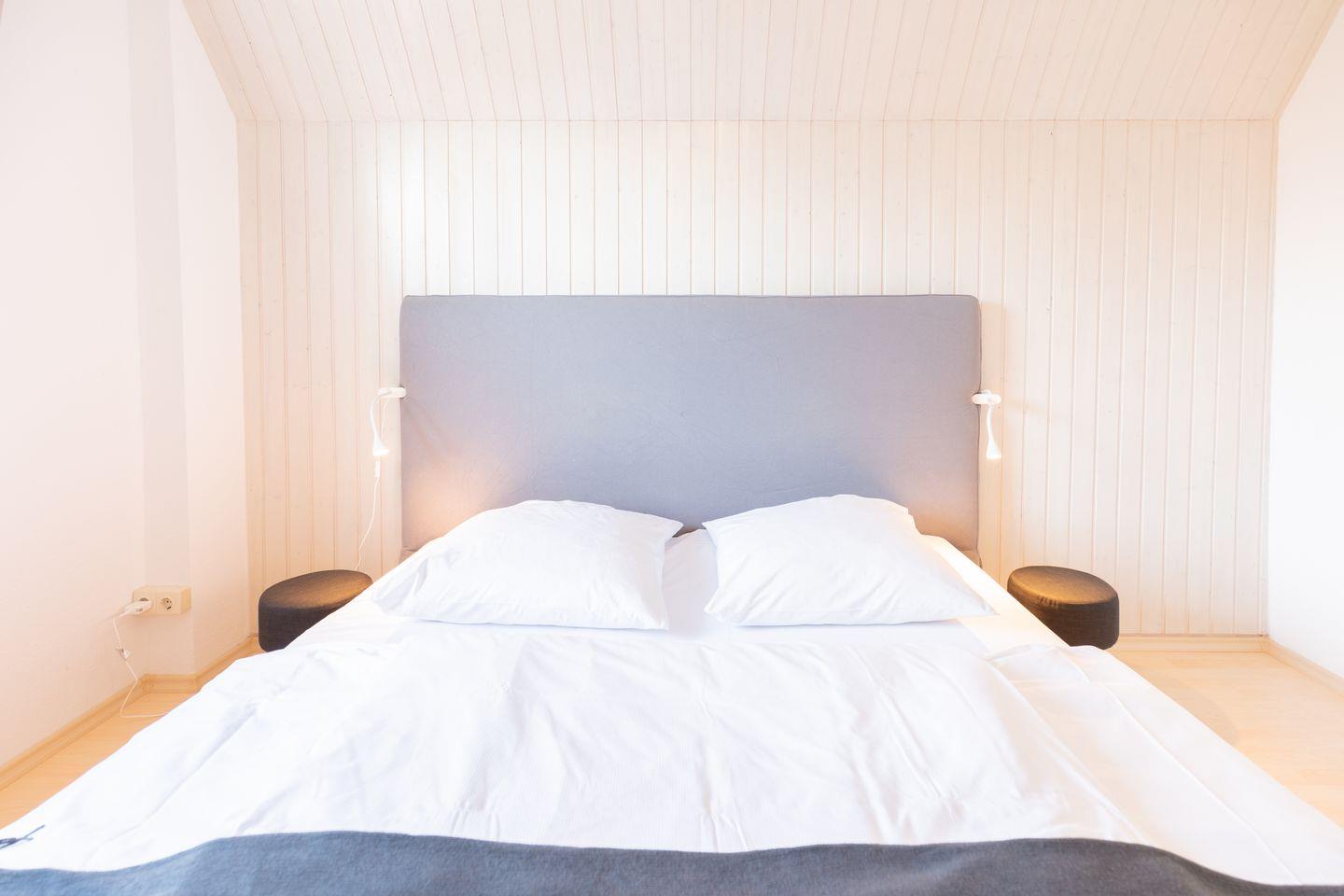 Im Obergeschoss (über eine geschlossene Holztreppe erreichbar) stehen Ihnen drei Schlafzimmer zur Verfügung: zwei mit einem Doppelbett (160 x 200, 180 x 200) und eines mit einem ausziehbaren Kojenbett (Liegefläche 180 x 200). Das chice Duschbad mit WC verwöhnt Sie mit klarem Design und viel Licht.