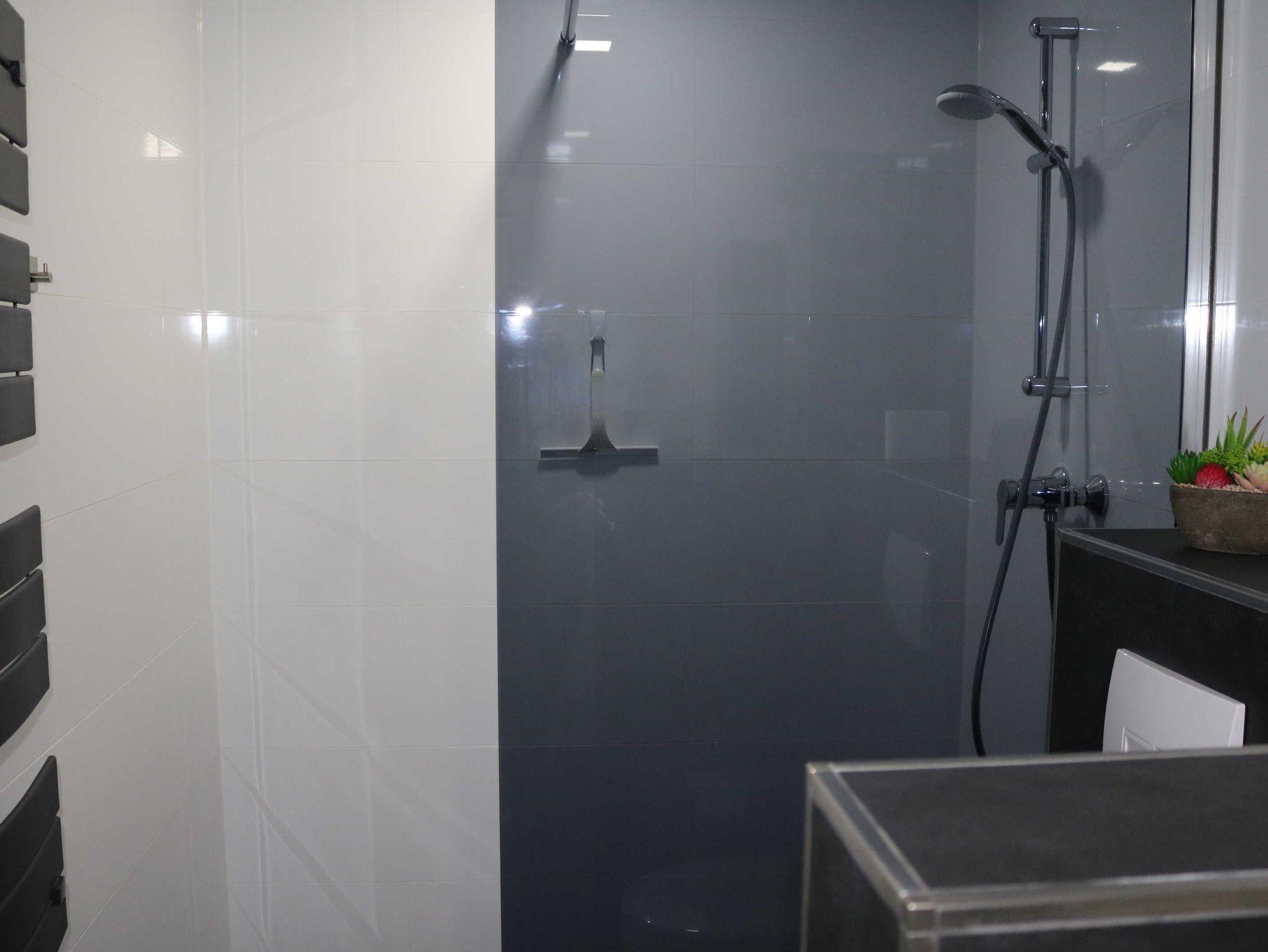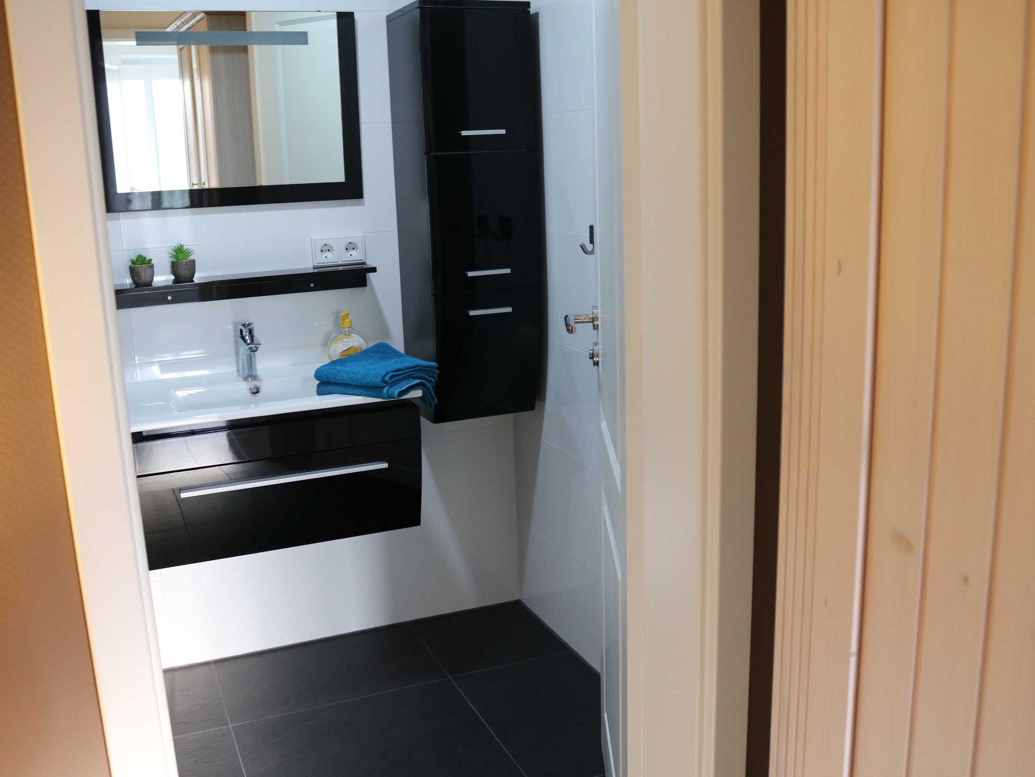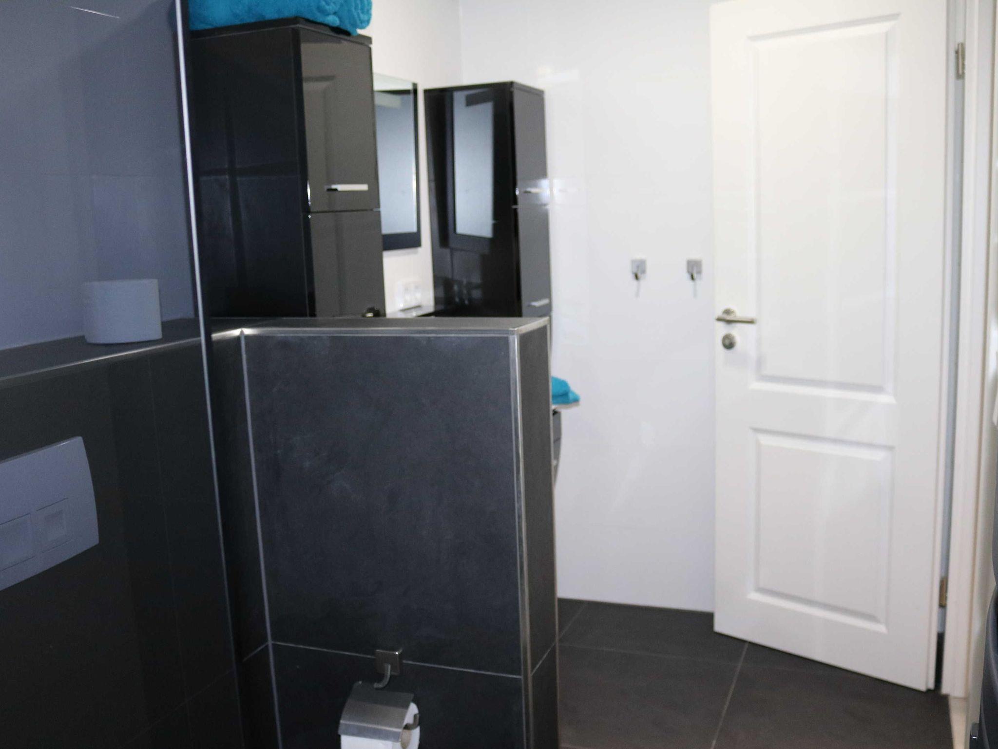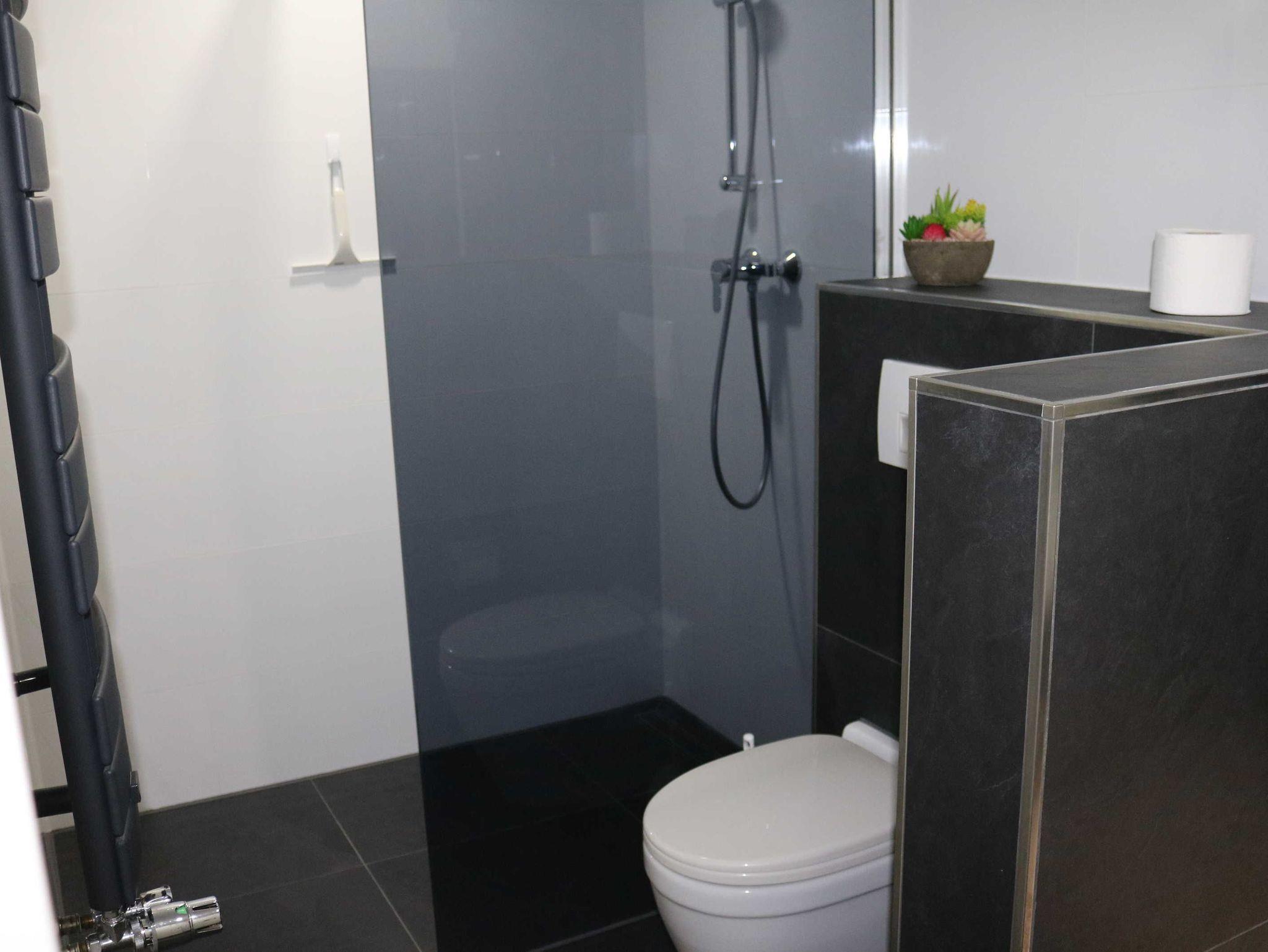 Das Badezimmer verfügt über eine ebenerdige Dusche, Toilette, Waschbecken, Fön usw. Zusätzlich gibt es noch ein Gäste-WC mit Waschbecken und Toilette.