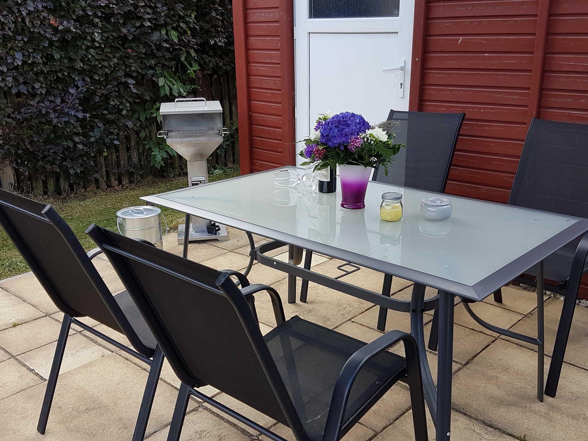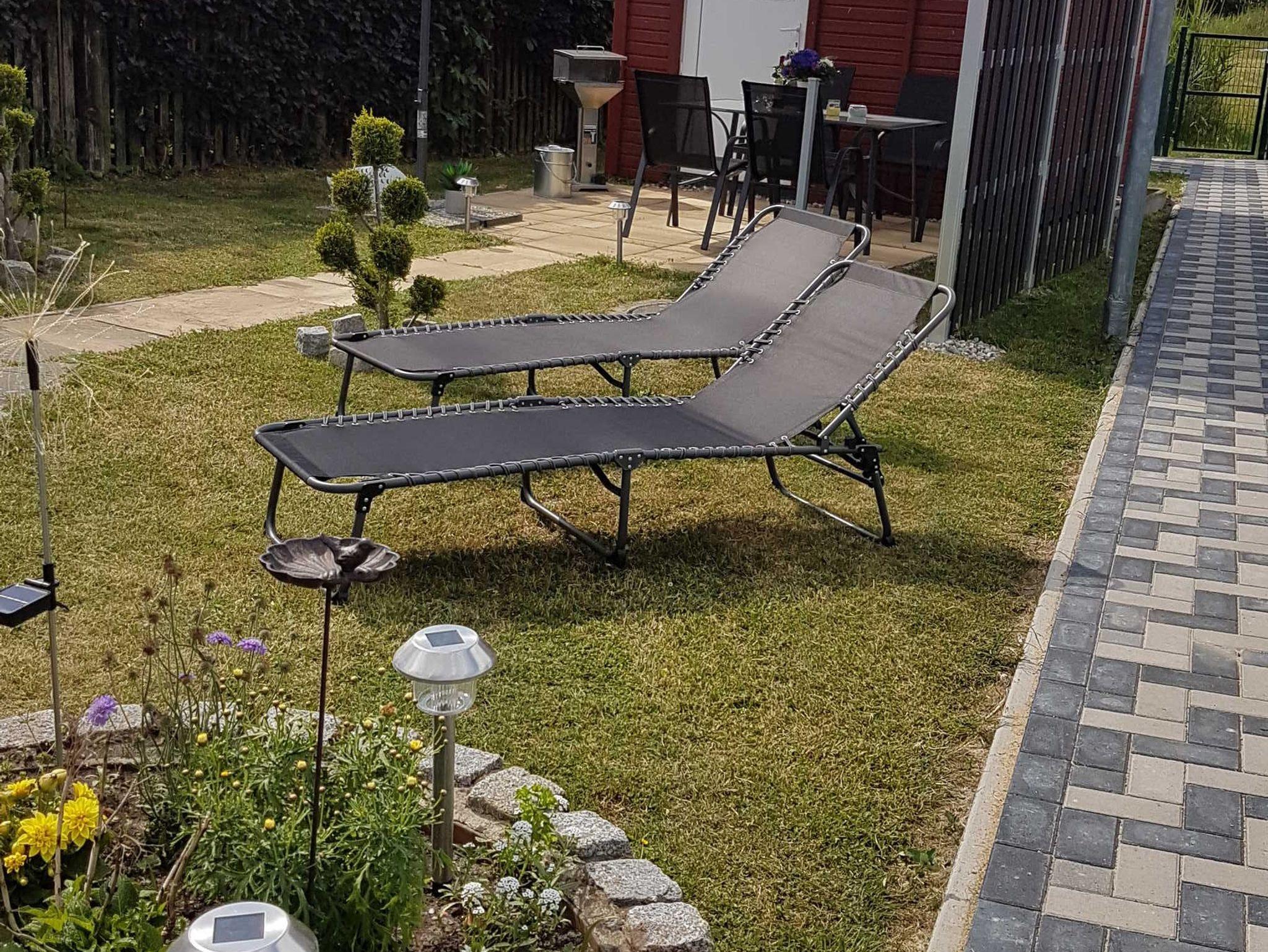 Eine Grillmöglichkeit, Sonnenliegen und eine Terrasse laden zum gemütlichen Essen und Verweilen ein.