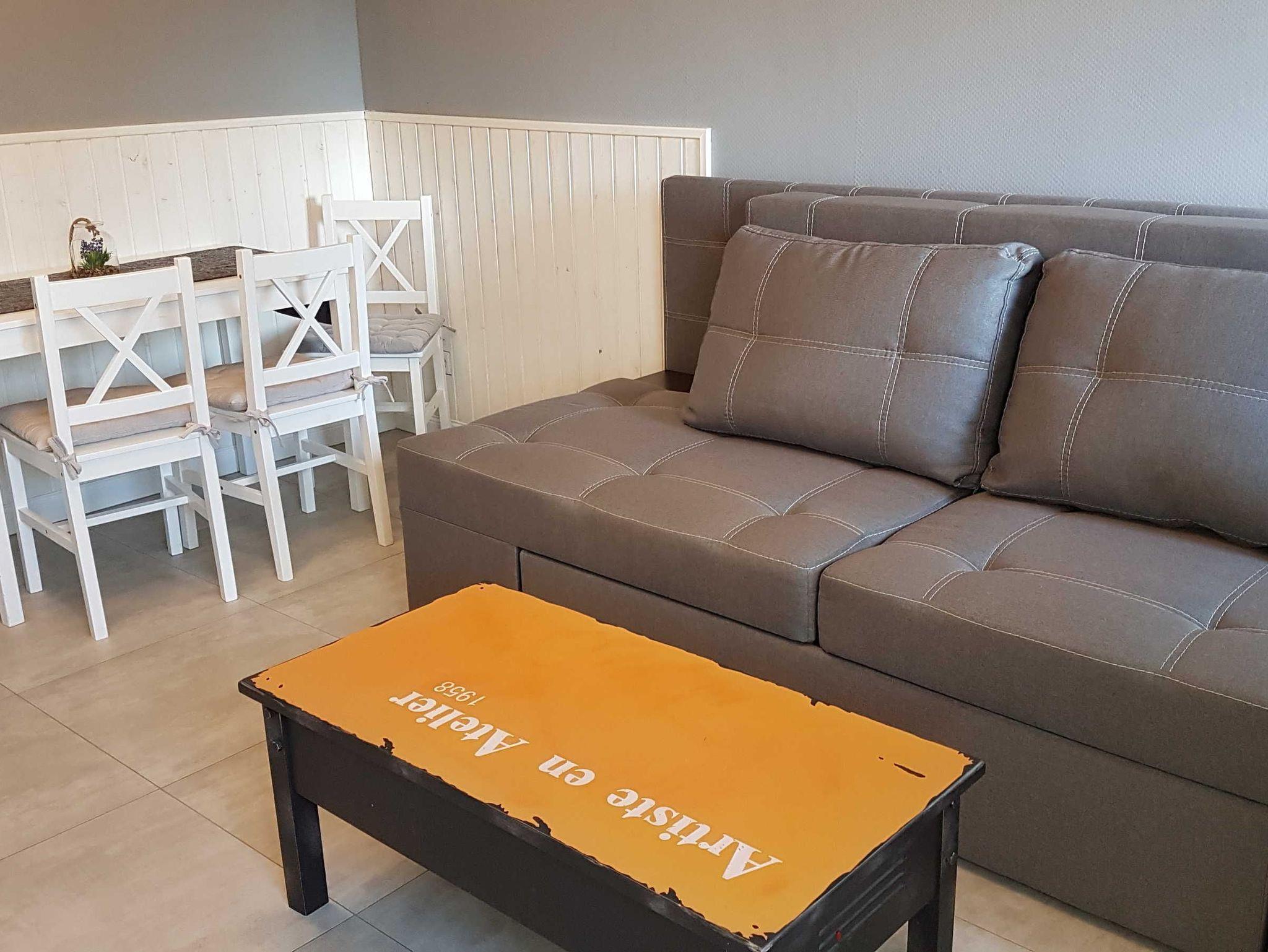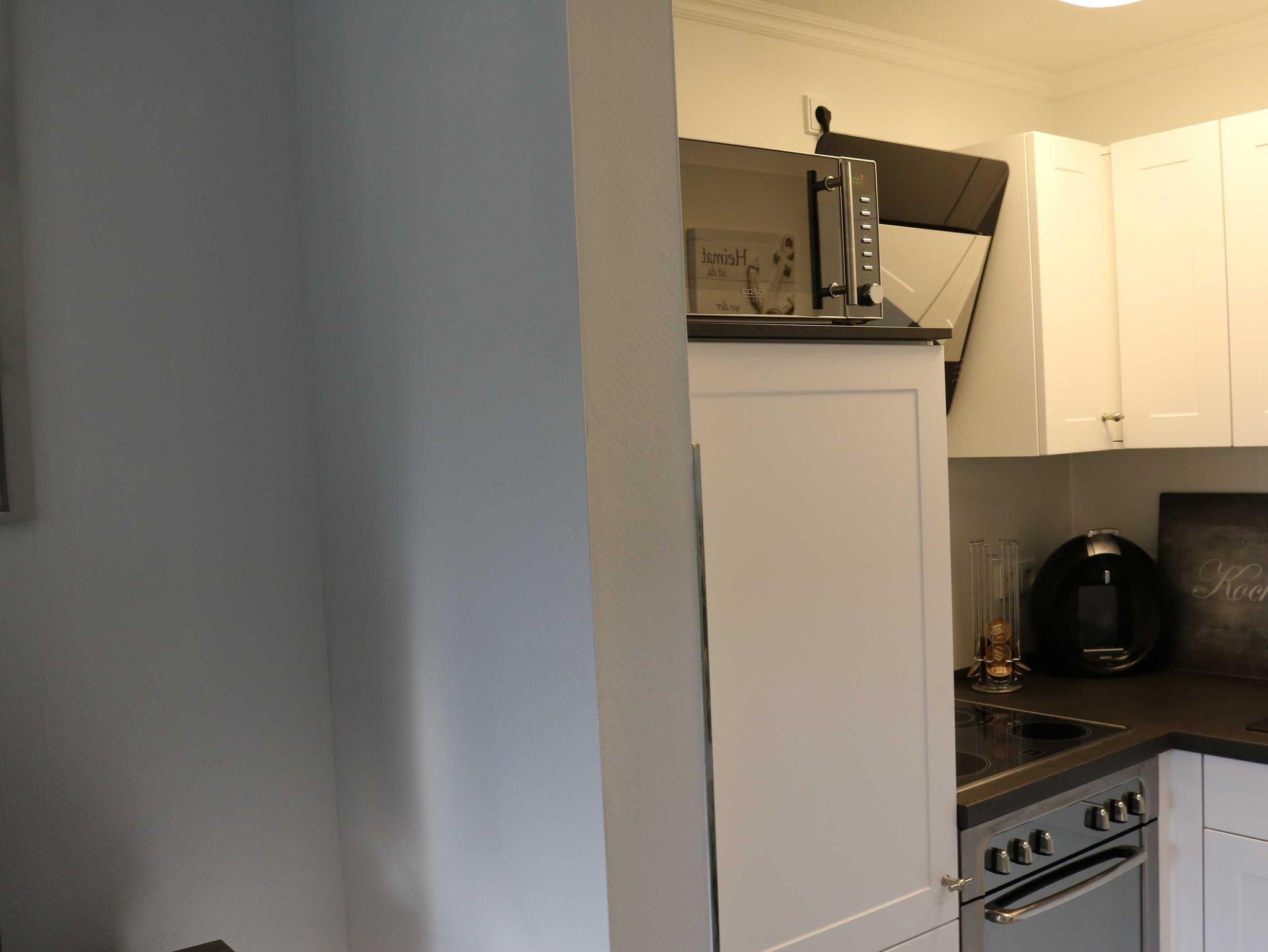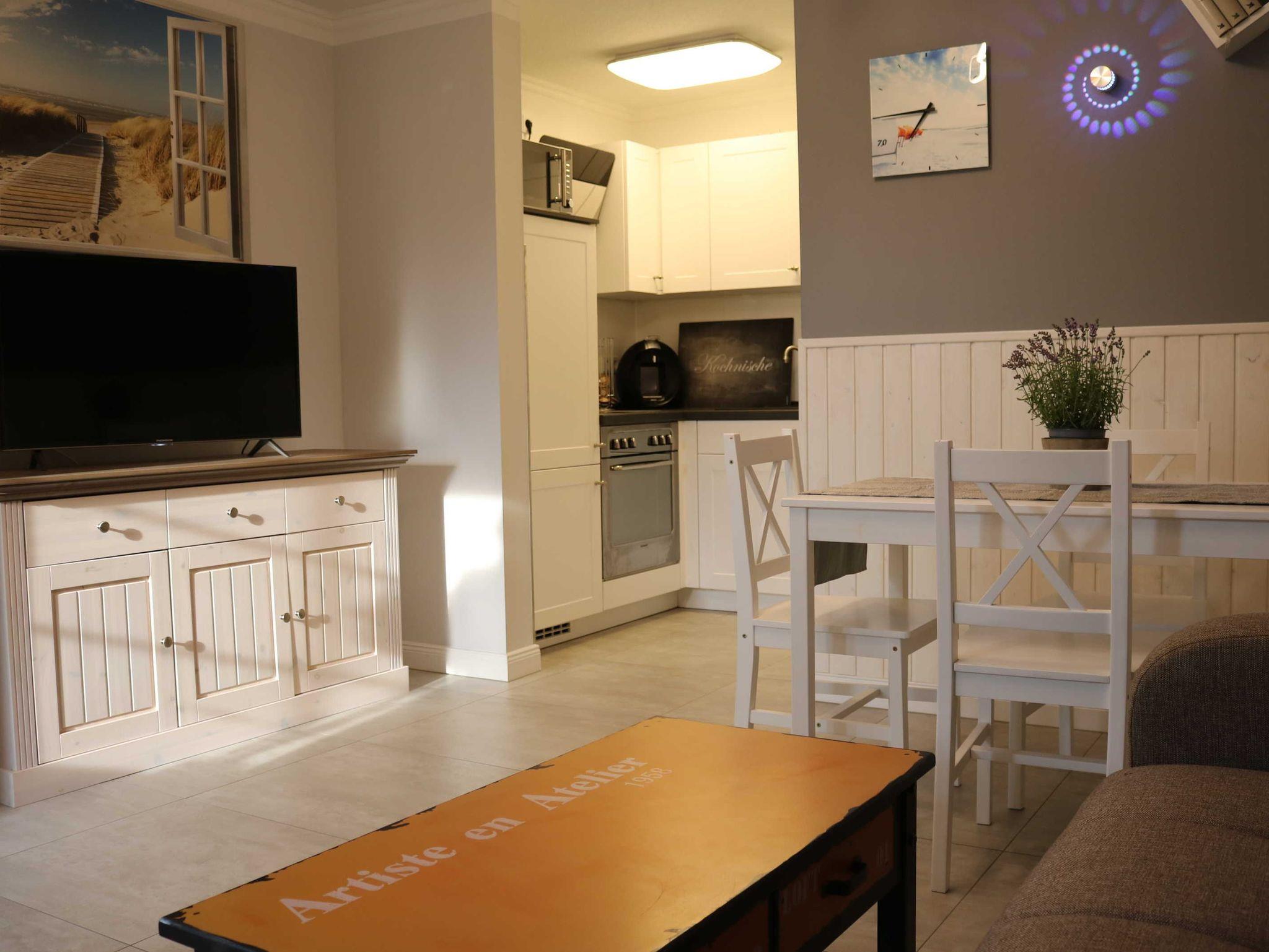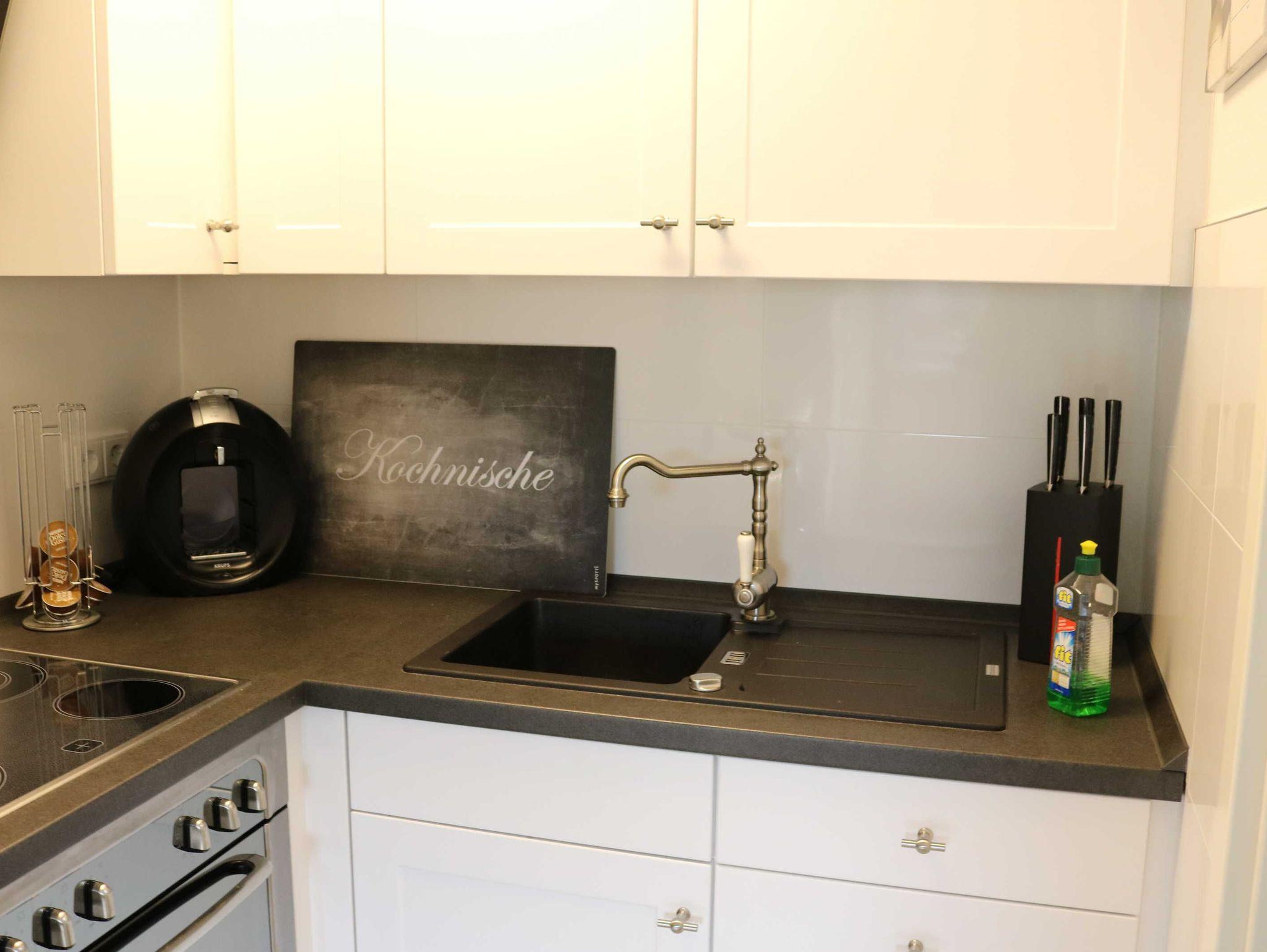 Es erwartet Sie eine kombinierte Wohn-/Schlafküche. Die erstklassig ausgestattete offene Wohnküche bietet alles für ein gemeinsames Frühstück, Mittag- und Abendessen mit der ganzen Familie. Sie ist modern eingerichtet mit Kühlschrank/Gefrierfach, Herd, Ceranfeld, Spüle, Mikrowelle; Kaffeemaschine, Toaster, Wasserkocher, Küchenutensilien sowie mit Tisch und vier Stühle.